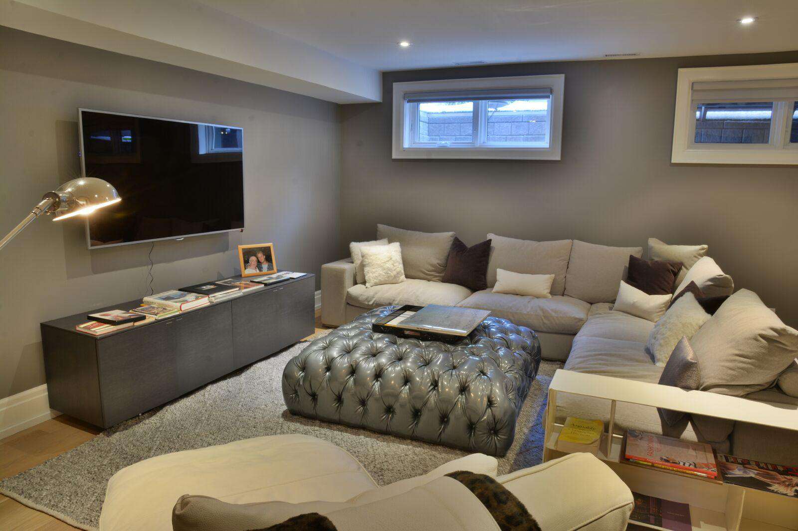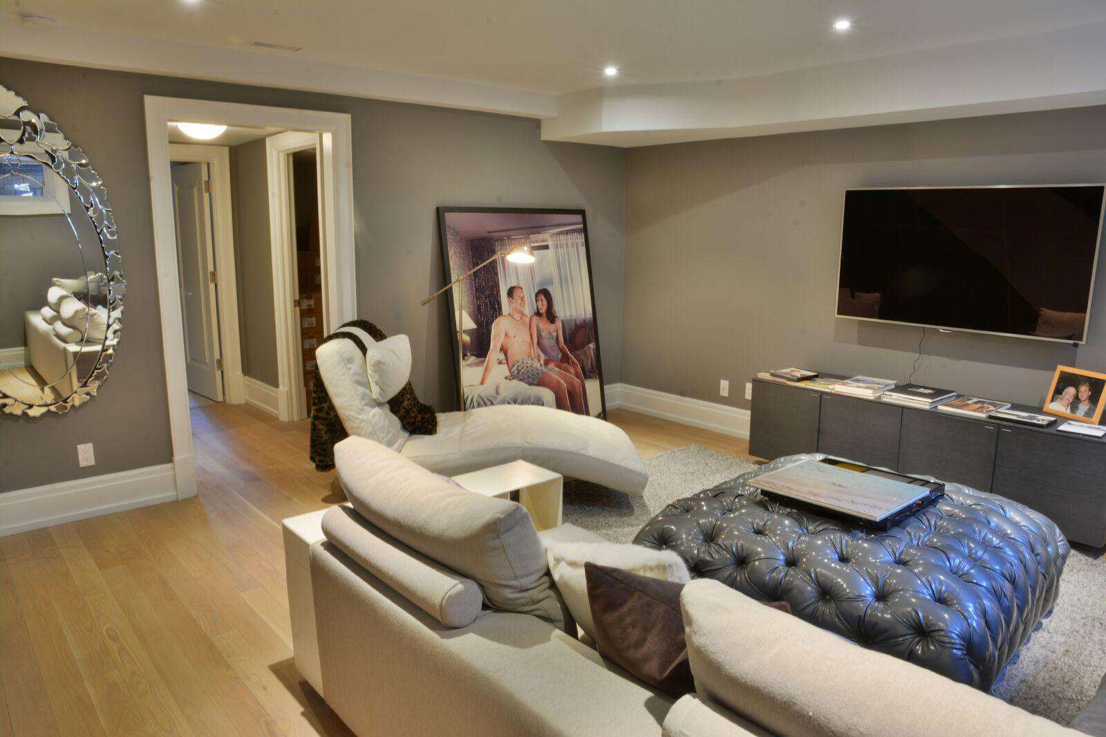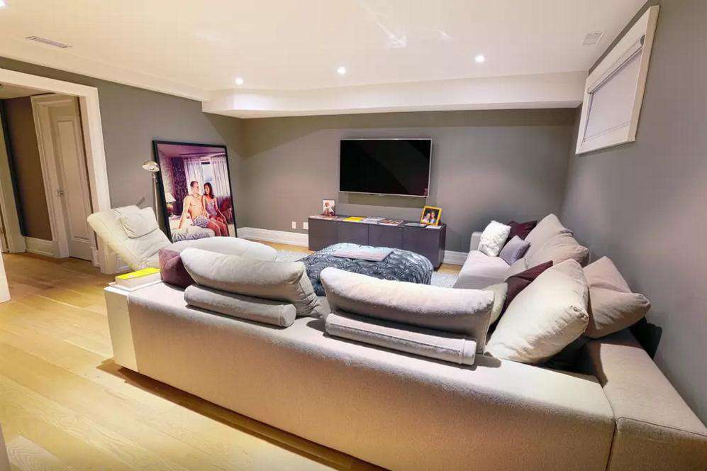 A beautiful and spacious entertainment/media room can be found on the lower level of this home. This space comes equipped with a massive sectional couch, a flat-screen TV, halogen lighting, and a 3-piece bathroom.