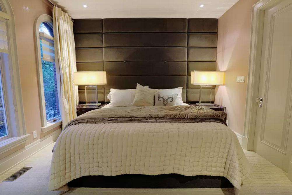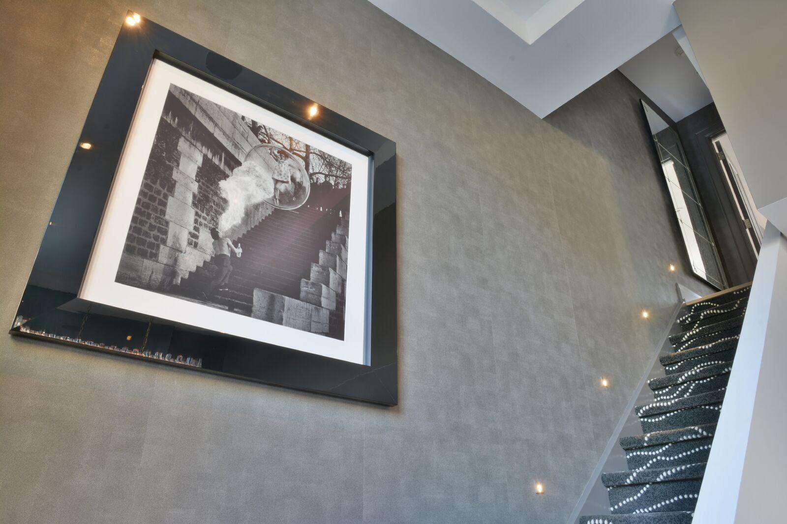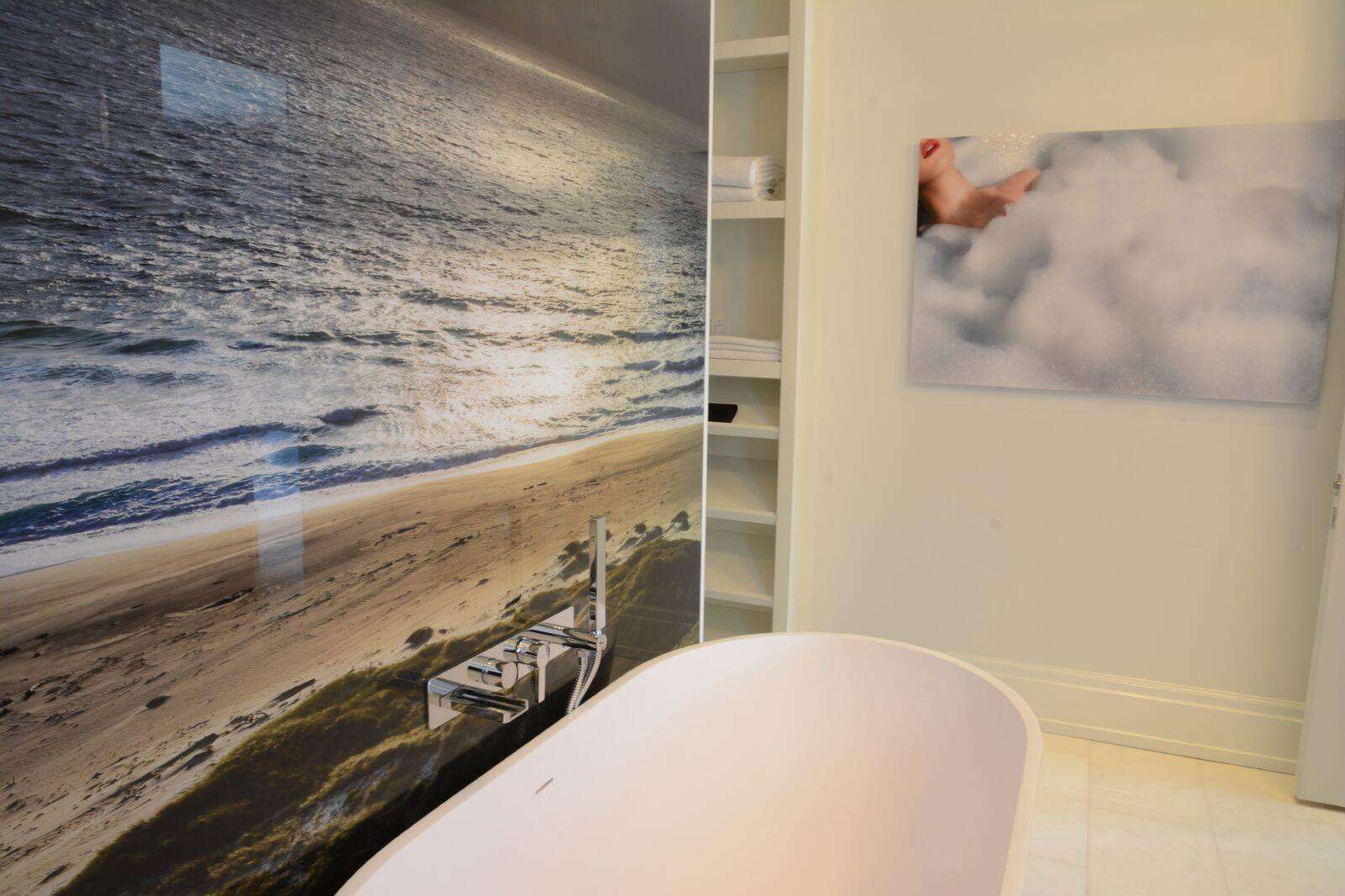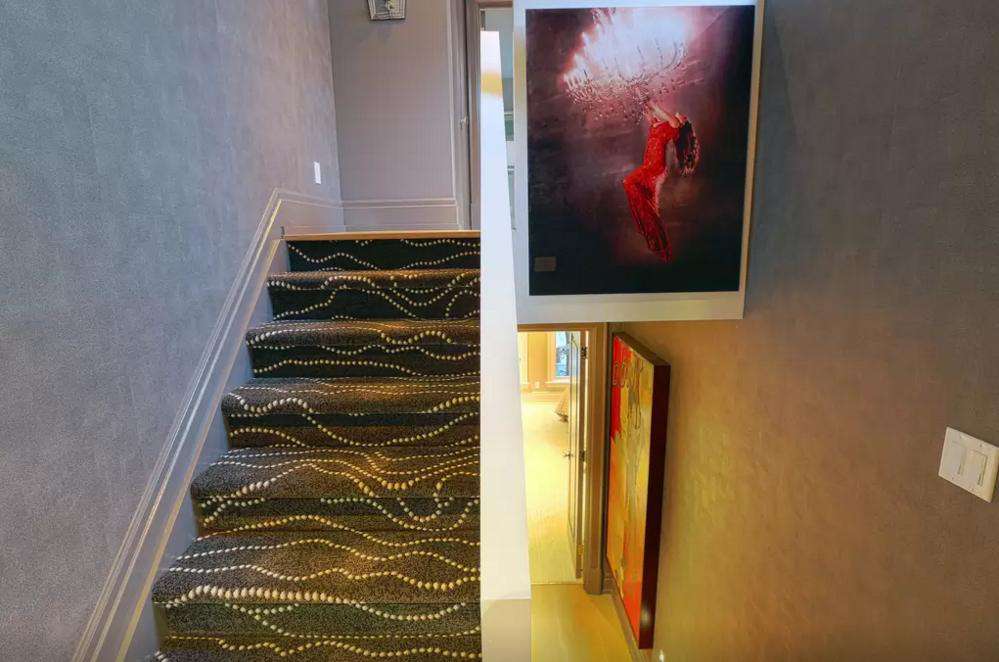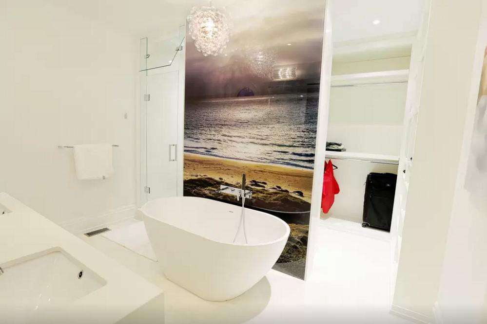 Tasteful black carpets and floor lights line the staircase leading up to the second floor, where guests will find the spacious and bright King size primary bedroom w/ adjoining 5-piece ensuite bathroom with massive beautiful photography perfectly placed on the bathroom wall behind the claw-shaped tub and bedroom wall.