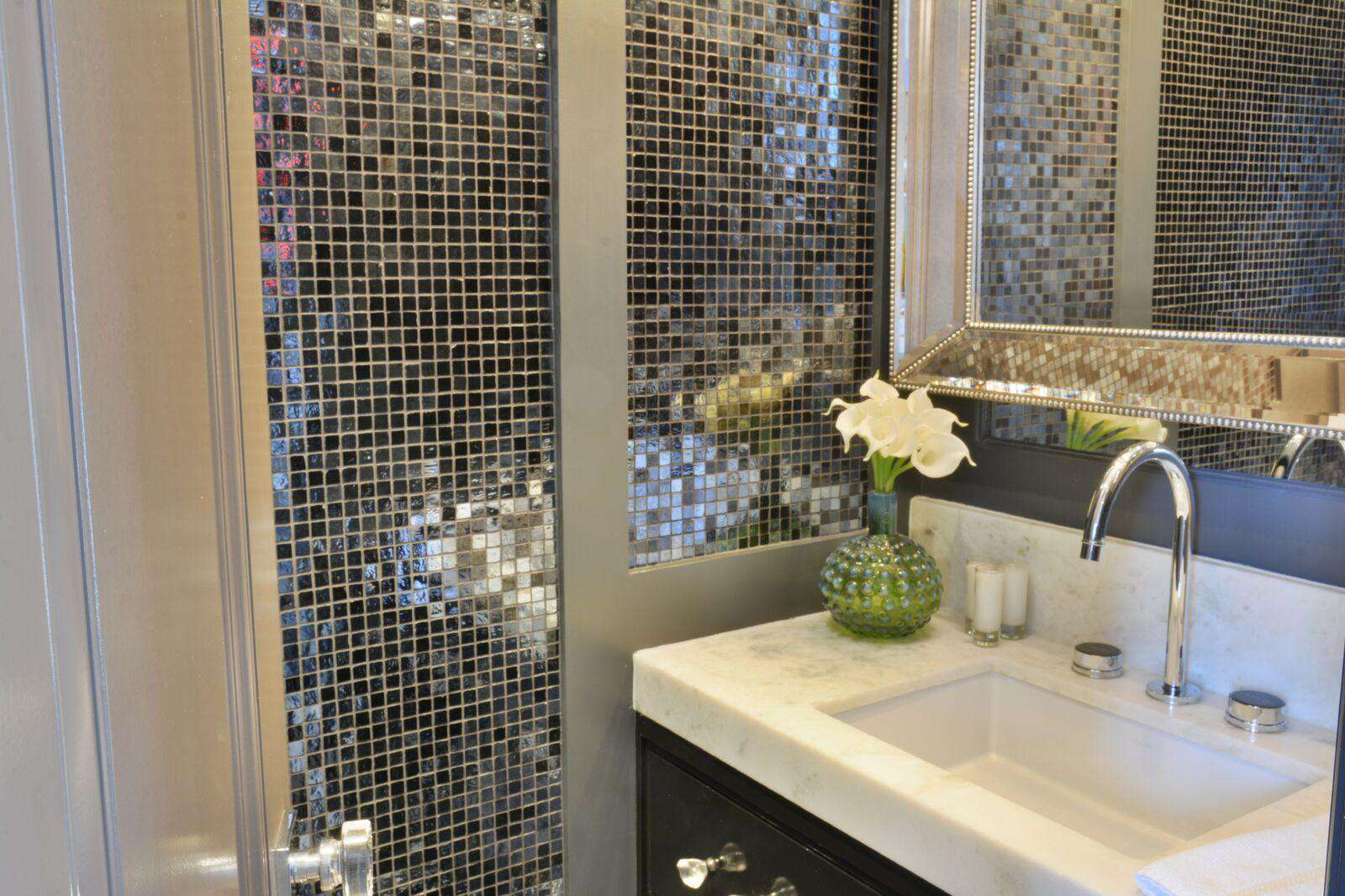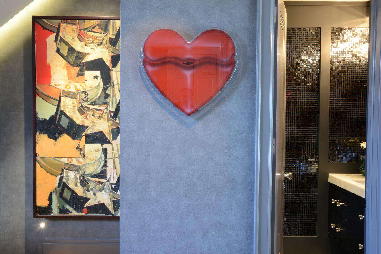 This chic, urban oasis is adorned with dark textured wallpapers, stunning mother-of-pearl mosaic wall tiles, and accessories collected from around the world. The artist's work embellishes the home's decor. Some of it has even been built right into the walls!