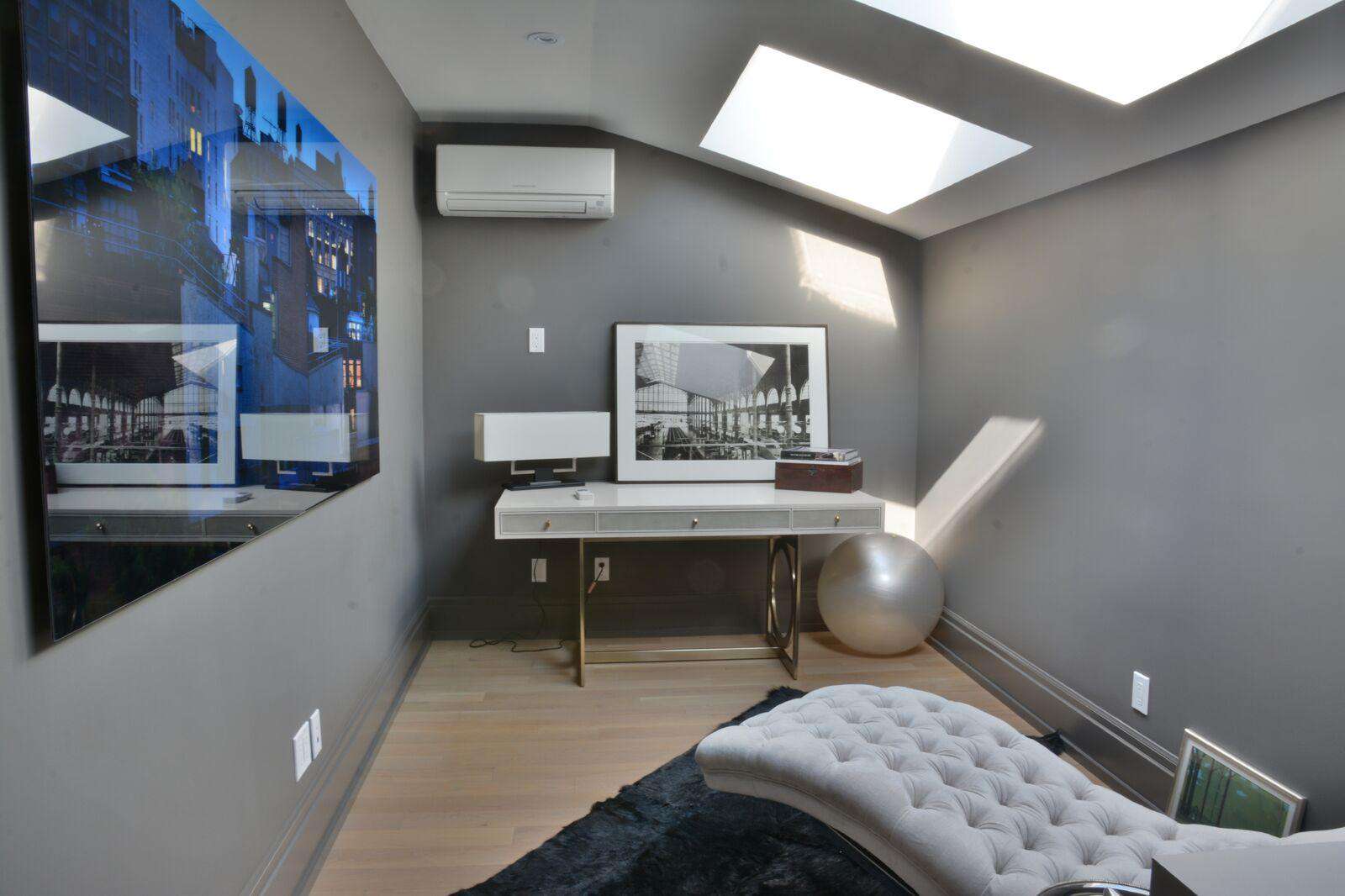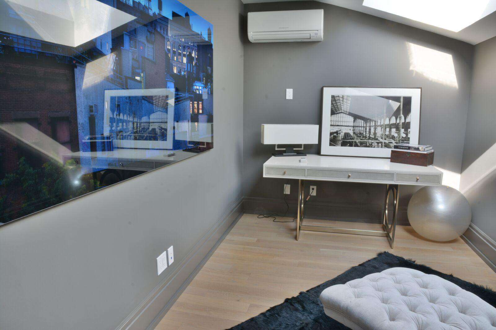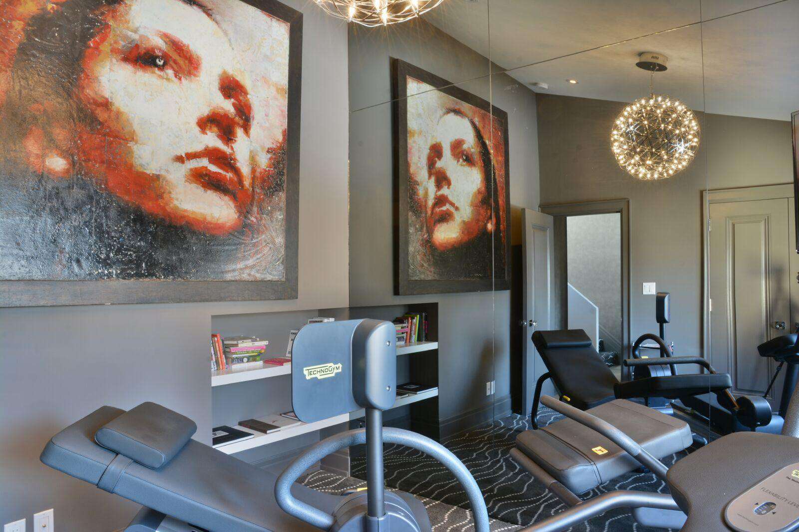 There is another 3-piece bathroom located on the 2nd floor, as well as a spacious fitness center, which features a wall of mirrors, a flat-screen TV, and various exercise/stretching equipment and thought provoking artwork by the owner himself line the walls.