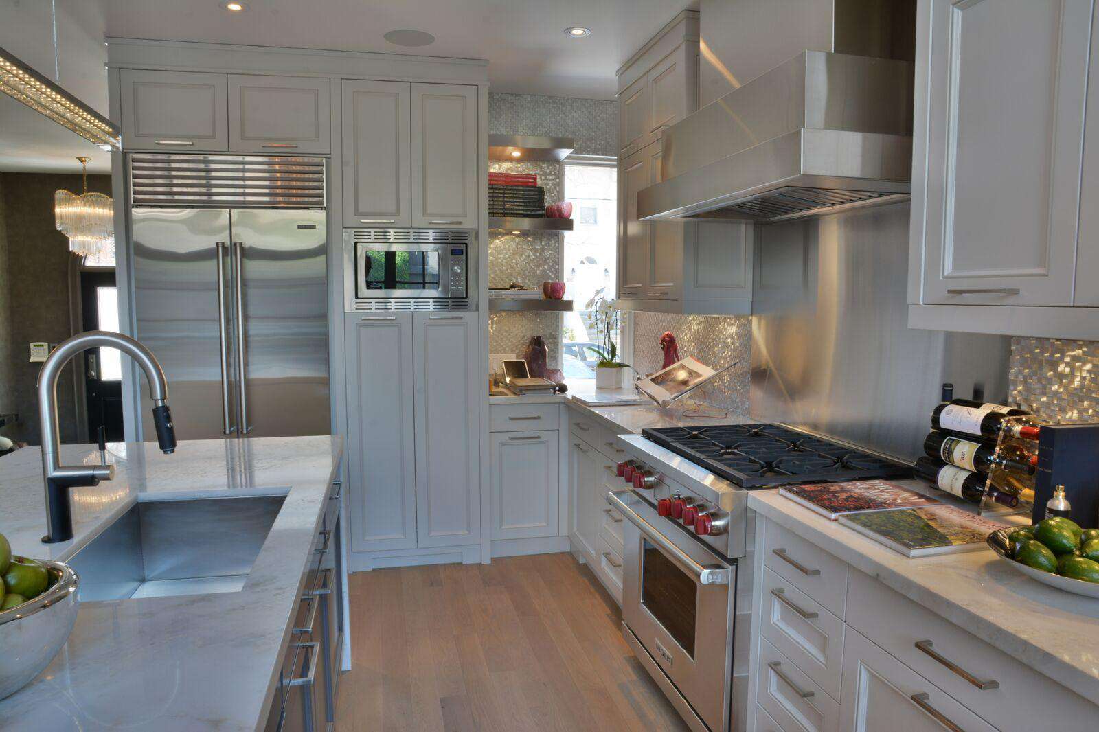 Continue down the hallway to the kitchen/ living area and guests will find a large marble kitchen island with 3 stools, high-end stainless steel appliances, a double-door fridge, and a built-in microwave.