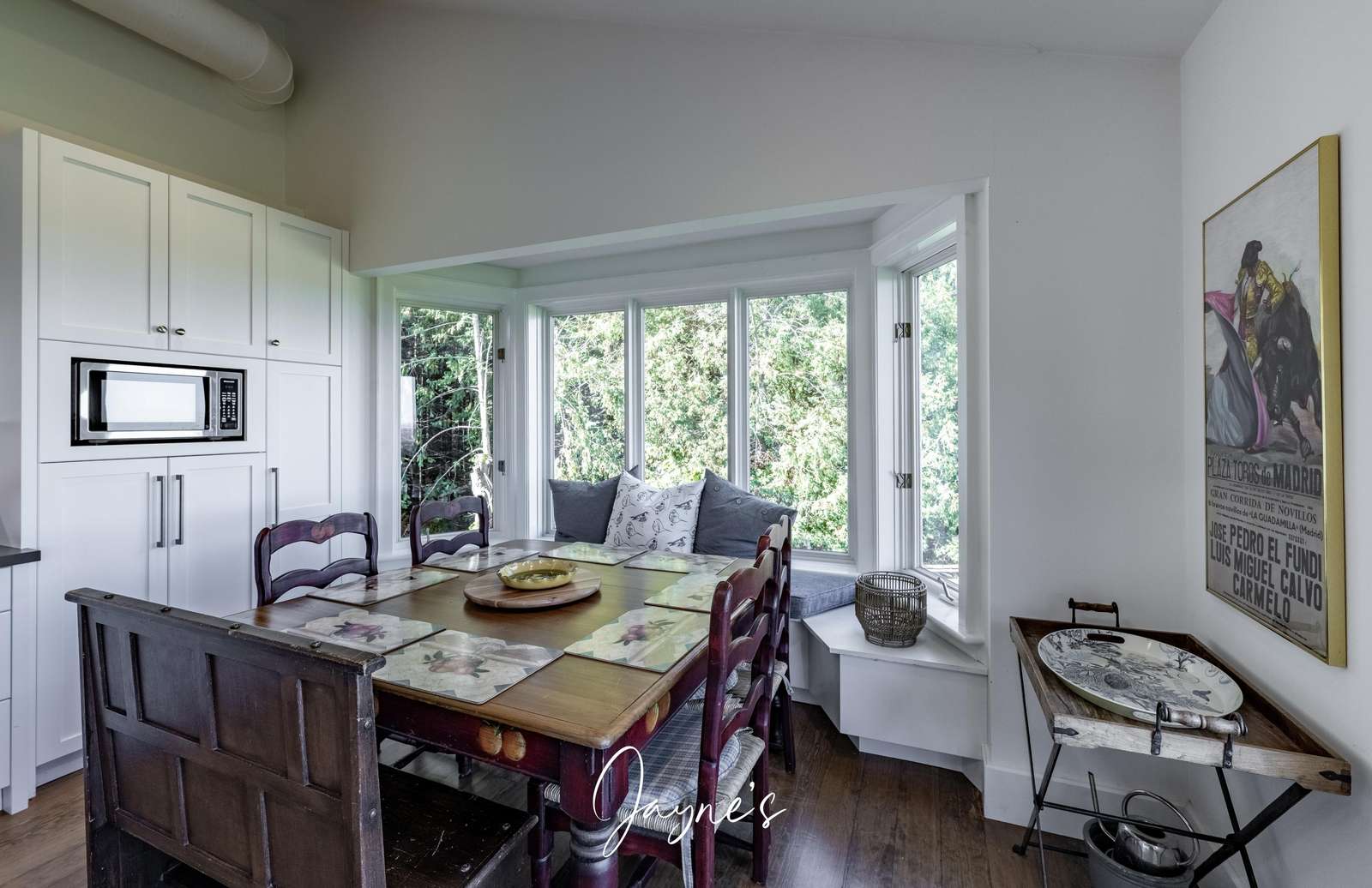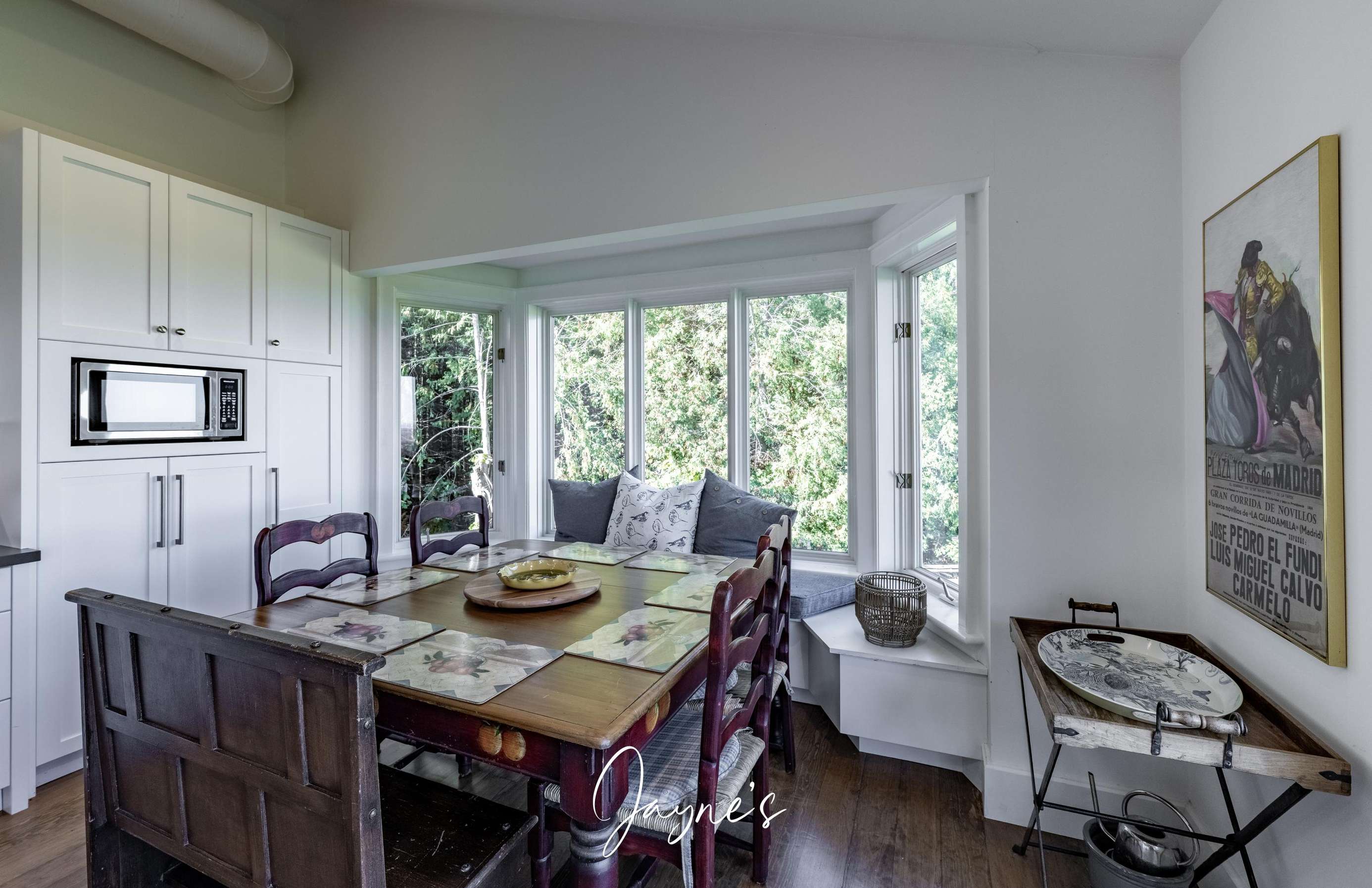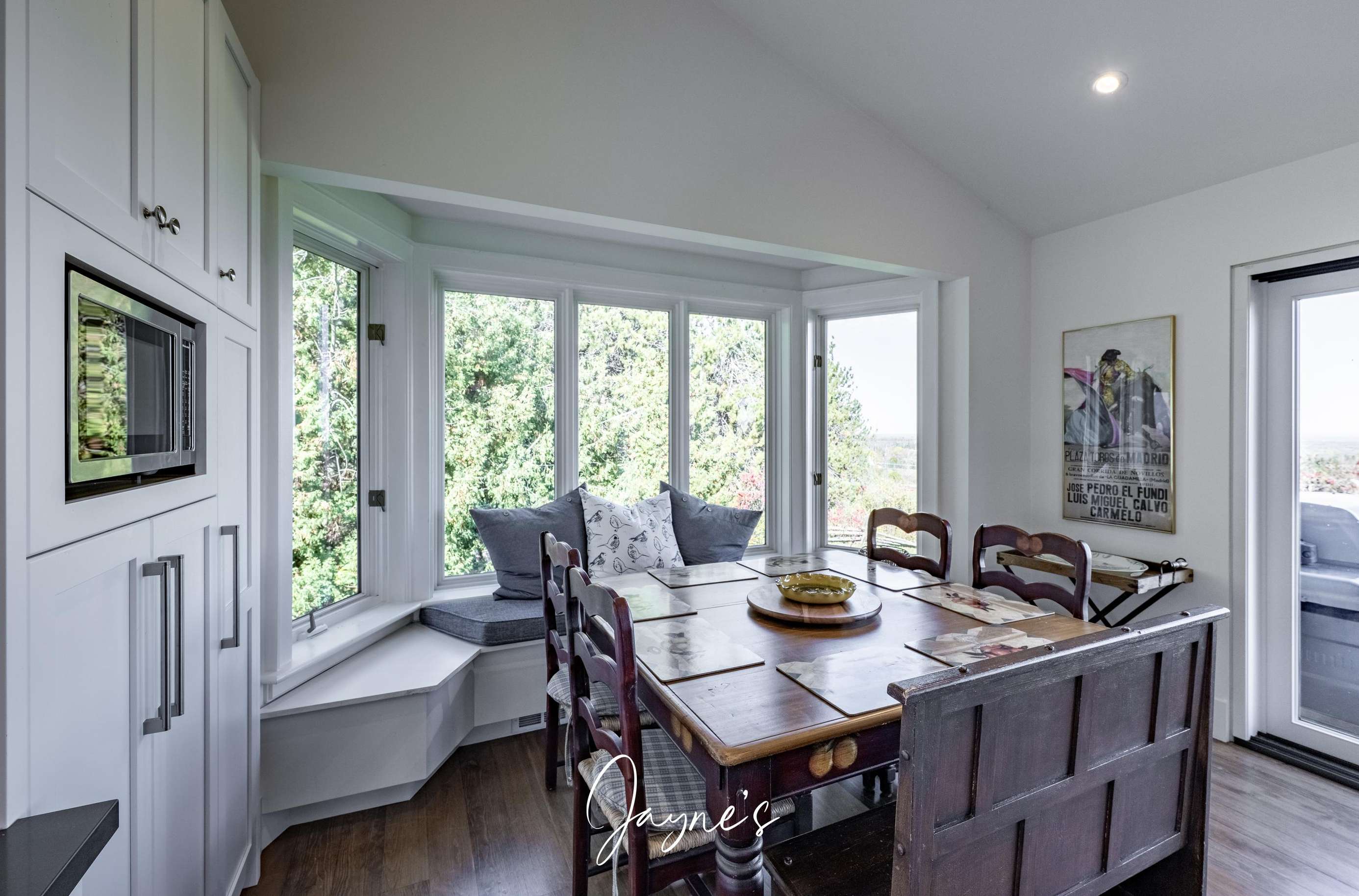 High-end appliances, island with seating for 5 and table with seating for 6 opening onto the deck with its barbeque.