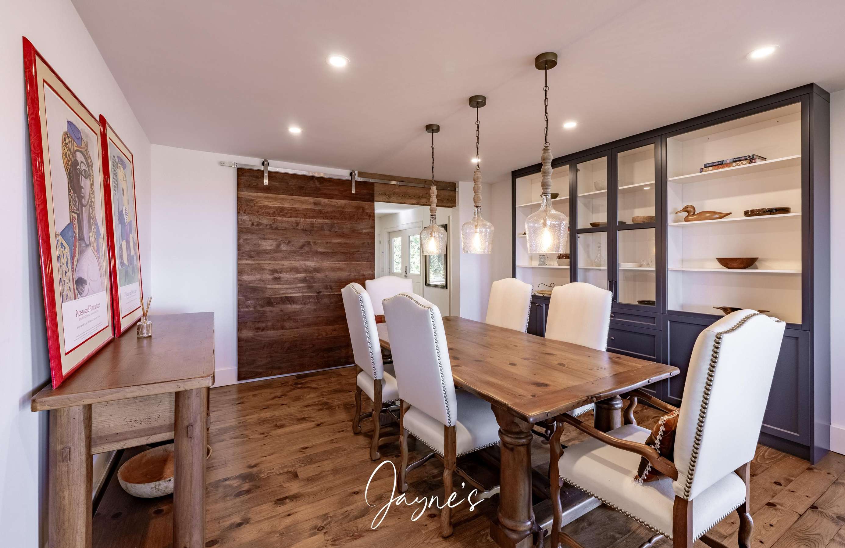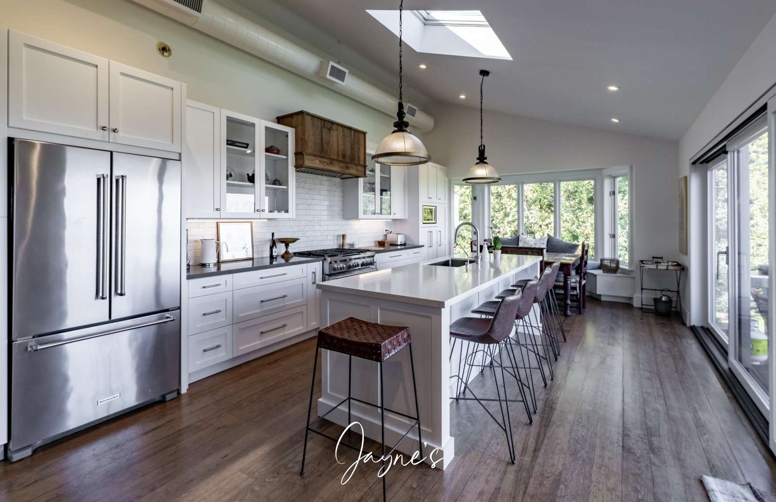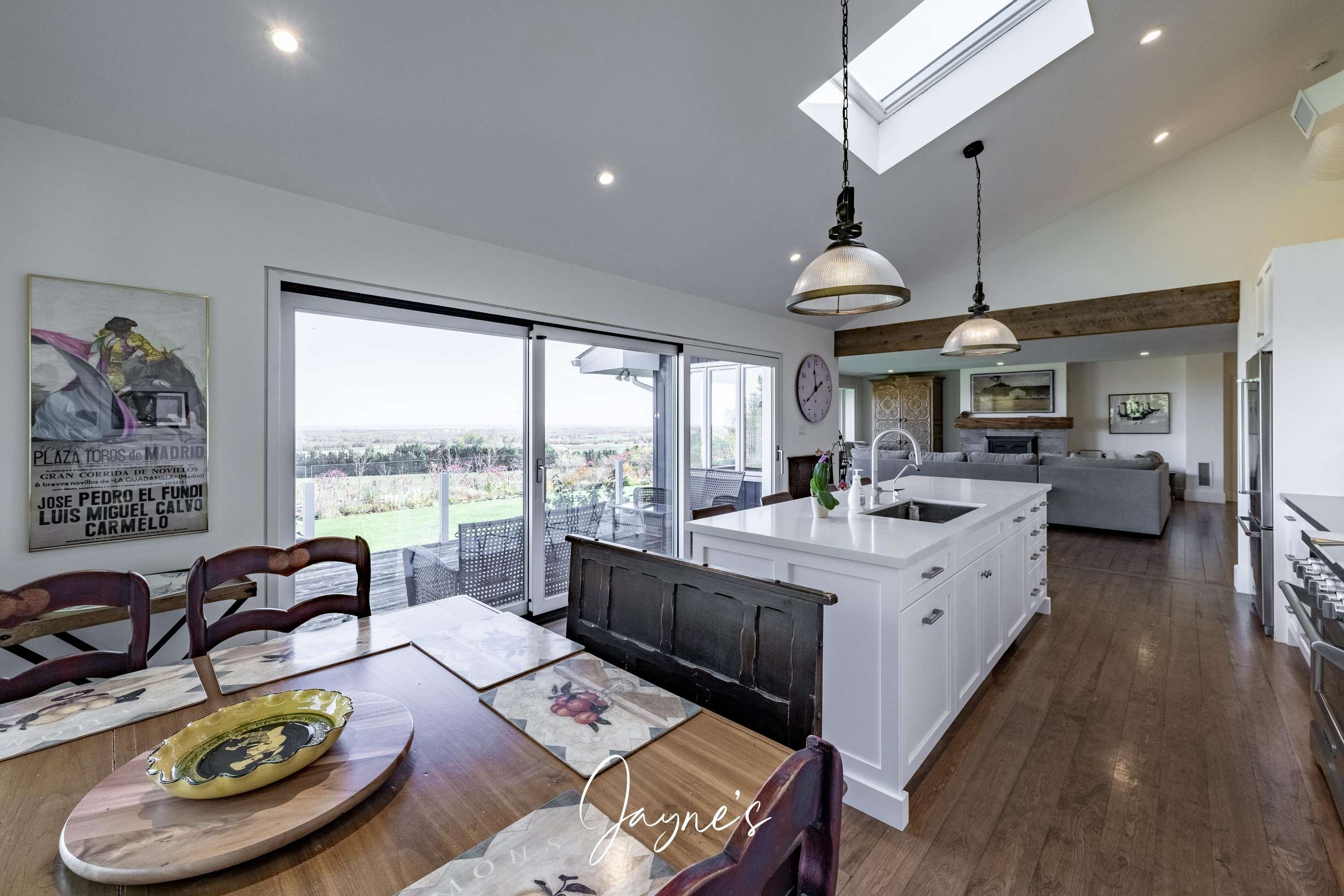 High-end appliances, island with seating for 5 and table with seating for 6 opening onto the deck with its barbeque.