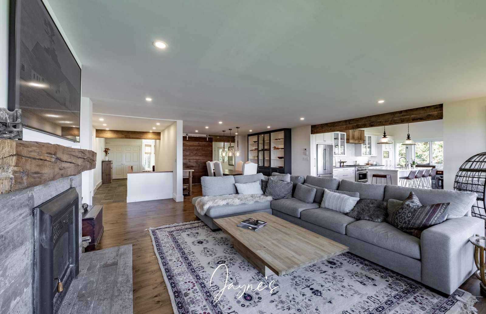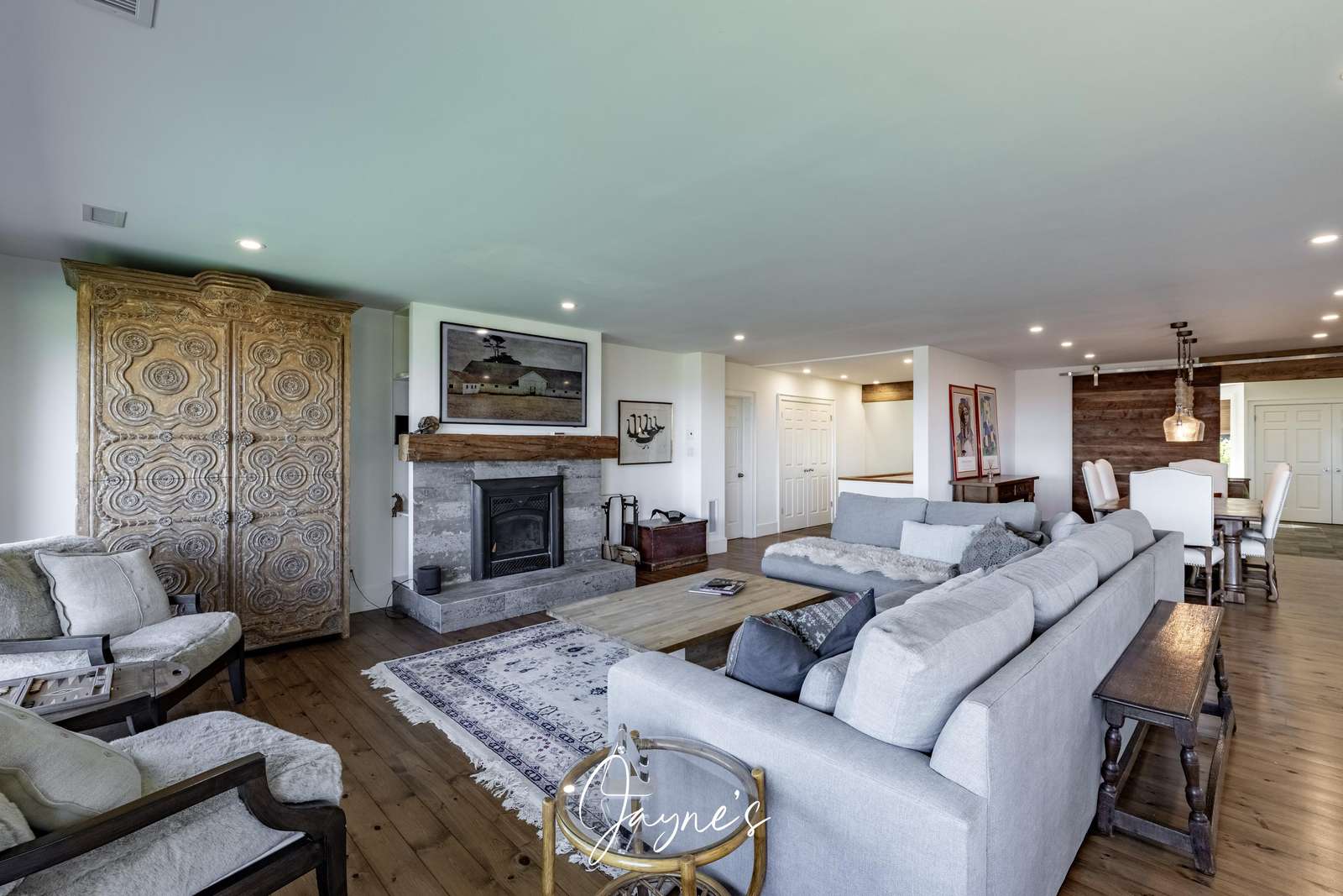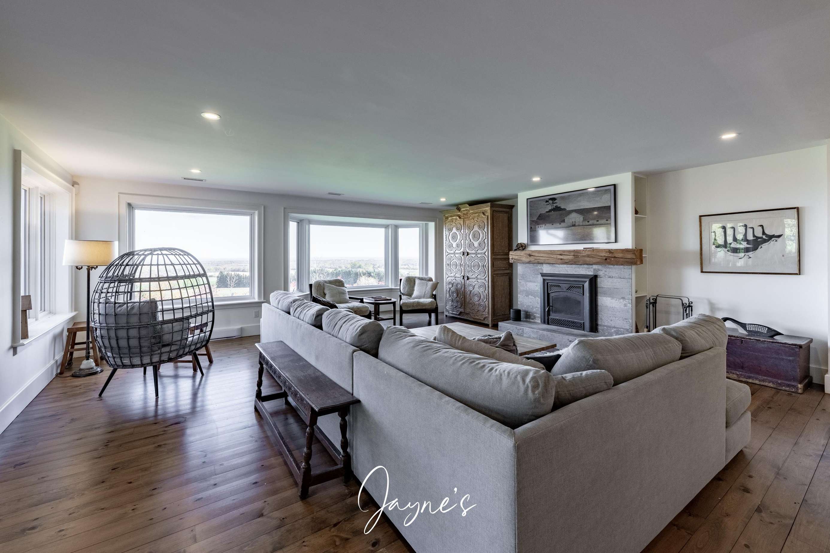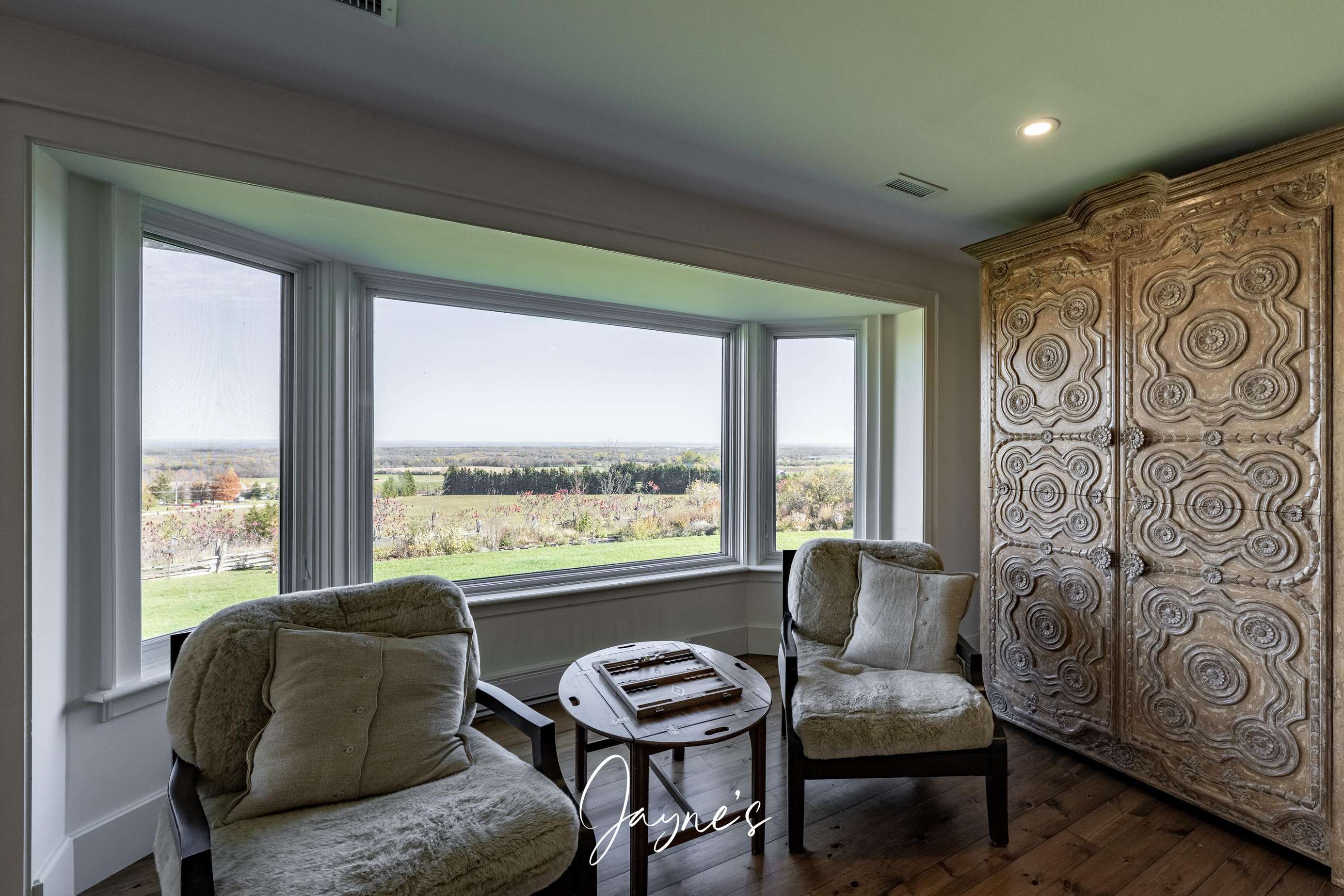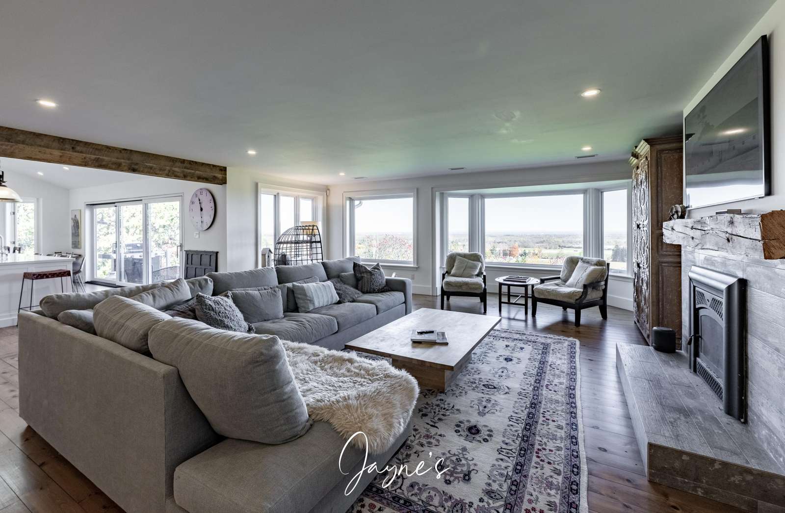 Large sectional sofa, chairs, wood burning fireplace and Frame TV. Large windows look out over the countryside and southern Georgian Bay.