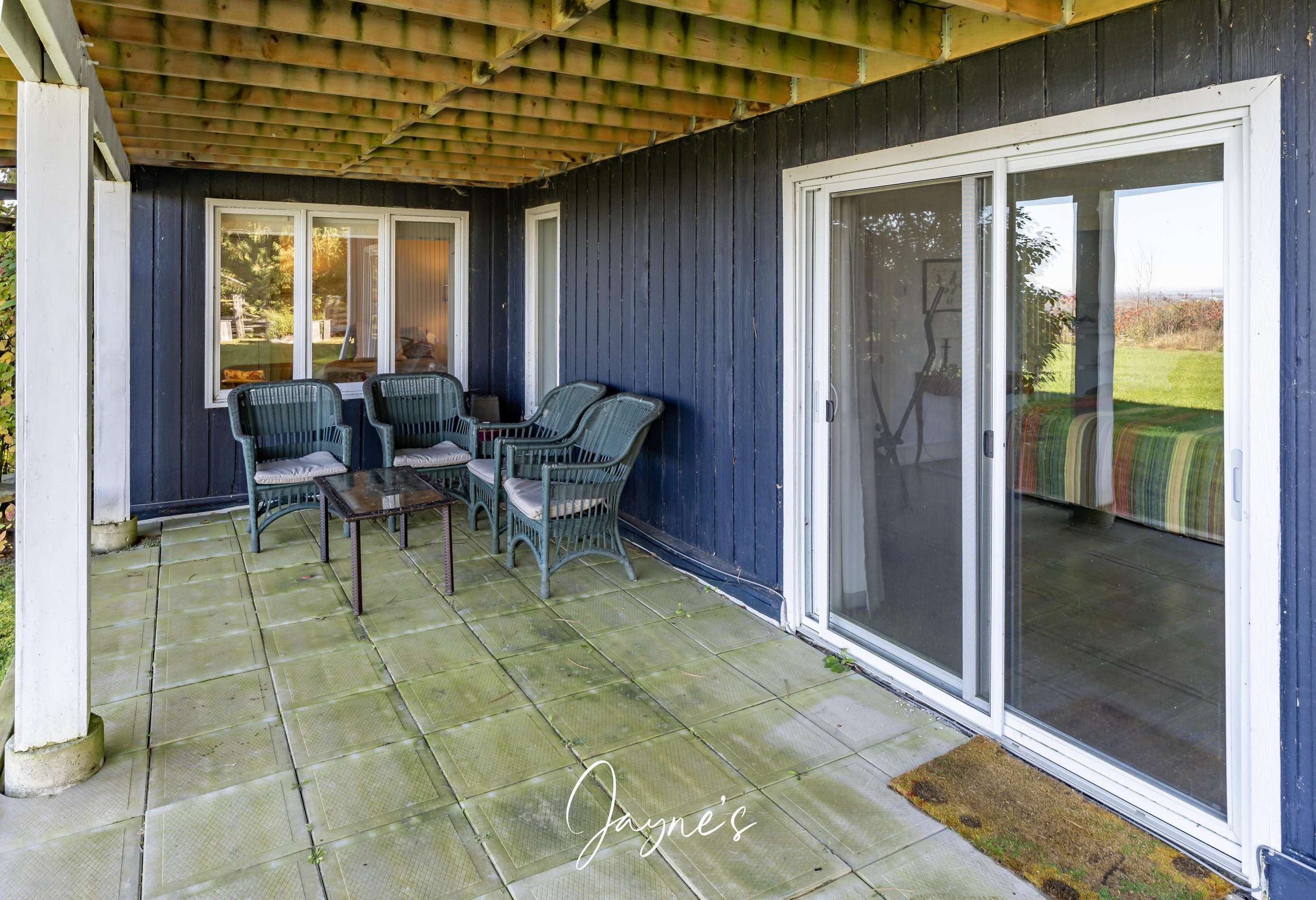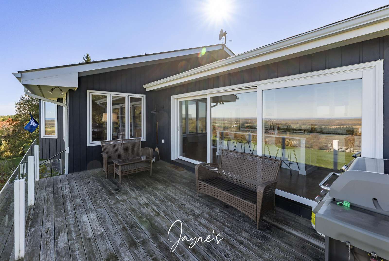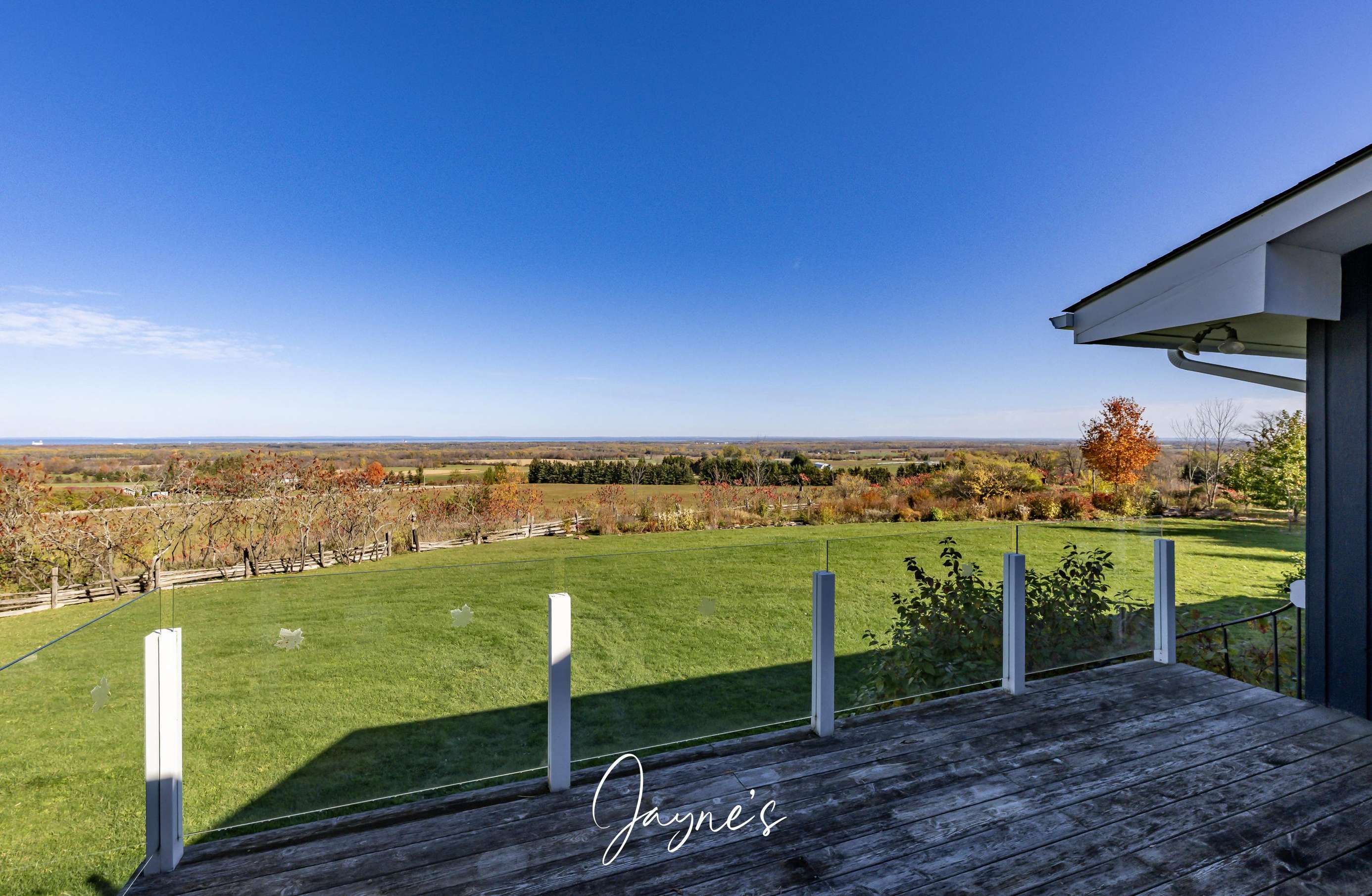 Panoramic views of the countryside with its forests and fields down to the edge of southern Georgian Bay. Enjoy unobstructed vistas from the great room, main level deck and lower level patio. This property is semi-detached but has the feel of a single family home with an older couple living in the adjoining home.