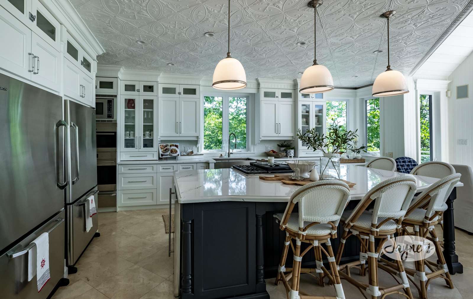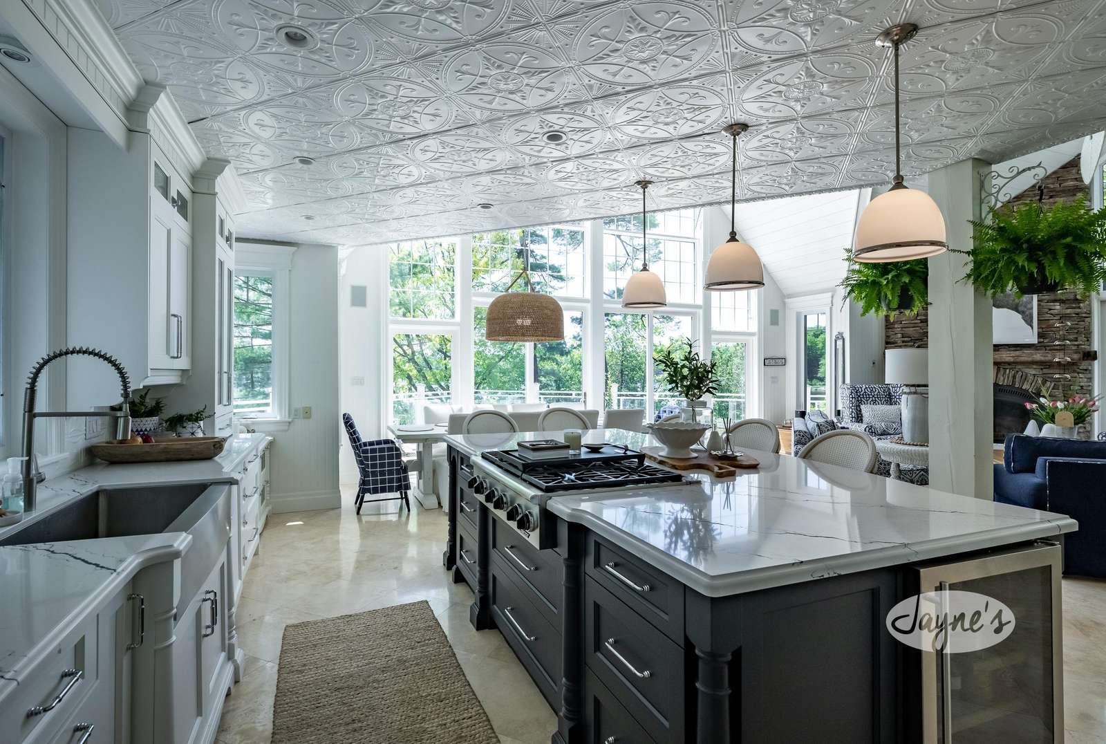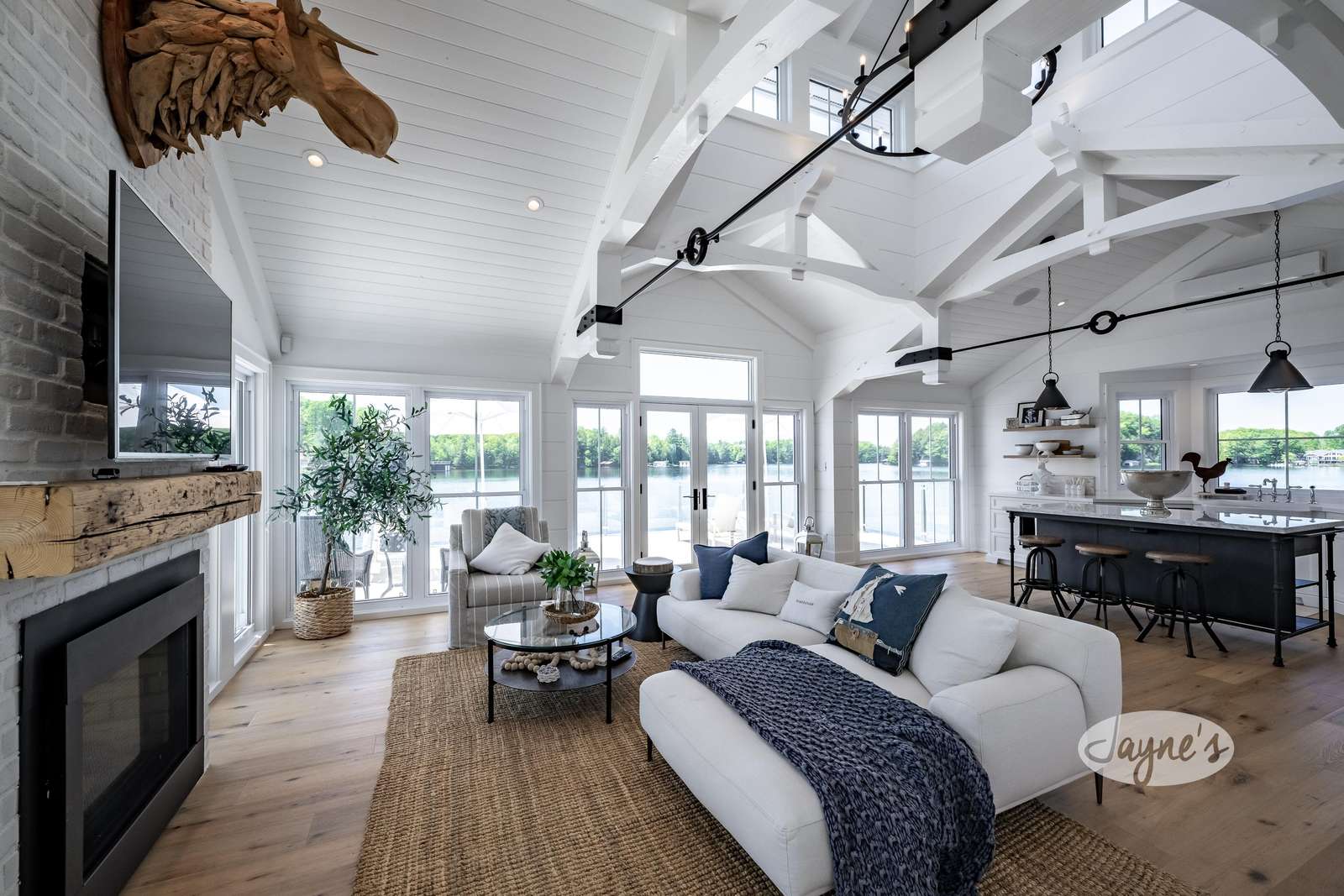 Upper boathouse with seating area, TV, gas fireplace, island with breakfast nook, sink and half dishwasher