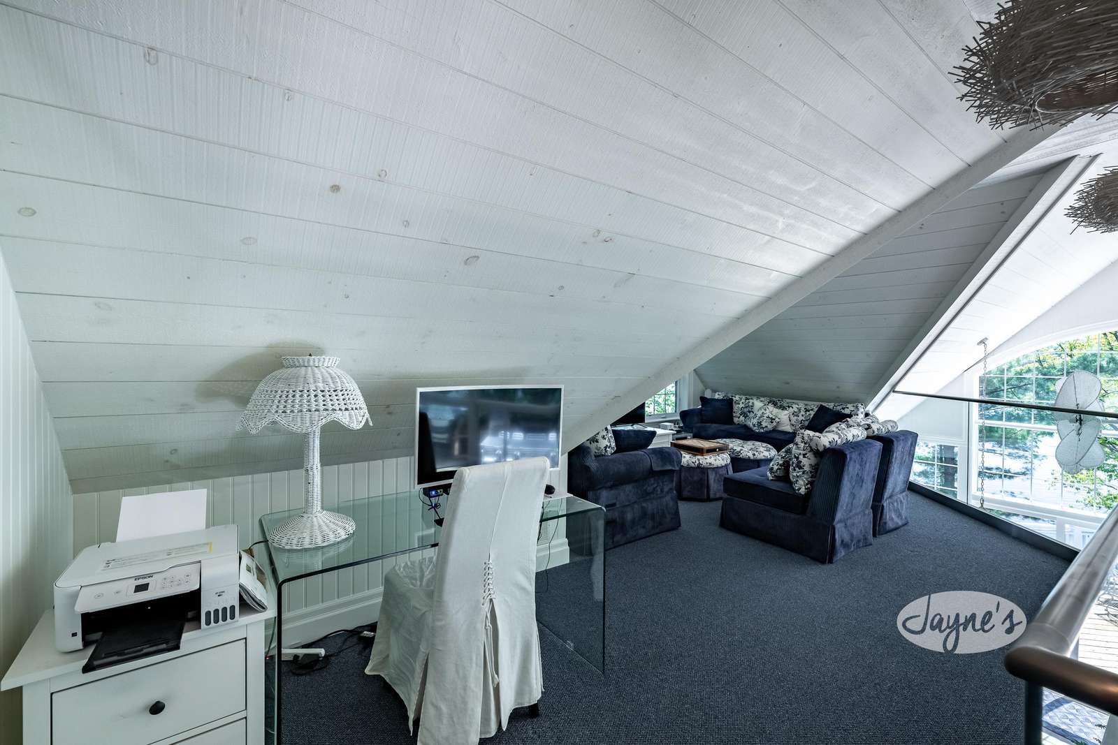 Loft area with TV, sitting area desk and glass railings overlooking great room