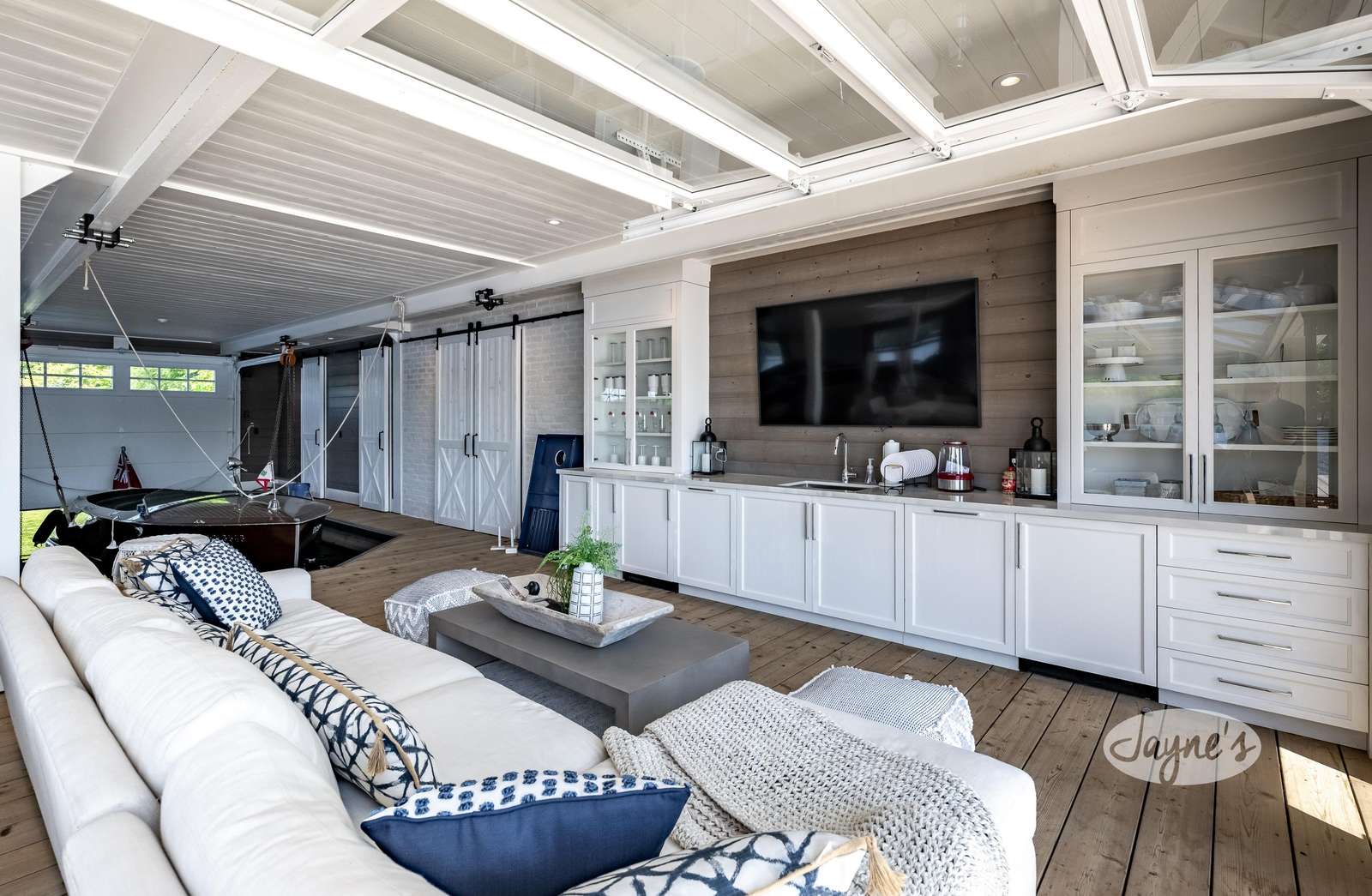Lower boathouse with interior boat slip, seating area, sink and dishwasher