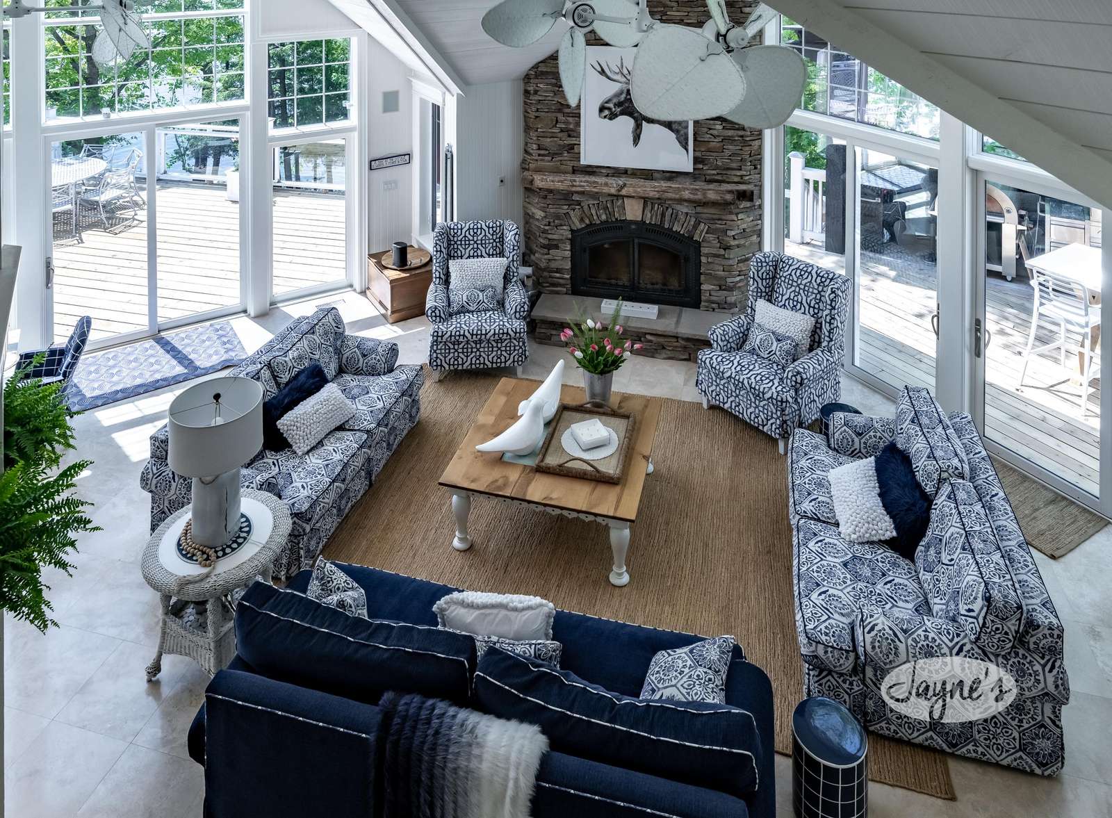 Open concept spacious room, fireplace, TV, floor to ceiling windows, sofa, 2 loveseats, 2 chairs