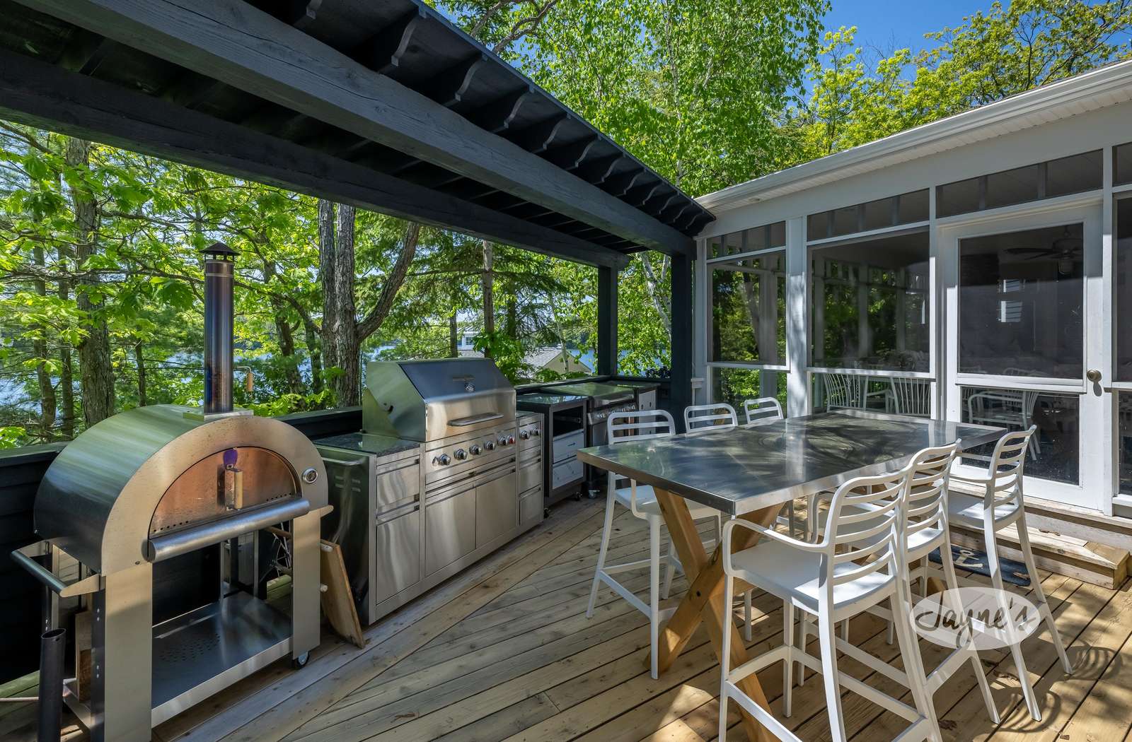 Walk out to the deck and outdoor kitchen (bbq, pizza oven) table for 6, seating area and fireplace
