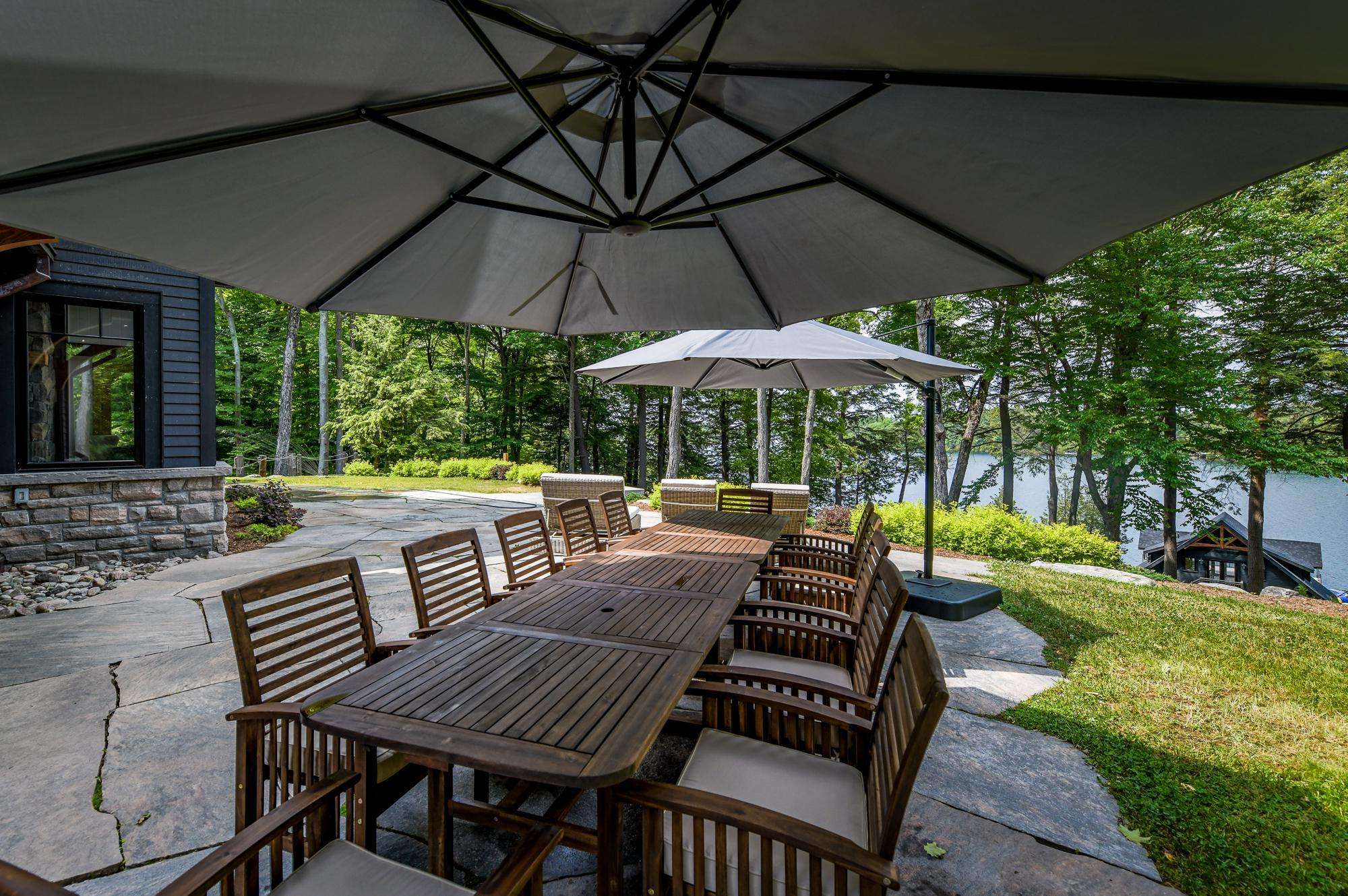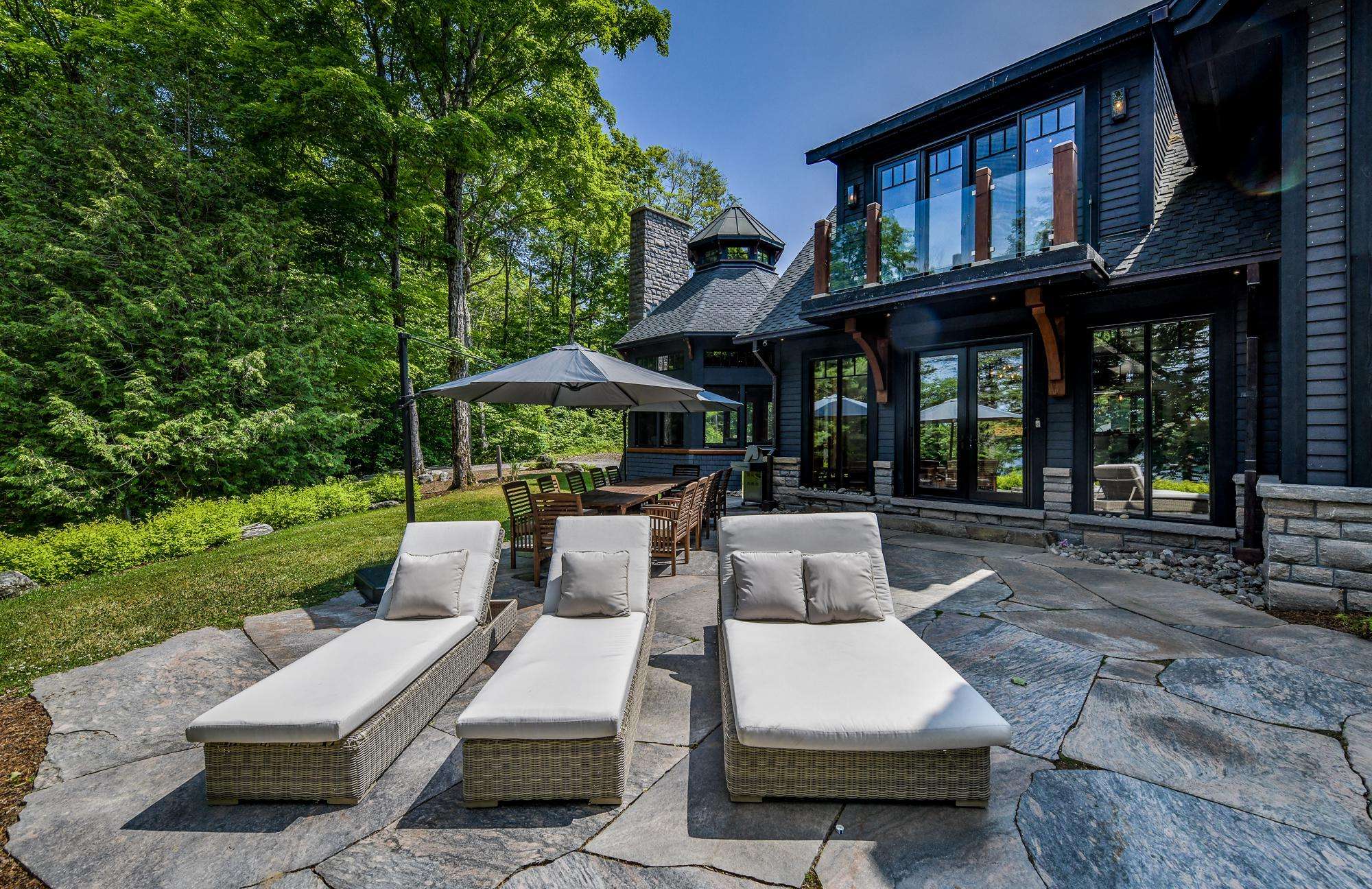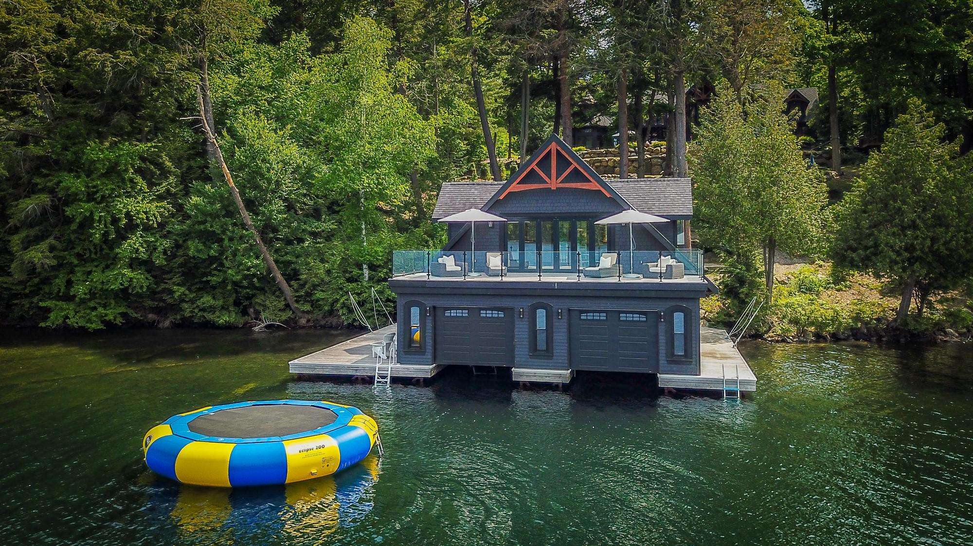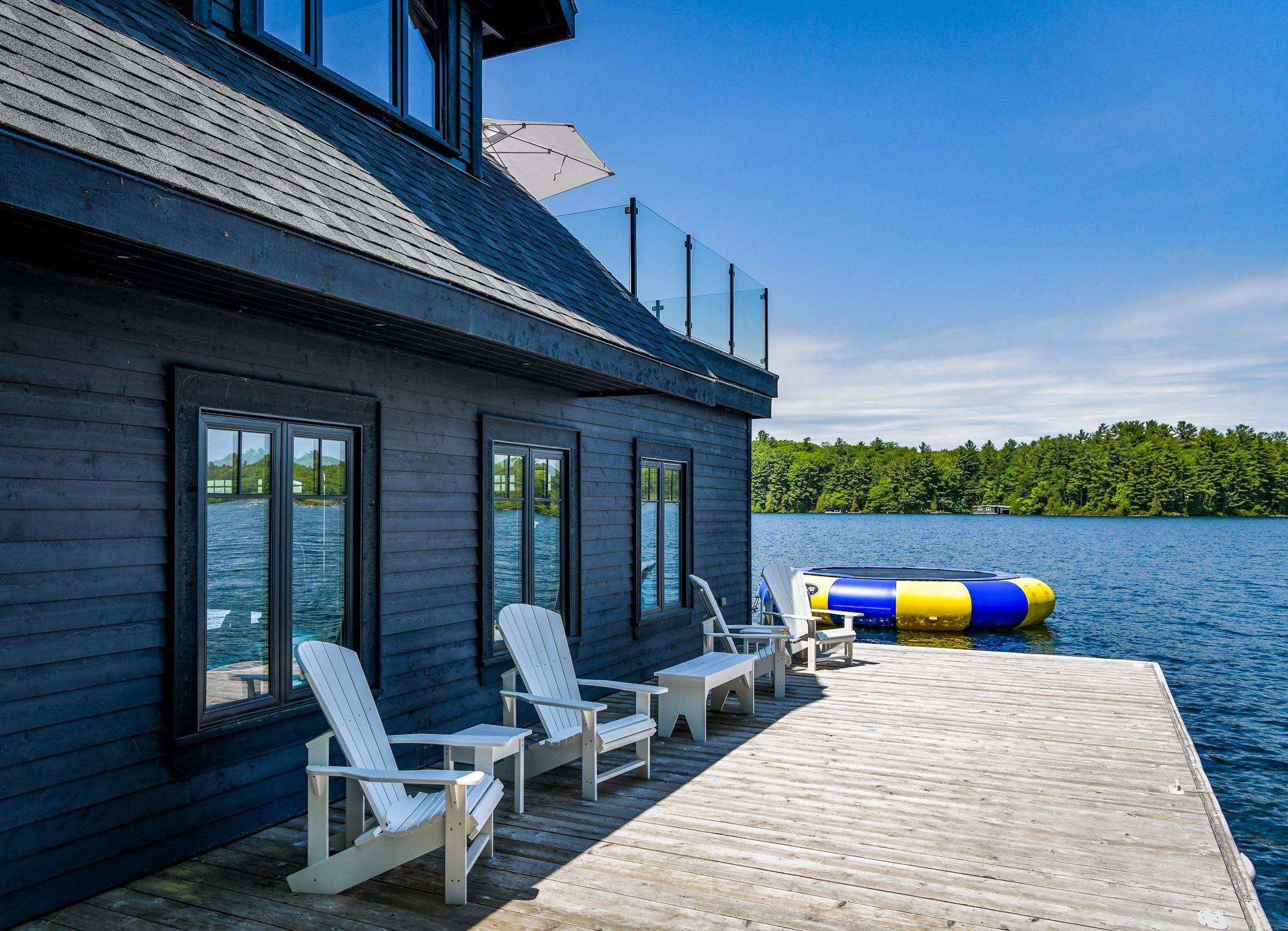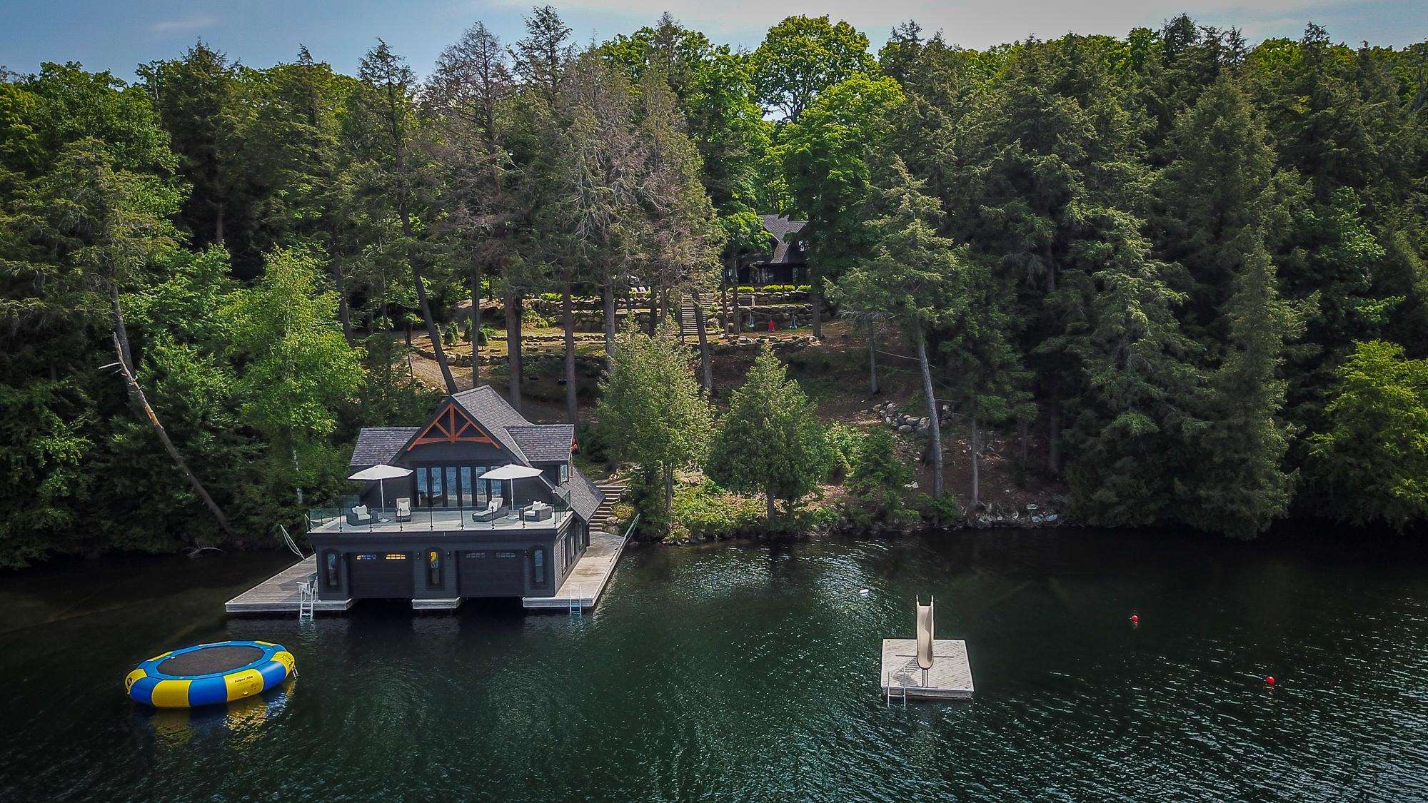 LAKE JOE CHATEAU - A beautiful drive through the woods brings you to the roundabout driveway that encircles the front yard. A grand entrance with timber beams welcomes you into the cottage. Around back, a romantic dining area for 6 with two umbrellas and a BBQ provide the perfect place to enjoy lunch! Also featured are three loungers and a hot tub overlooking the cascading stone stair case. On the left, 3 kid pod hammock chairs offer a fun place to swing in the summer breeze. A fire pit with stone seating for 6 is the perfect place to roast marshmallows as the sun goes down! Further down on the right, 3 tire swings invite you swing on while soaking in the view! At the water's edge, a beautiful boathouse and dock boast plenty of outdoor furniture and clear glass railings to enjoy the beautiful Lake Joseph view! Fully enjoy this tremendous 12 acre property by walking the trails that run from the highway to the water and feature a river flowing through!