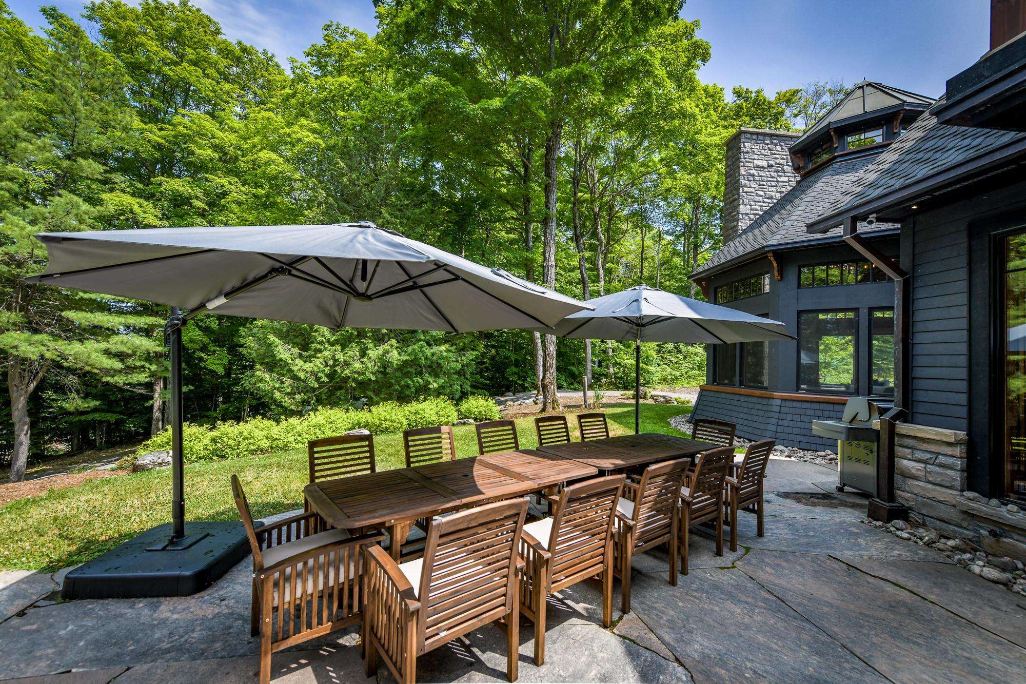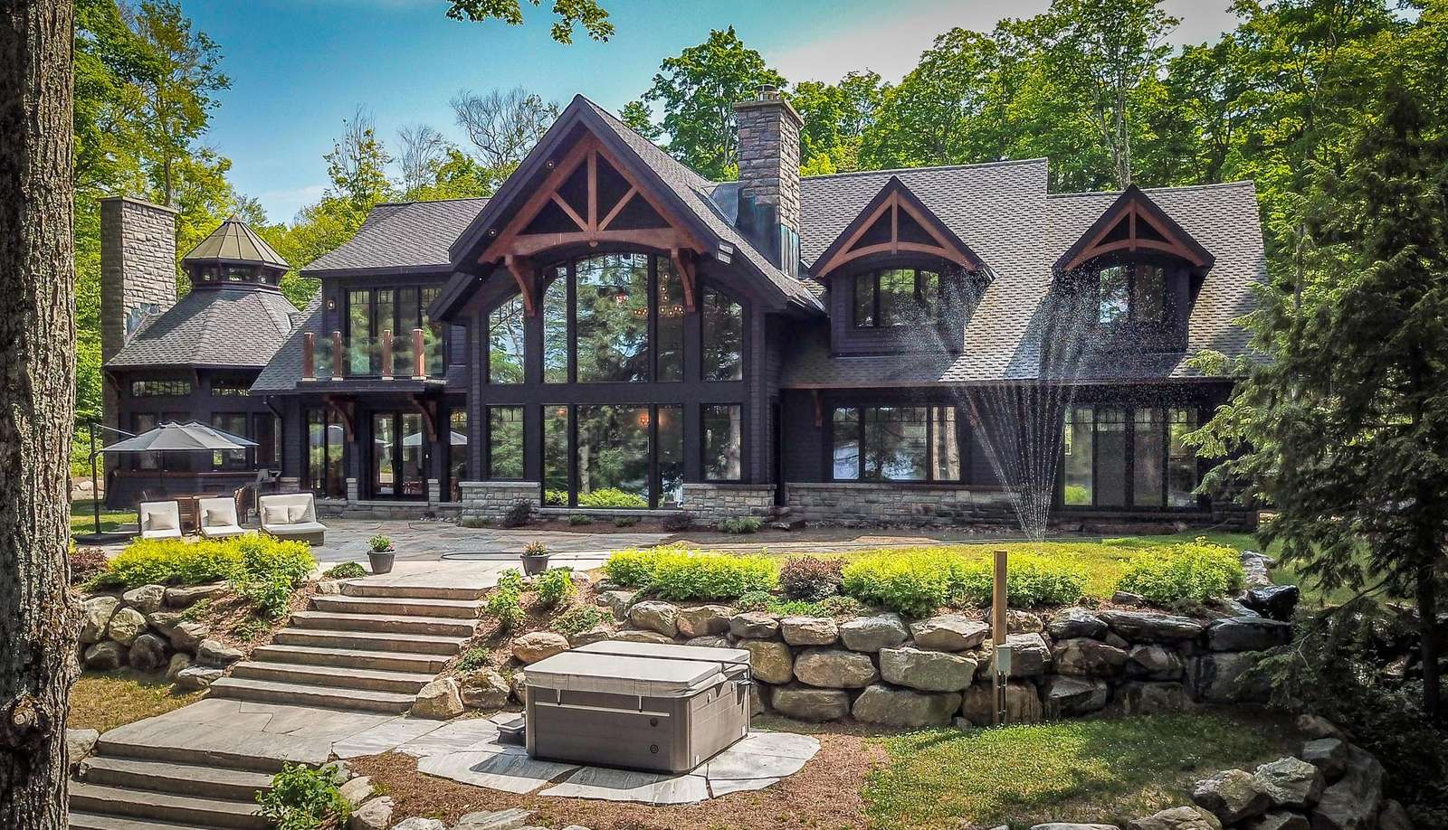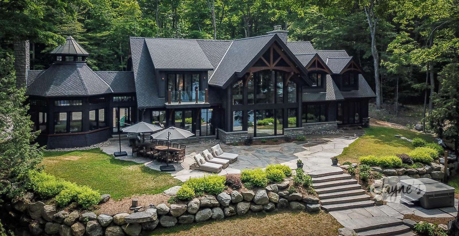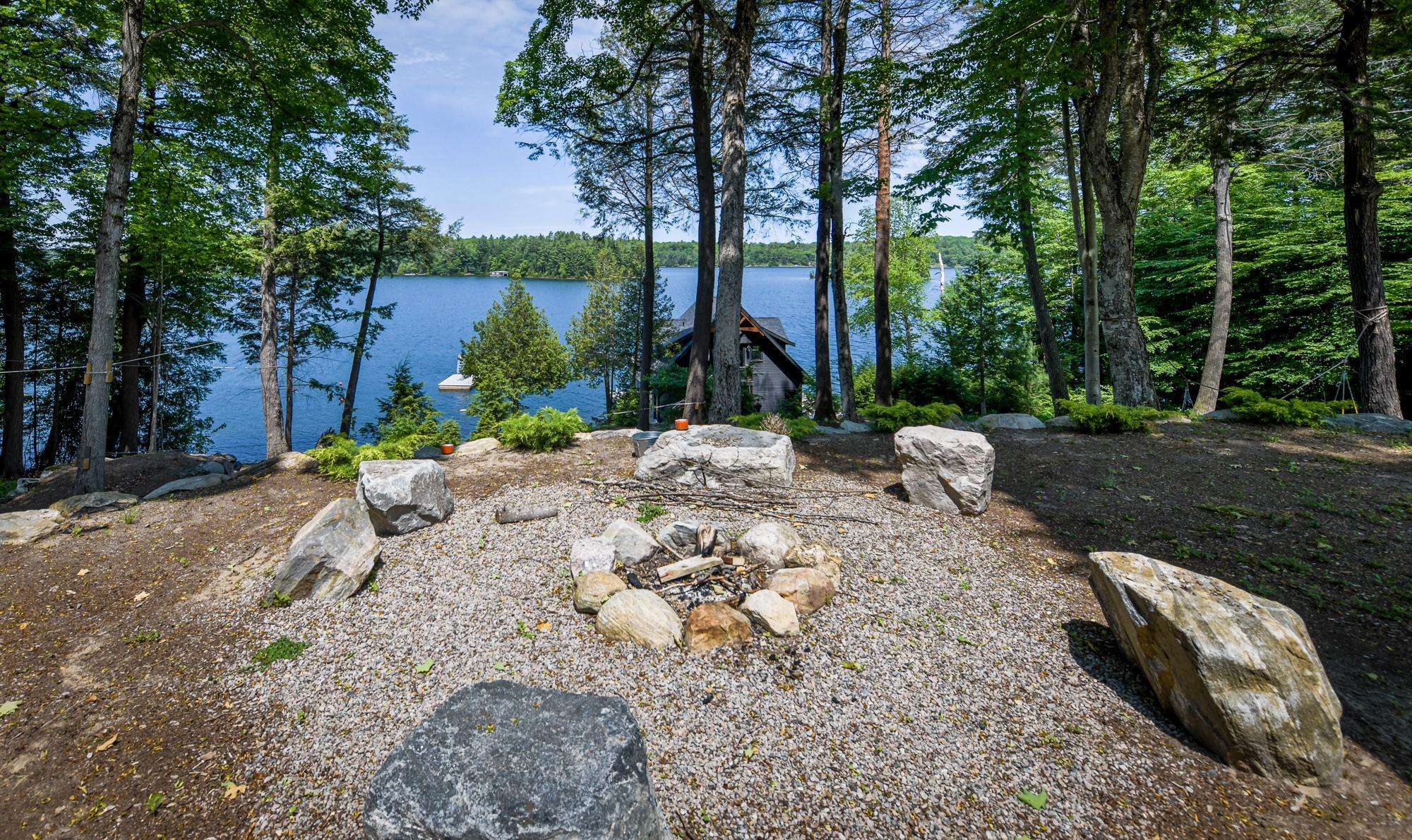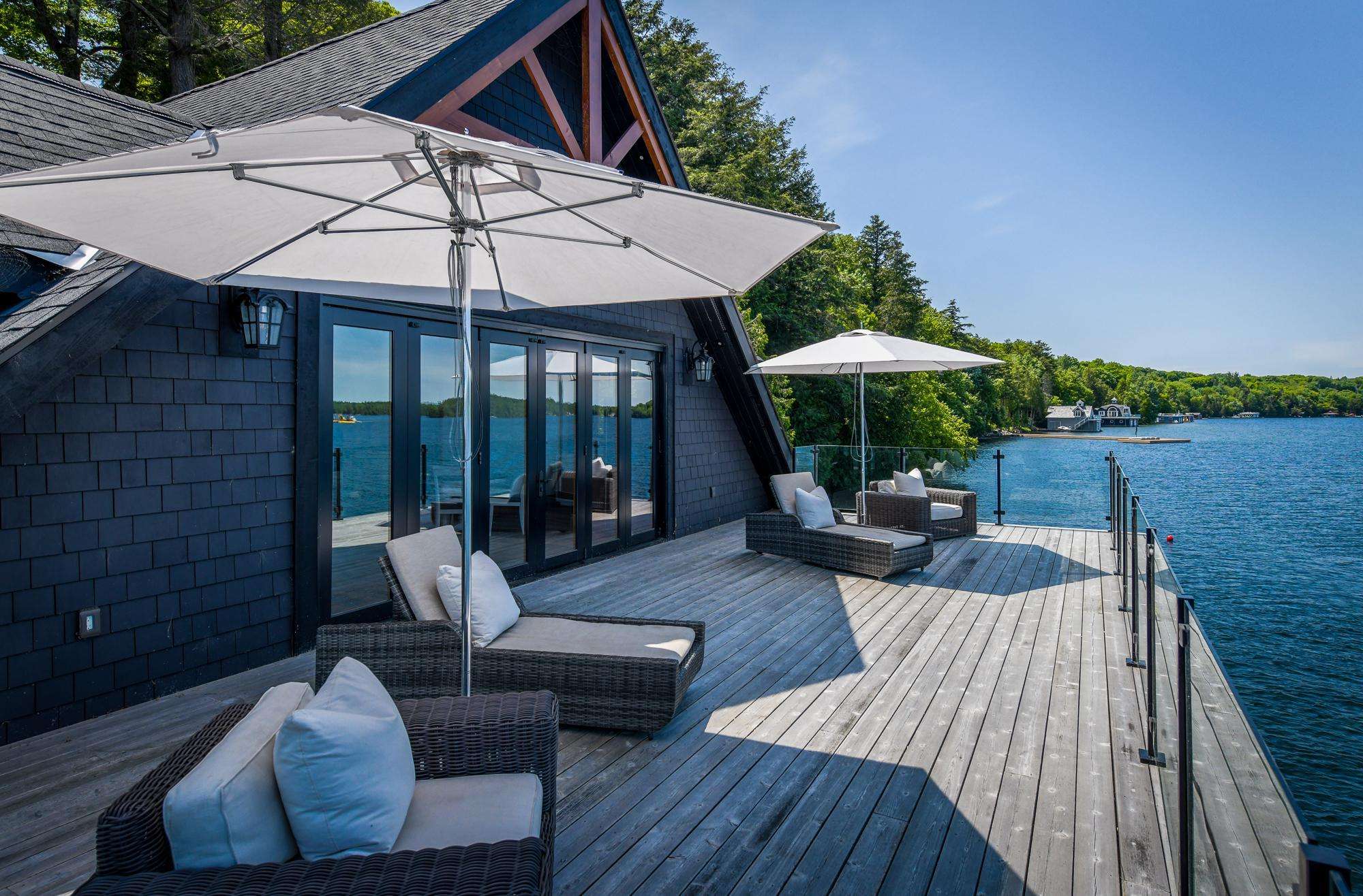 LAKE JOE CHATEAU - A beautiful drive through the woods brings you to the roundabout driveway that encircles the front yard. A grand entrance with timber beams welcomes you into the cottage. Around back, a romantic dining area for 6 with two umbrellas and a BBQ provide the perfect place to enjoy lunch! Also featured are three loungers and a hot tub overlooking the cascading stone stair case. On the left, 3 kid pod hammock chairs offer a fun place to swing in the summer breeze. A fire pit with stone seating for 6 is the perfect place to roast marshmallows as the sun goes down! Further down on the right, 3 tire swings invite you swing on while soaking in the view! At the water's edge, a beautiful boathouse and dock boast plenty of outdoor furniture and clear glass railings to enjoy the beautiful Lake Joseph view! Fully enjoy this tremendous 12 acre property by walking the trails that run from the highway to the water and feature a river flowing through!