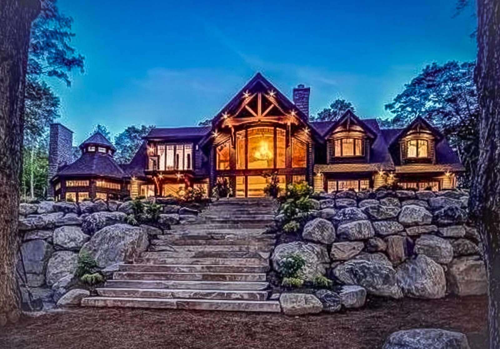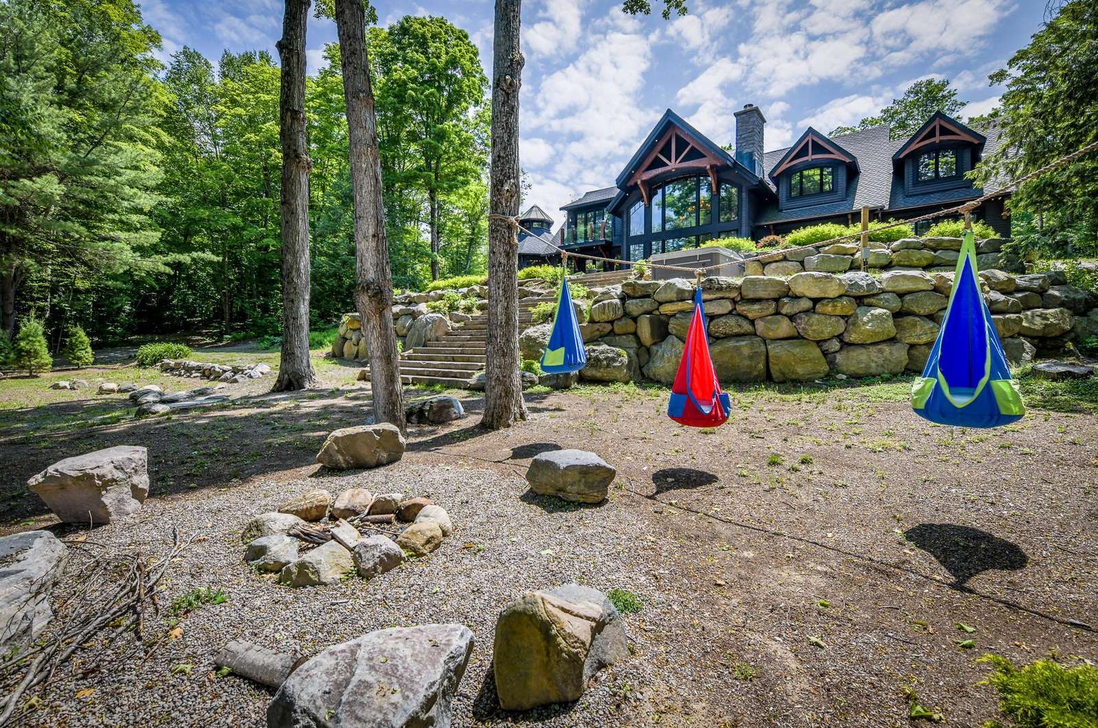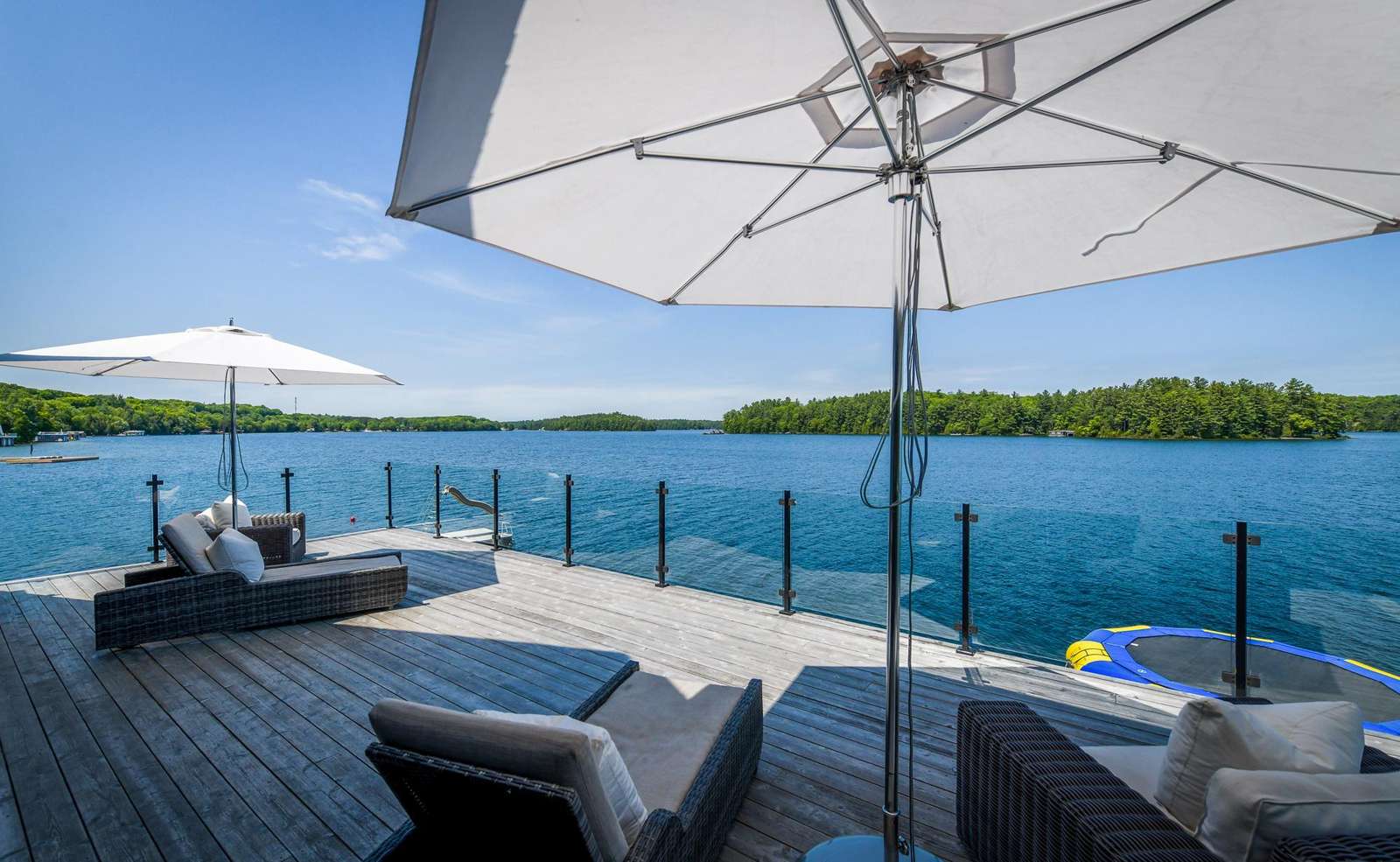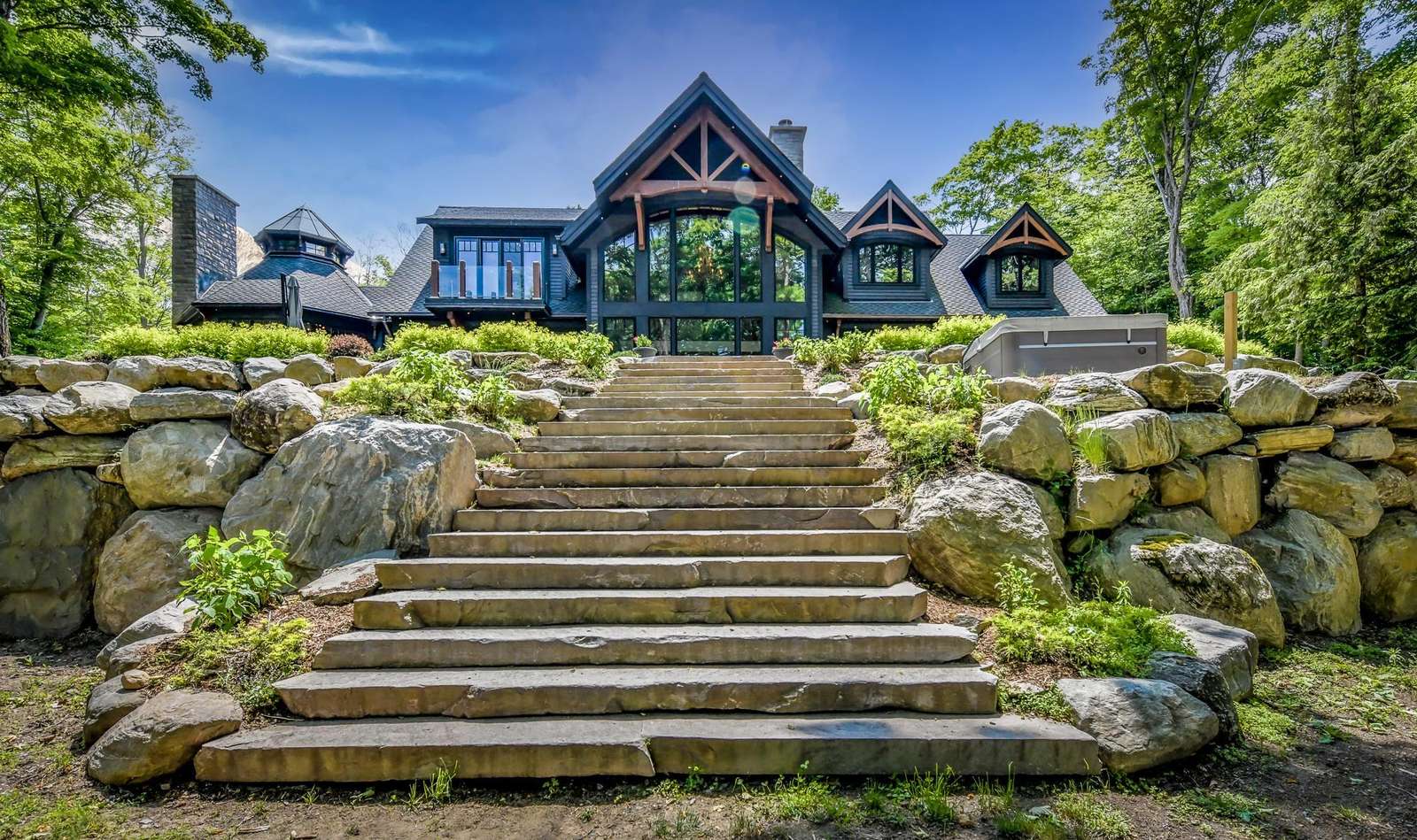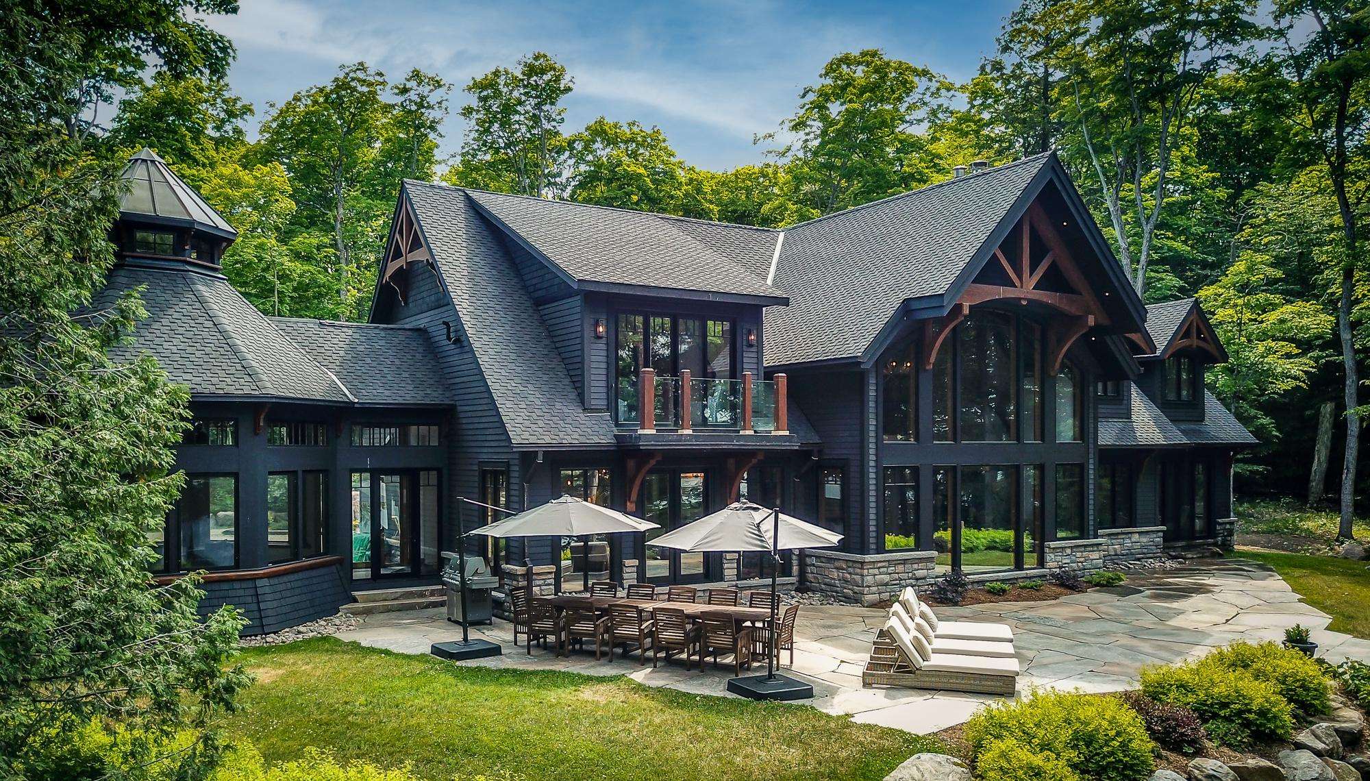 LAKE JOE CHATEAU - A beautiful drive through the woods brings you to the roundabout driveway that encircles the front yard. A grand entrance with timber beams welcomes you into the cottage. Around back, a romantic dining area for 6 with two umbrellas and a BBQ provide the perfect place to enjoy lunch! Also featured are three loungers and a hot tub overlooking the cascading stone stair case. On the left, 3 kid pod hammock chairs offer a fun place to swing in the summer breeze. A fire pit with stone seating for 6 is the perfect place to roast marshmallows as the sun goes down! Further down on the right, 3 tire swings invite you swing on while soaking in the view! At the water's edge, a beautiful boathouse and dock boast plenty of outdoor furniture and clear glass railings to enjoy the beautiful Lake Joseph view! Fully enjoy this tremendous 12 acre property by walking the trails that run from the highway to the water and feature a river flowing through!
