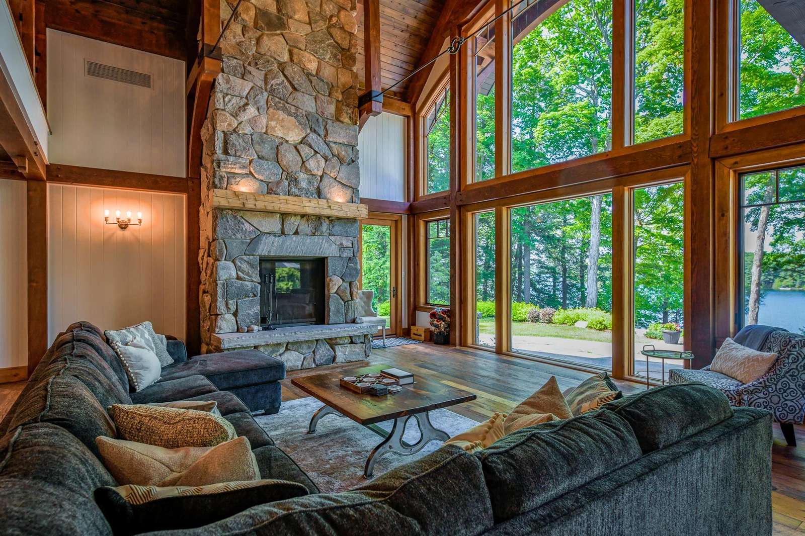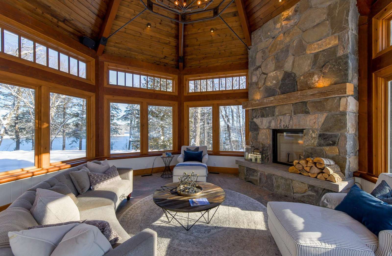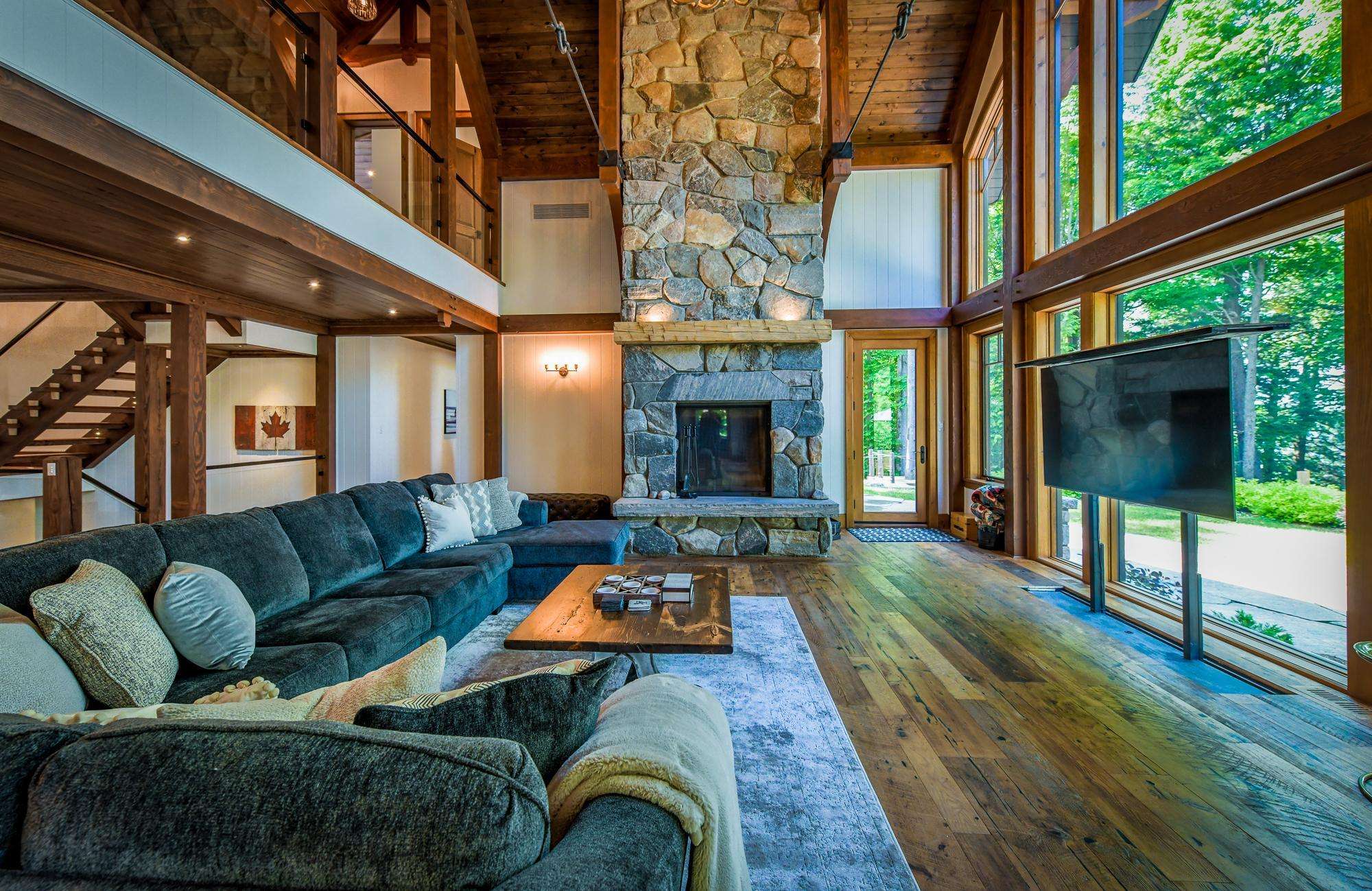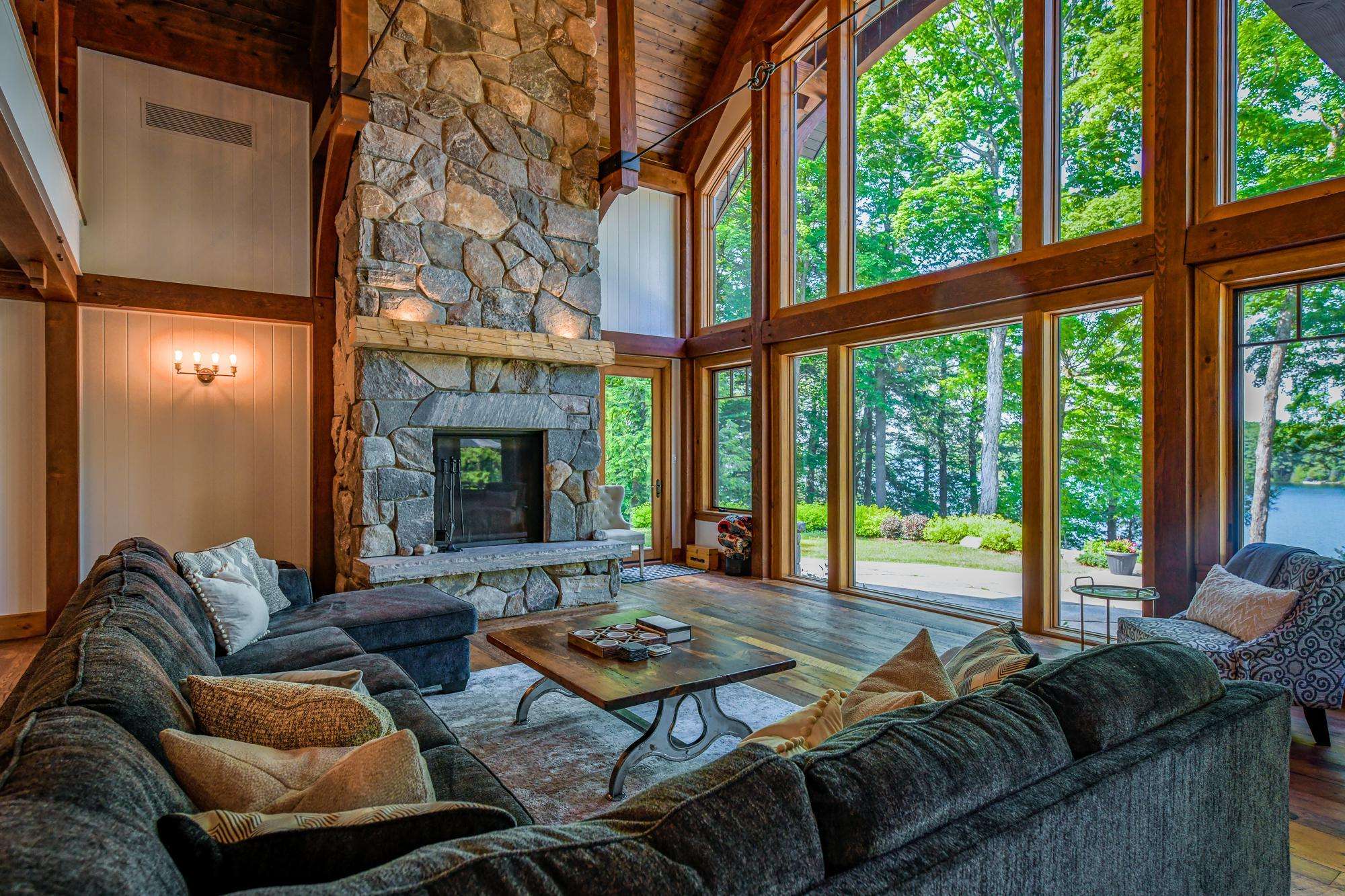 The bright Muskoka Room features a wood burning fireplace encircled by comfortable seating and oversized screened windows that allow the summer breeze to drift throughout the room.