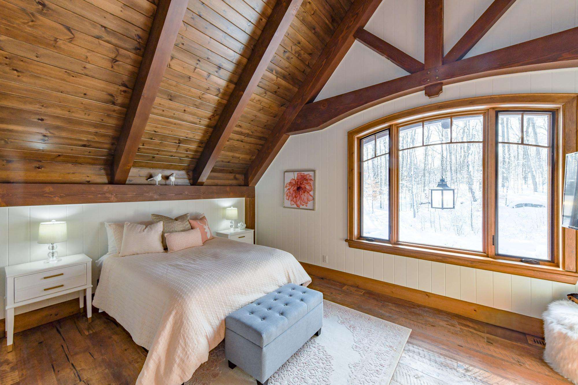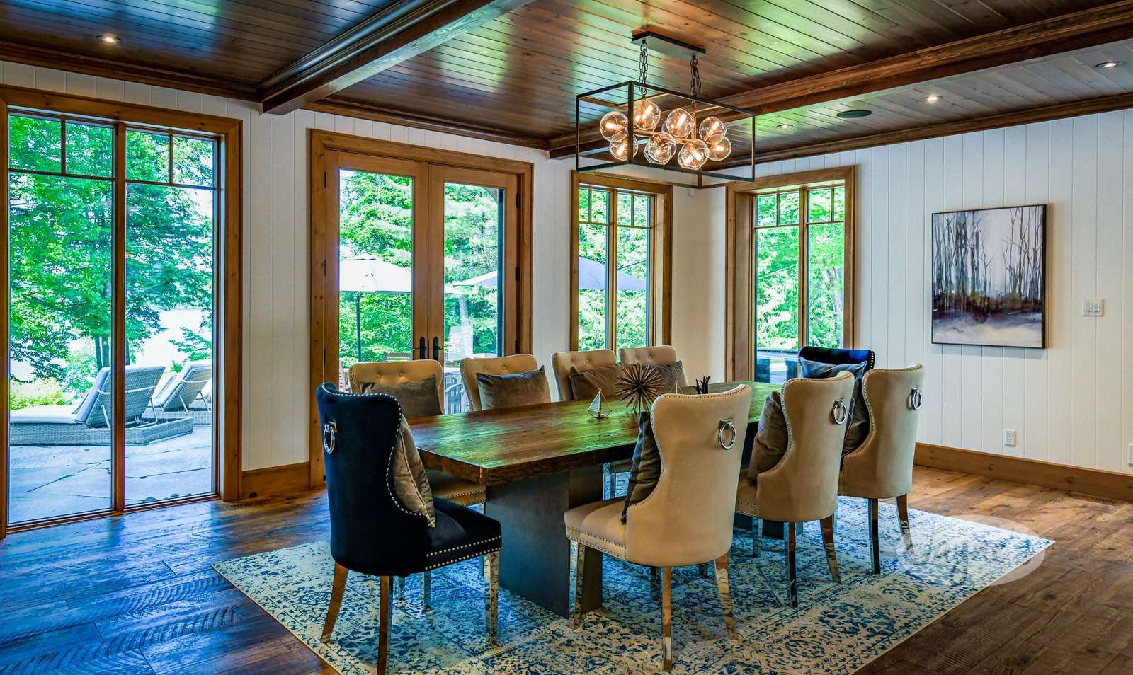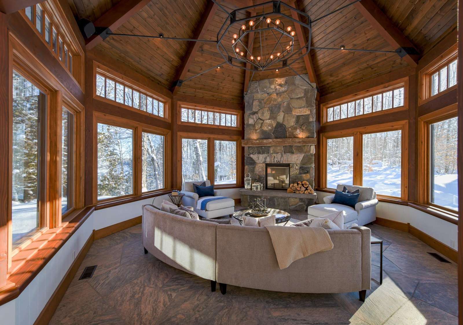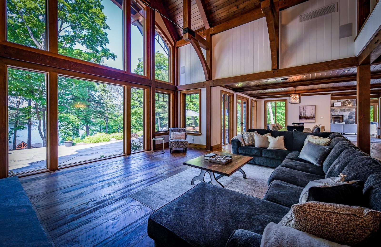 The bright Muskoka Room features a wood burning fireplace encircled by comfortable seating and oversized screened windows that allow the summer breeze to drift throughout the room.