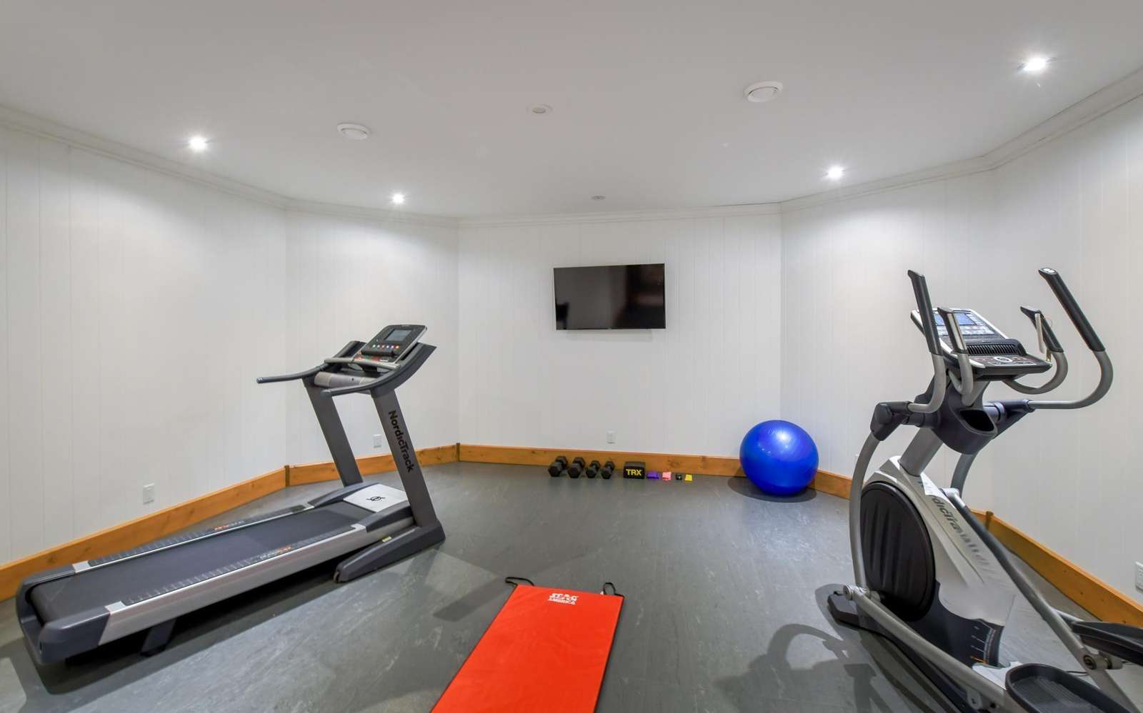 Includes a treadmill, elliptical, weights and TV with room to work out.