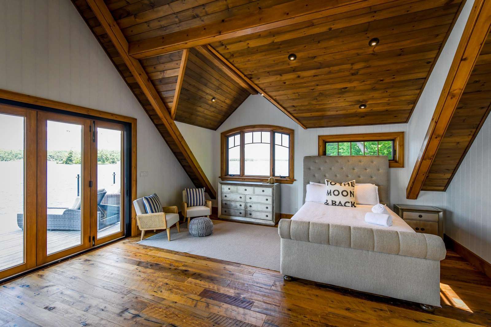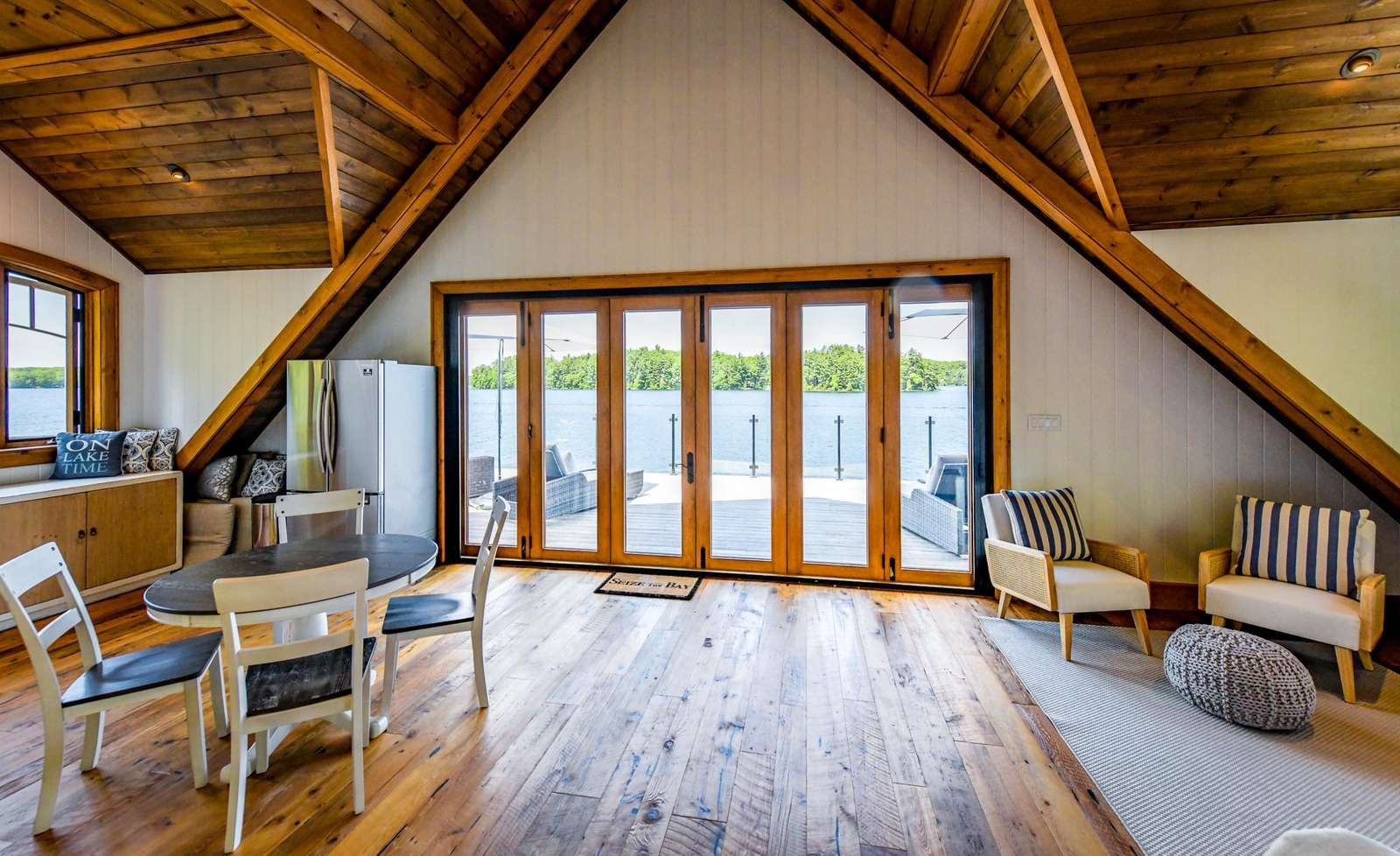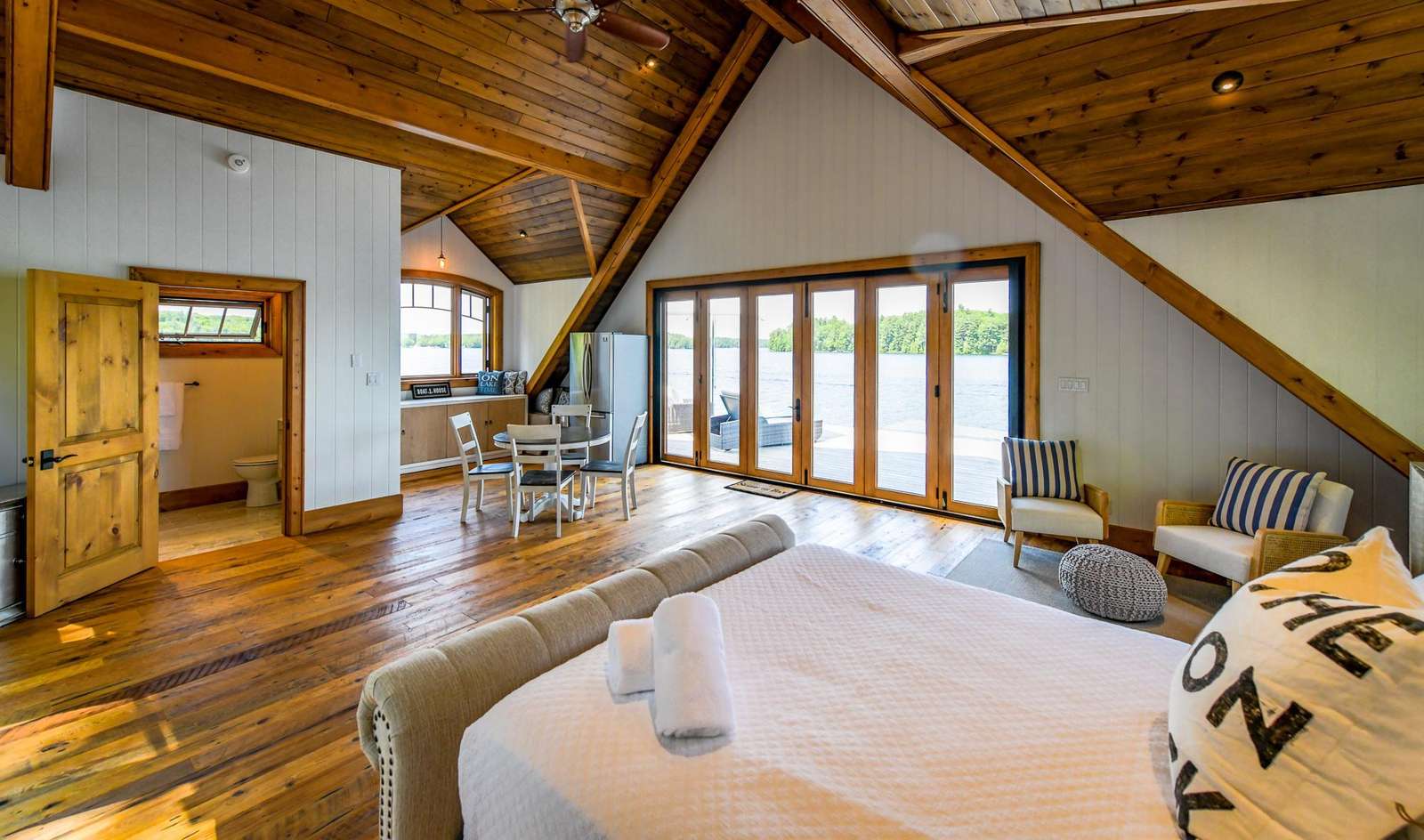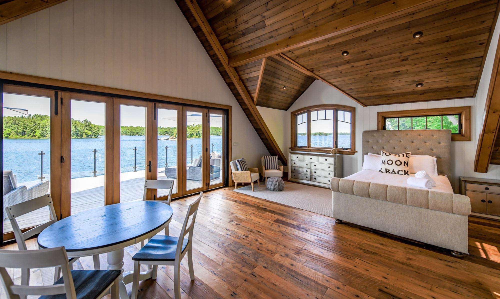 The upper boathouse is an open area with a 3 piece bath, comfortable lounging area and a Queen bed.