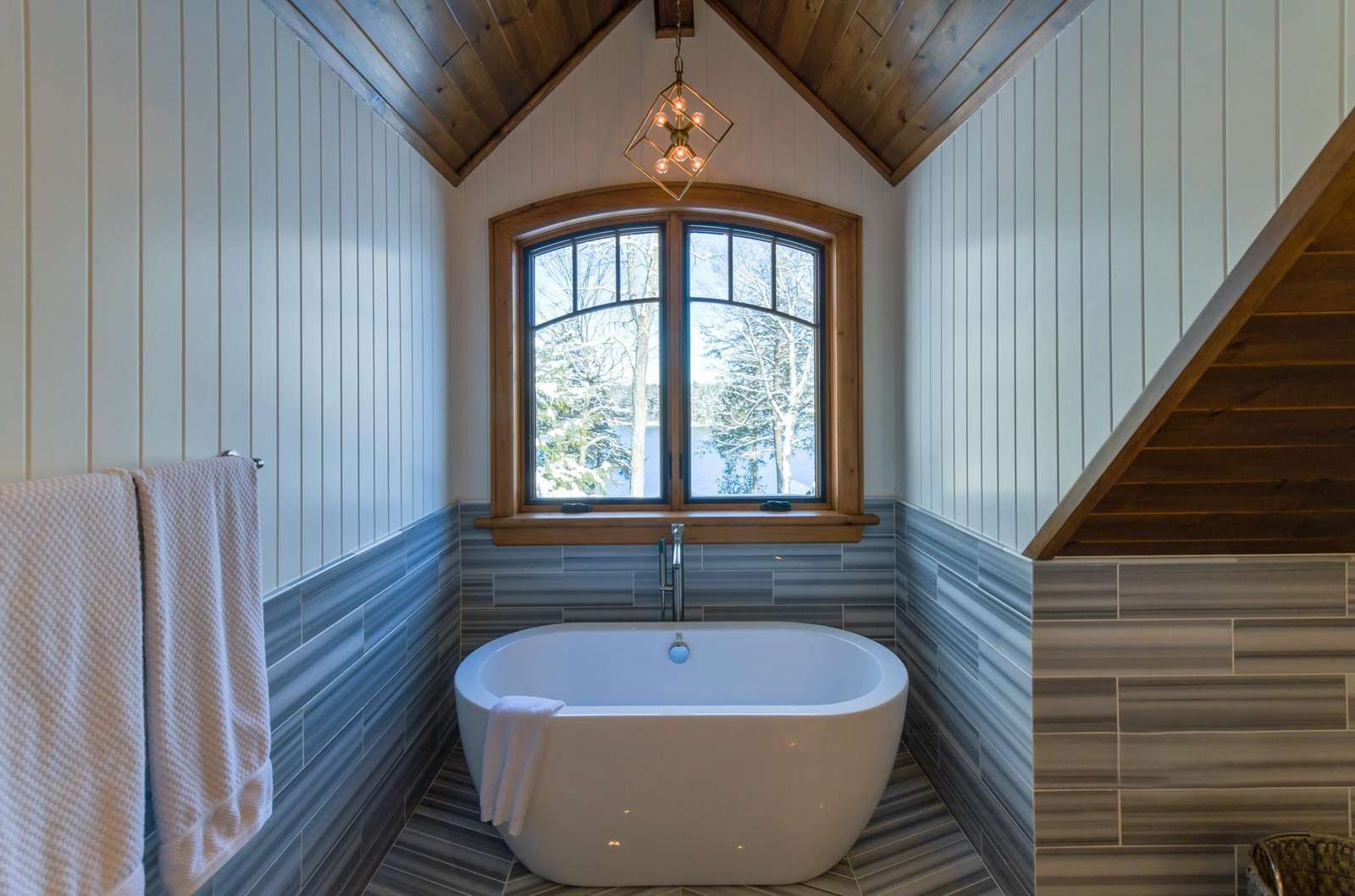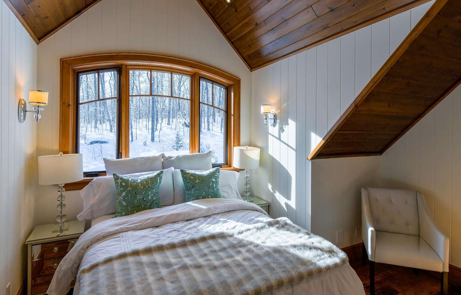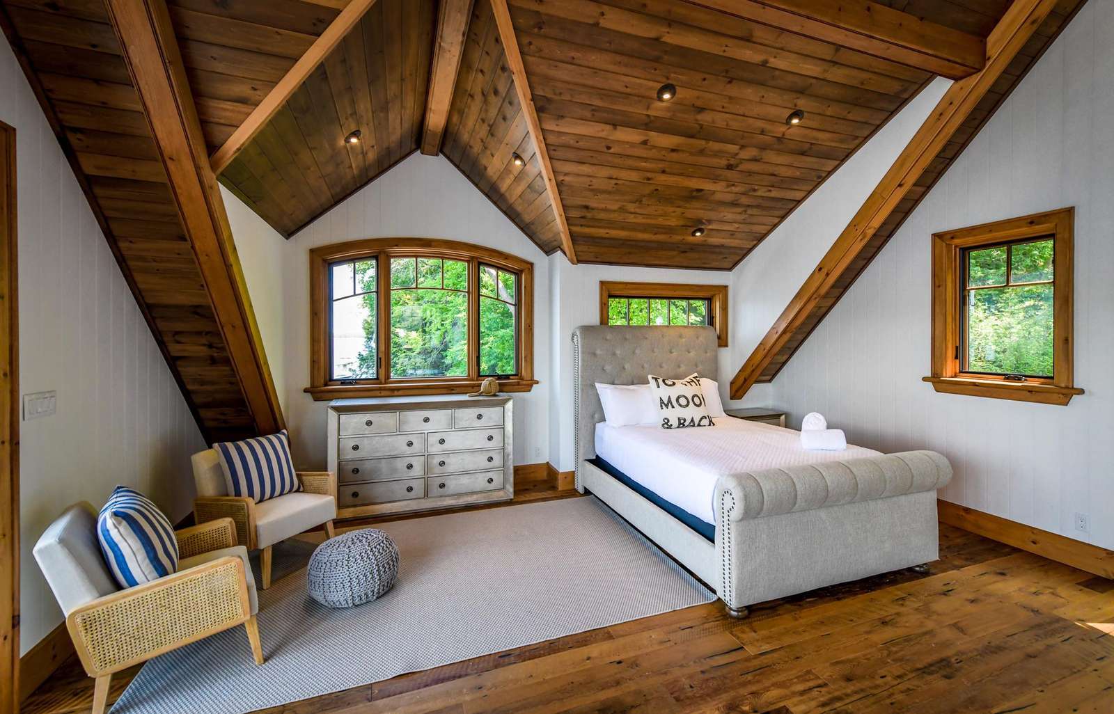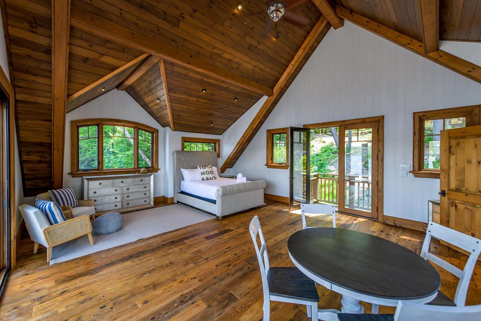 The upper boathouse is an open area with a 3 piece bath, comfortable lounging area and a Queen bed.
