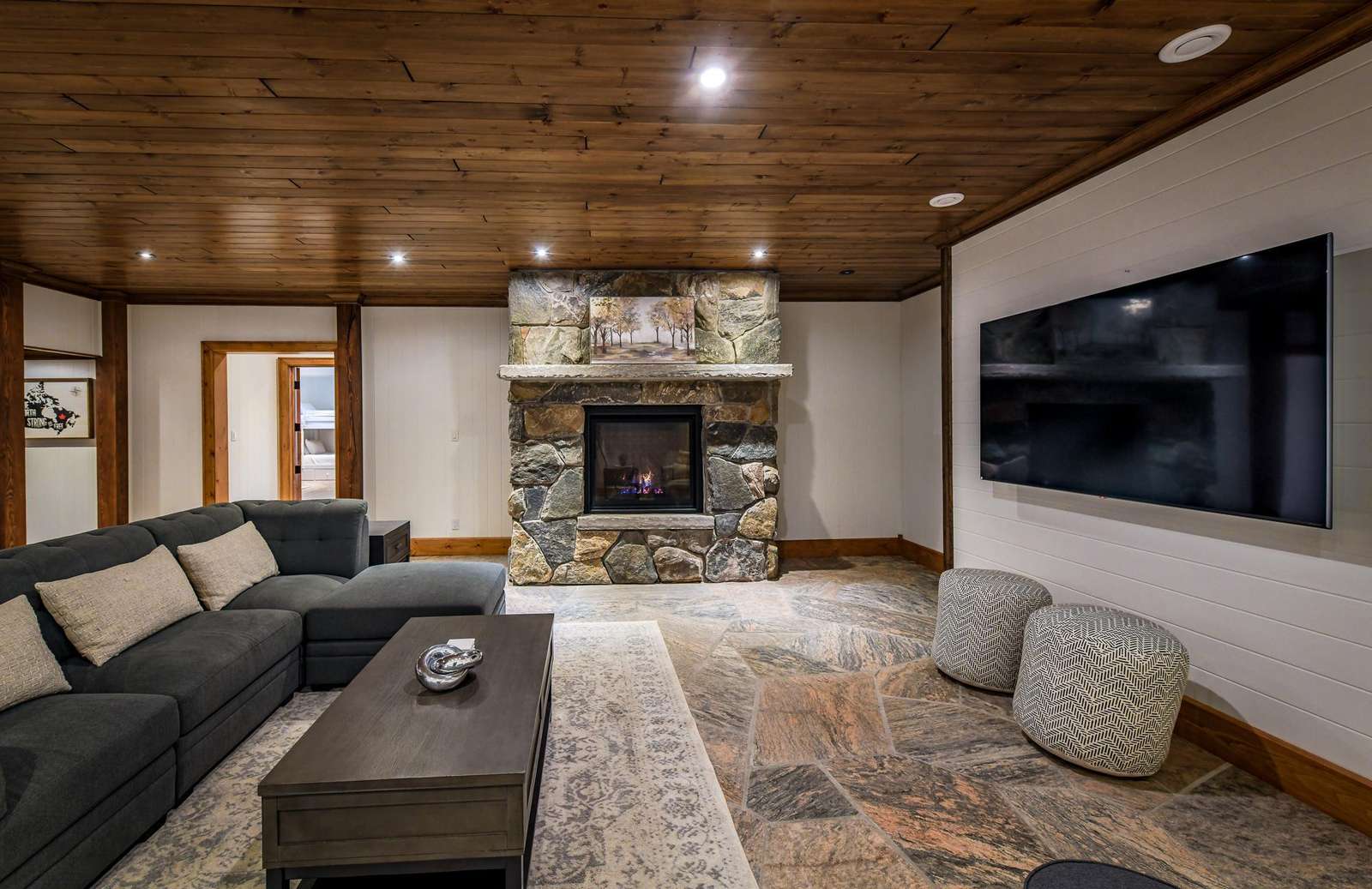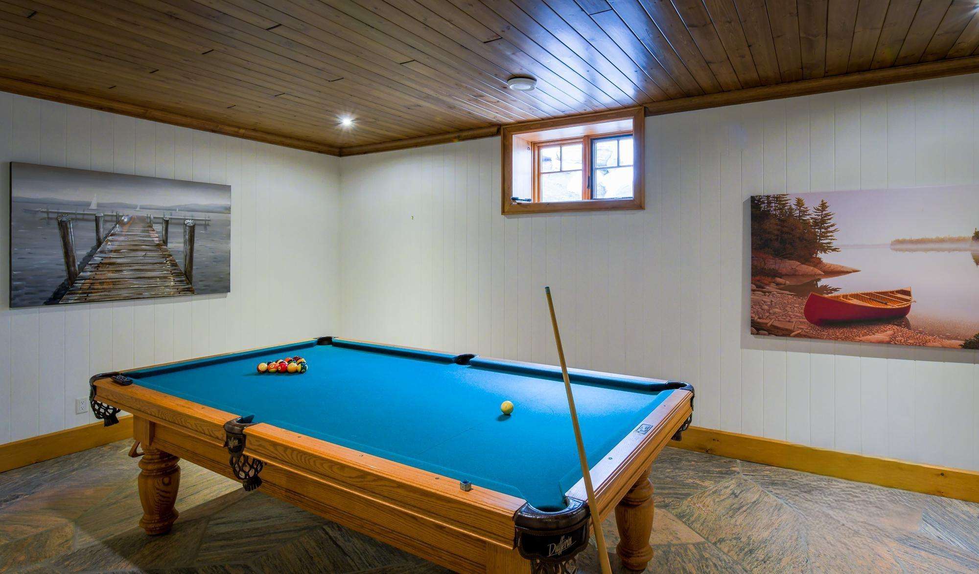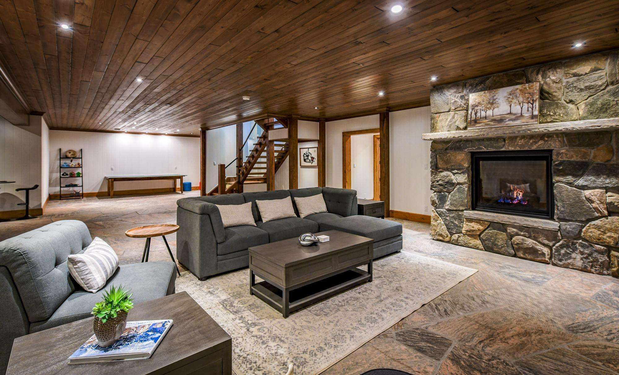 Features a seating area with a gas fireplace and oversized flat screen TV. A gym and pool table complete this spacious level!