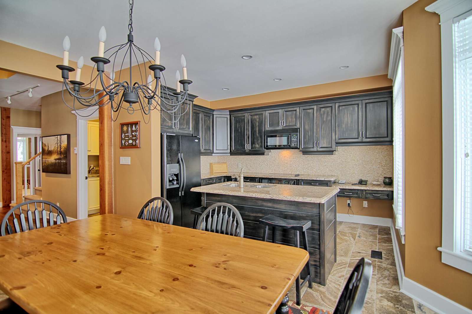 Renovated kitchen with large island and 2 bar stools