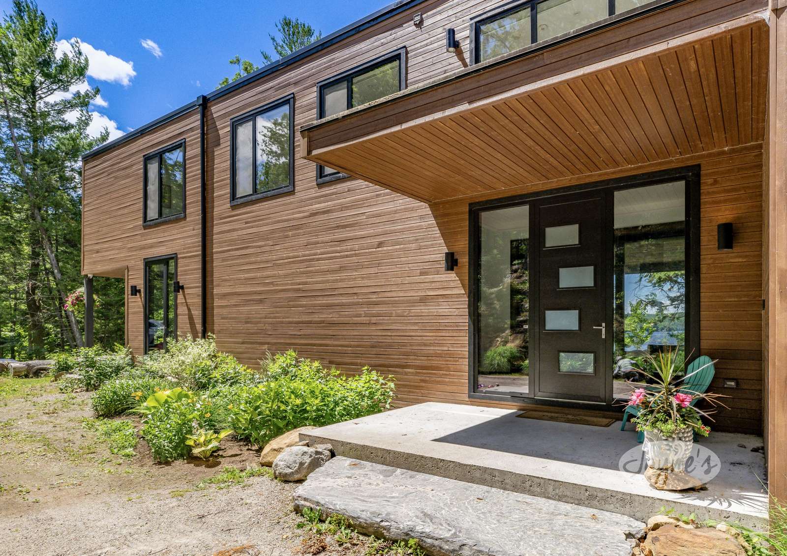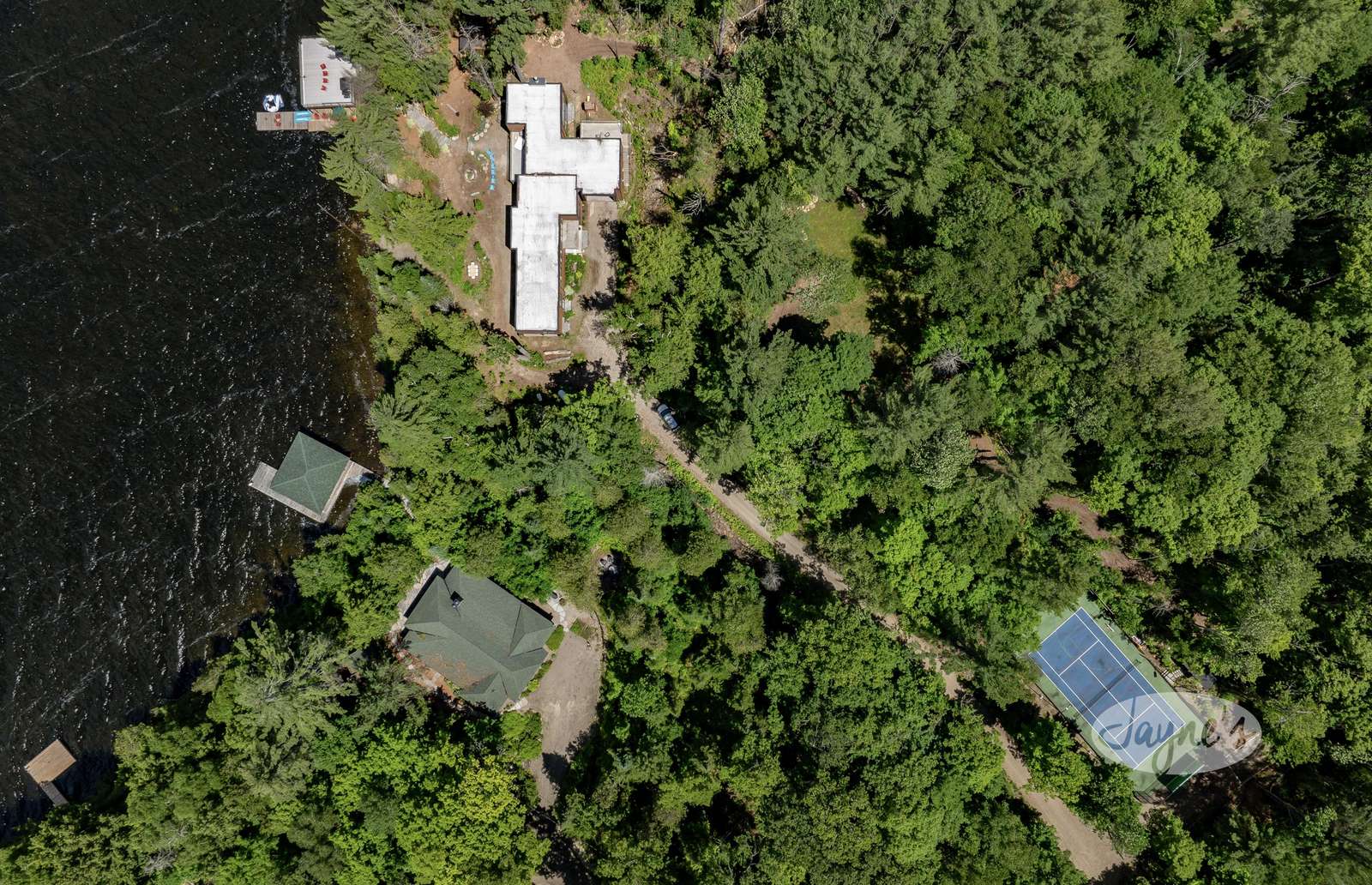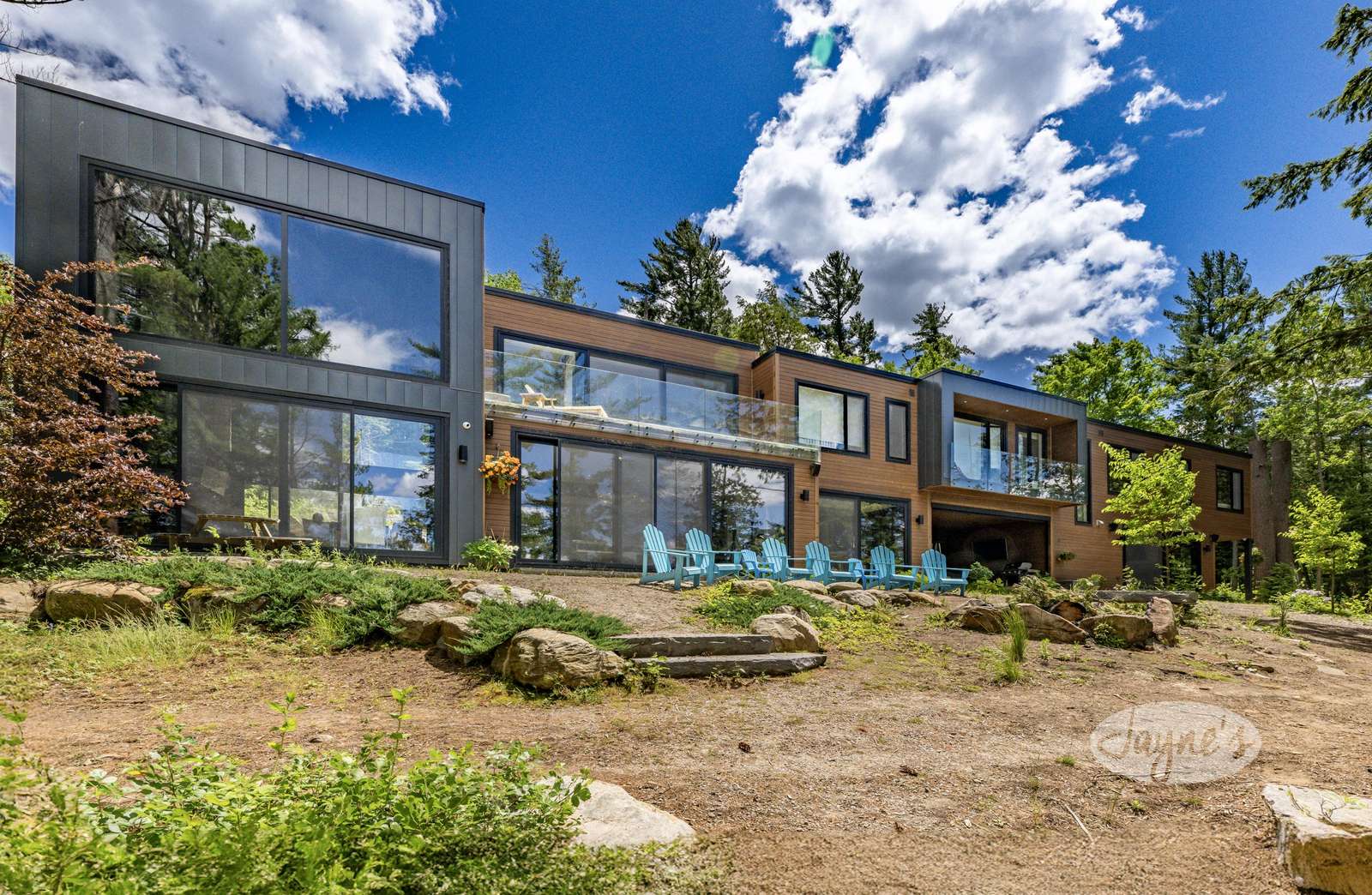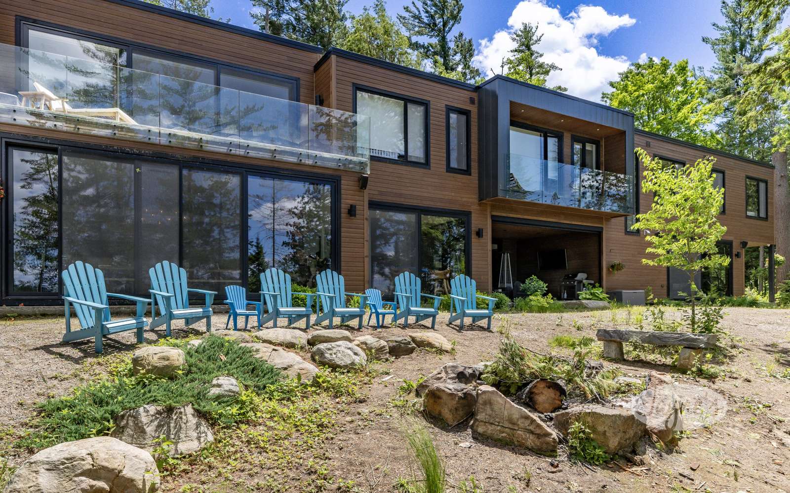 LAND BEFORE TIME is located on a gorgeous lot with stunning natural rock and towering mature trees, and sits solitary and stunning amongst the earth and greenery. It is a brand new, ultra modern cottage as of summer 2019. Take in nature's beauty even while indoors with the huge floor to ceiling windows on the main floor. Traipse the property and follow the beautiful, winding nature trails that lead towards the tennis court or the stone steps that lead to the water. Even with the trees lining and dotting around the property, the views of lovely Lake of Bays are always visible peaking through and open up completely when you arrive at the water's edge. The property boasts a tennis court with a cabana for shade and viewing as well as a badminton net to ensure there is never a dull moment! A small sandy beach with a shallow walk-in sits adjacent to the dock offering a perfect place for young children to enjoy the waterfront! Secluded and quiet, Land Before time is the perfect cottage getaway with the modernity and elegance of city-living.