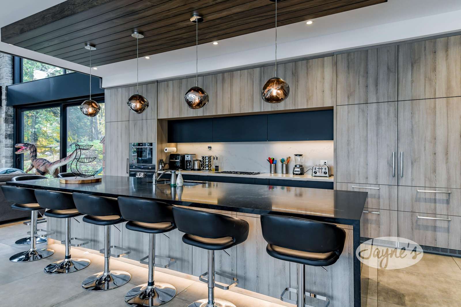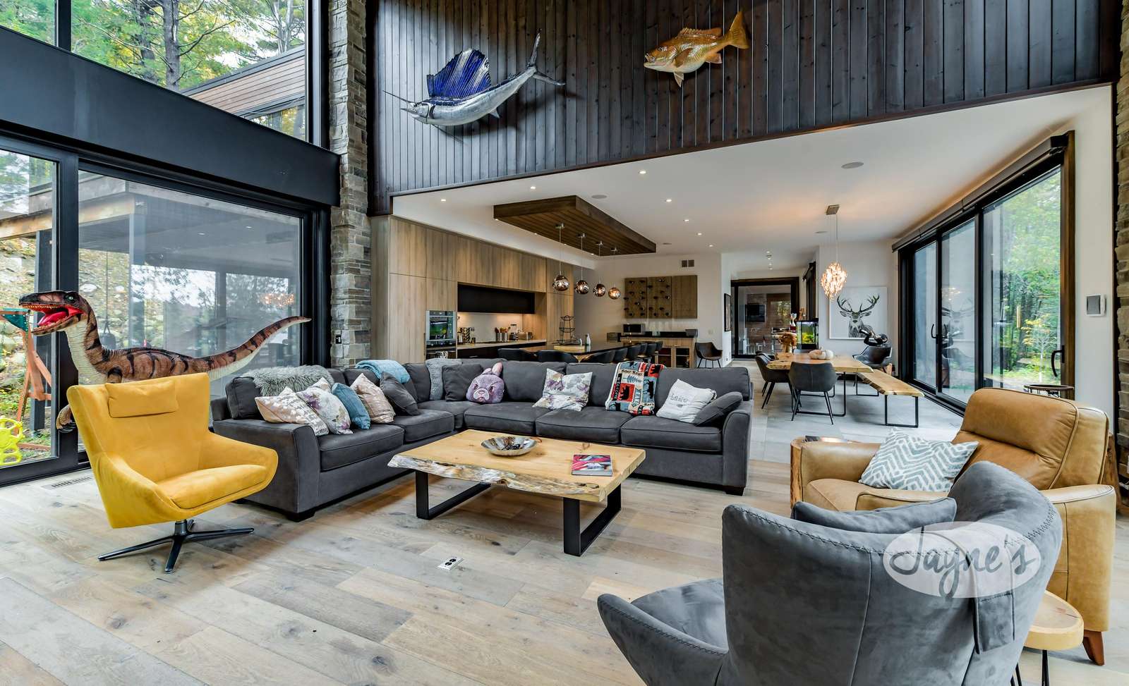 Features large sectional, 2 armchairs, wood-burning fireplace, TV, large sliding doors to yard, and life-size velociraptor