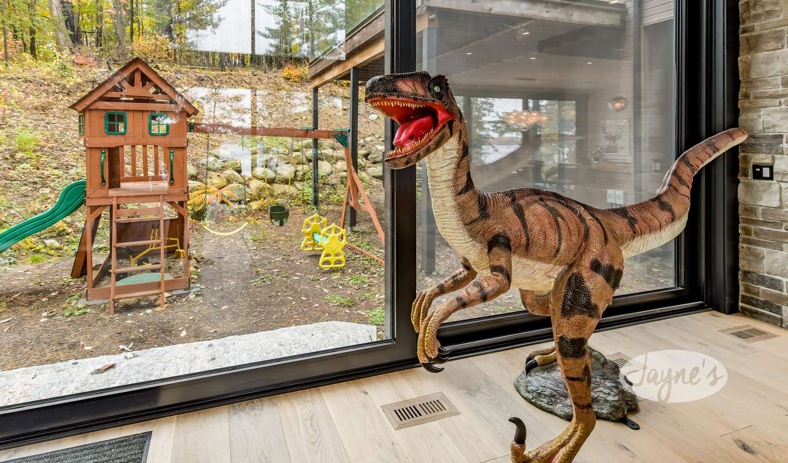 Life-size velociraptor in living room