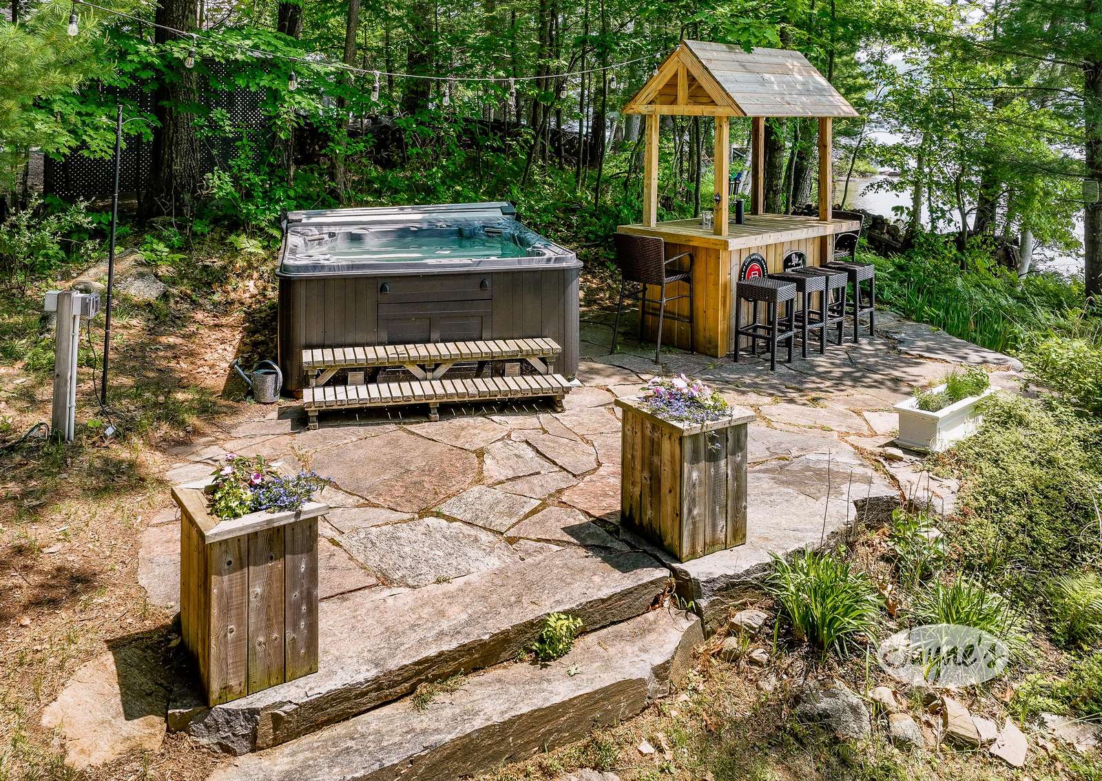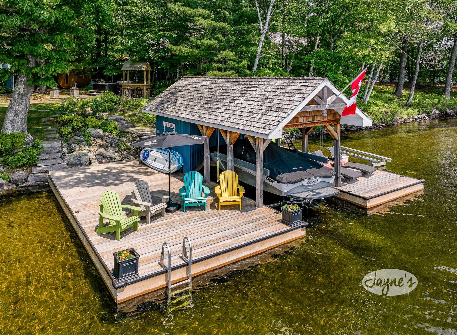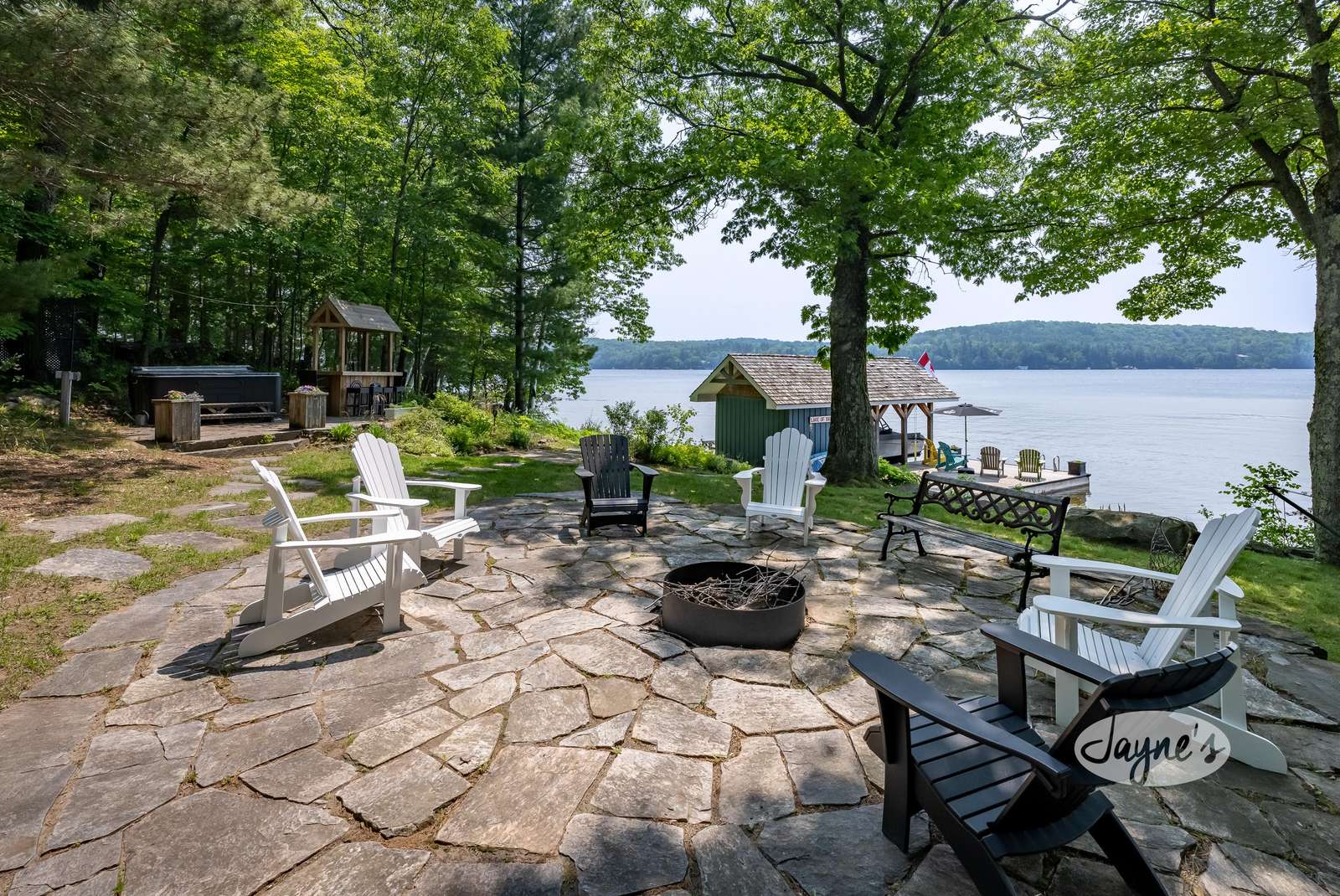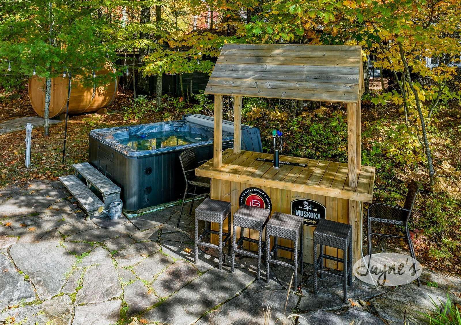 Descending down a few steps will bring you the the level backyard where a wood-burning sauna on the left invites you to decompress after a day in the lake! Alternatively, enjoy soaking in the lake views from a hot tub which is beside a covered keg bar for 6! Down at the dock, 2 chaise loungers, an umbrella and 7 Muskoka chairs invite you to bask in the all-day-sun. As the sun begins to set, make your way to the flagstone fire pit where you can roast marshmallows midst your best campfire story!