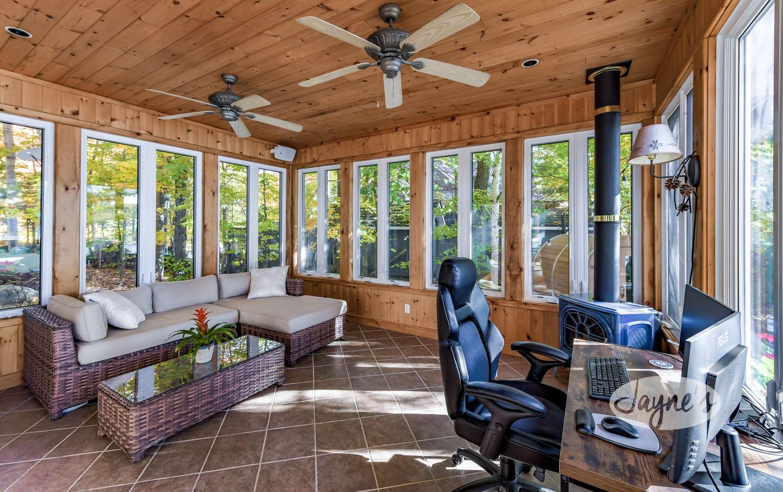 Separate from the house, this fully screened in room provides glorious lake views from a desk and chair - the dream spot to work remotely!