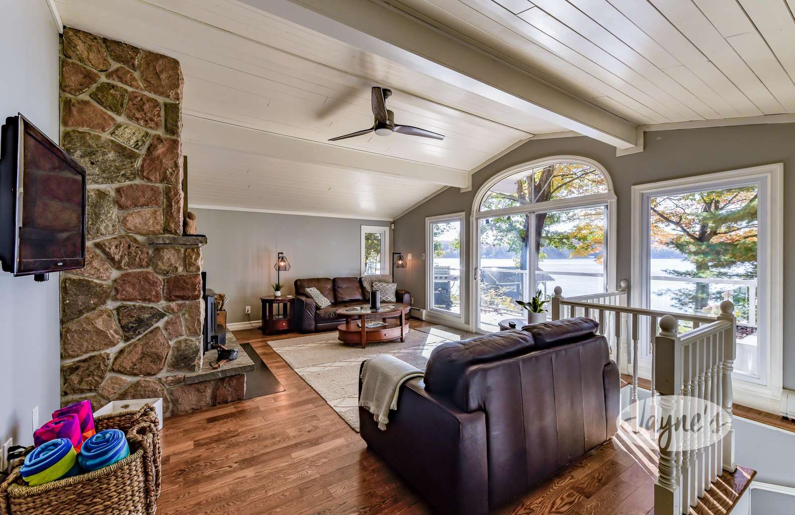 Features a stone wood-burning fireplace with TV surrounded by 2 sofa's. A sliding patio door provides access to the back deck.