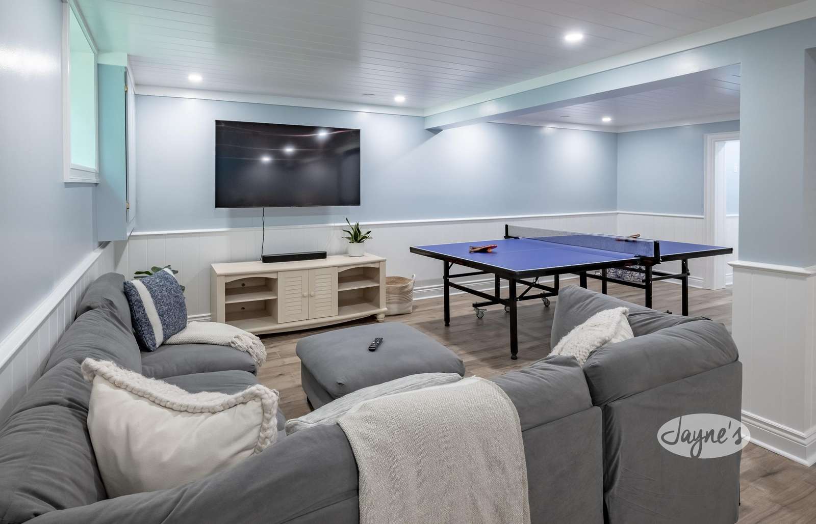 Features a cozy seating area across from a gas fireplace, a high table for 4, a second seating area around a TV and a ping pong table!