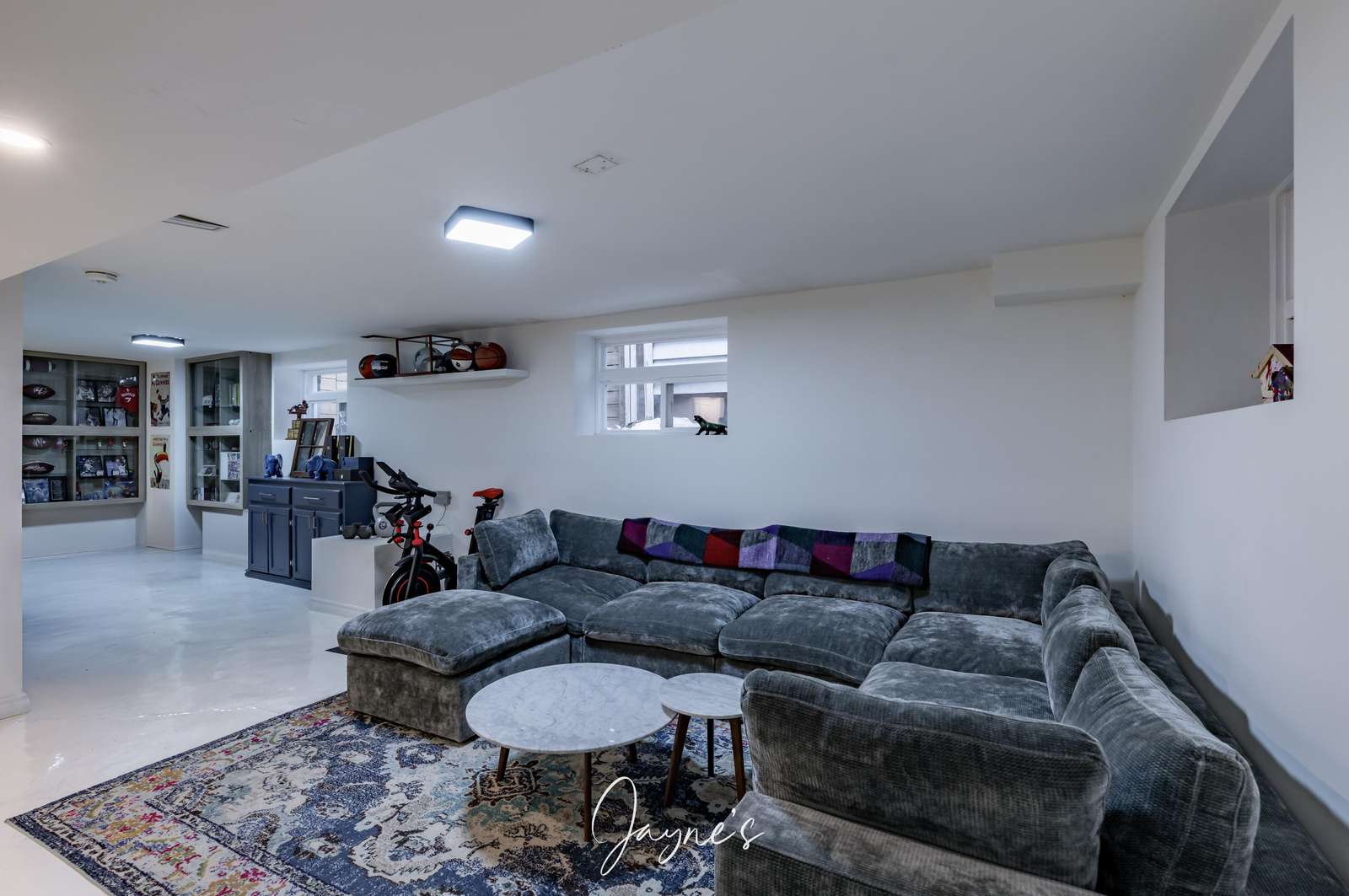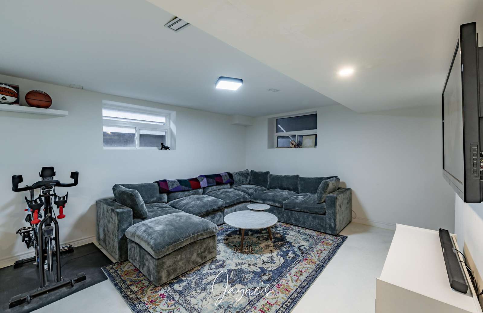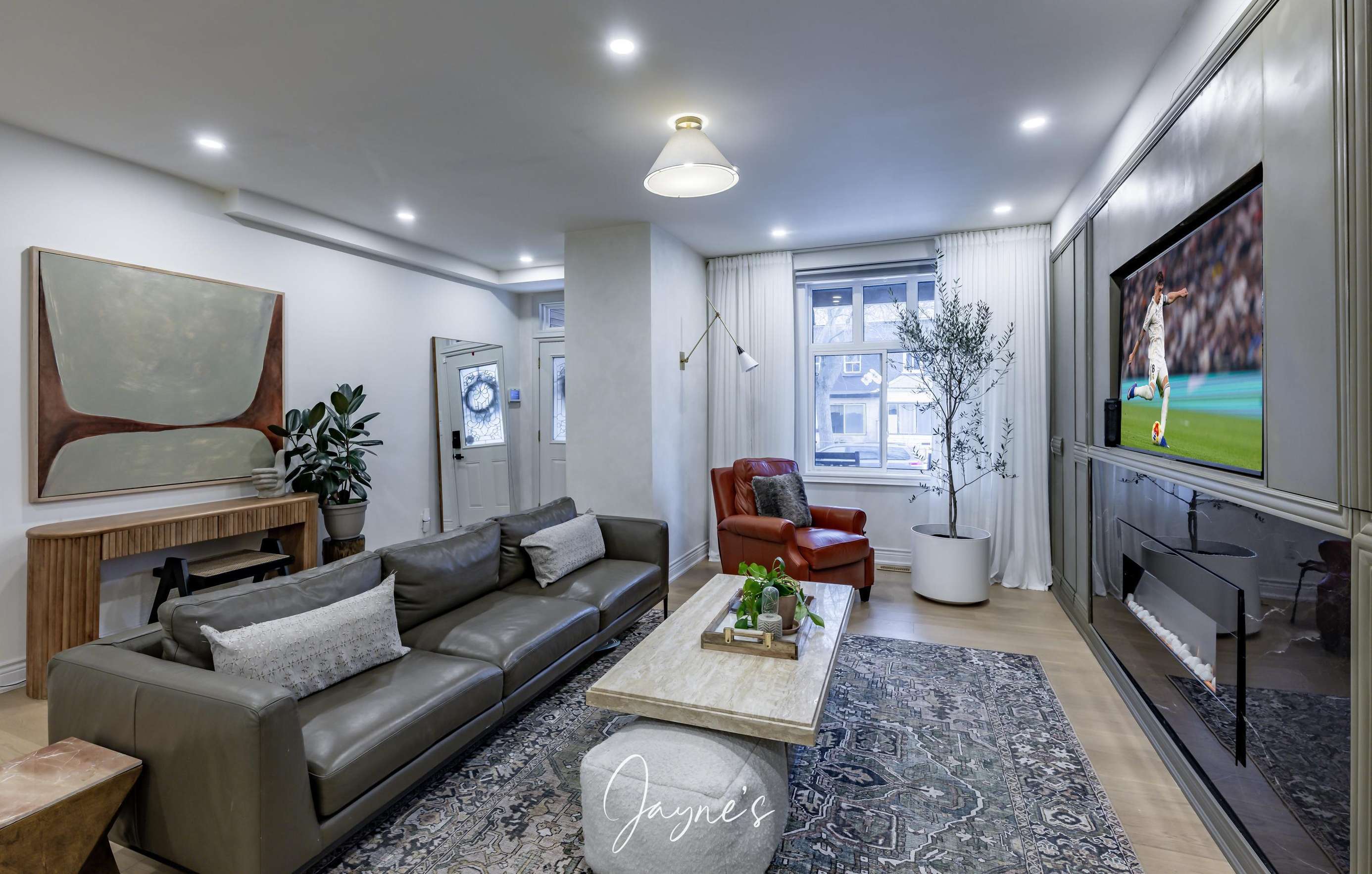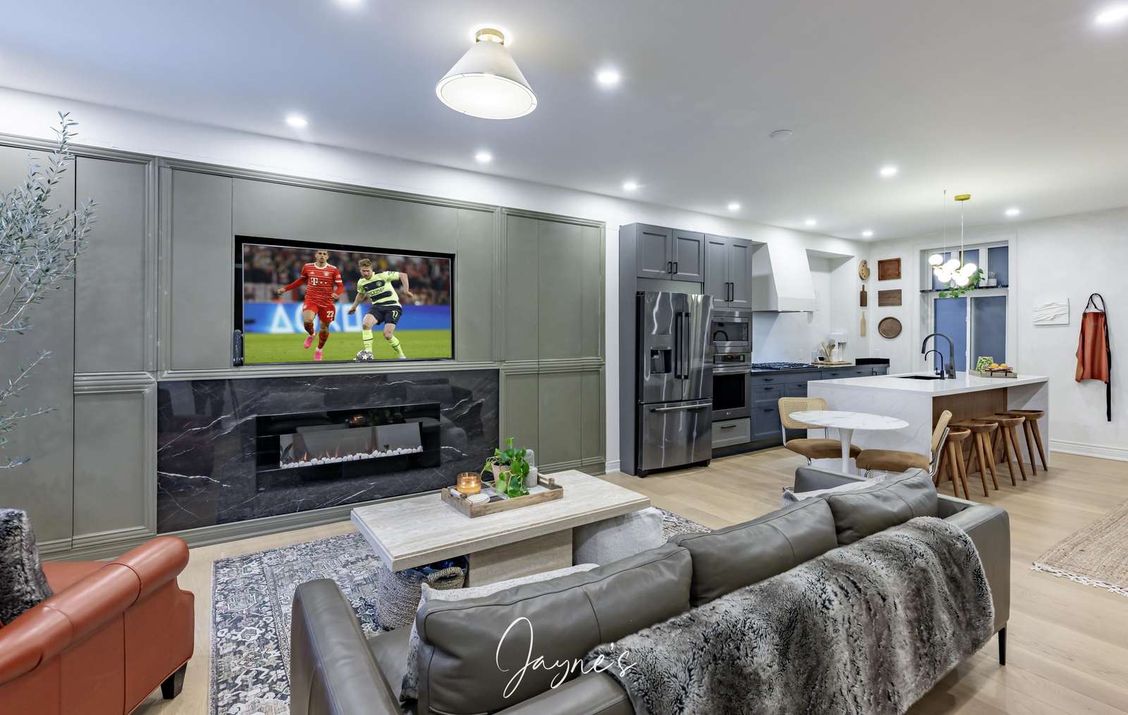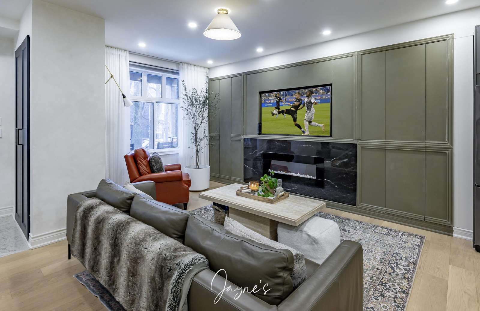Gas Fireplace with built in smart tv on smart storage units, plus plenty of room for family movie nights.