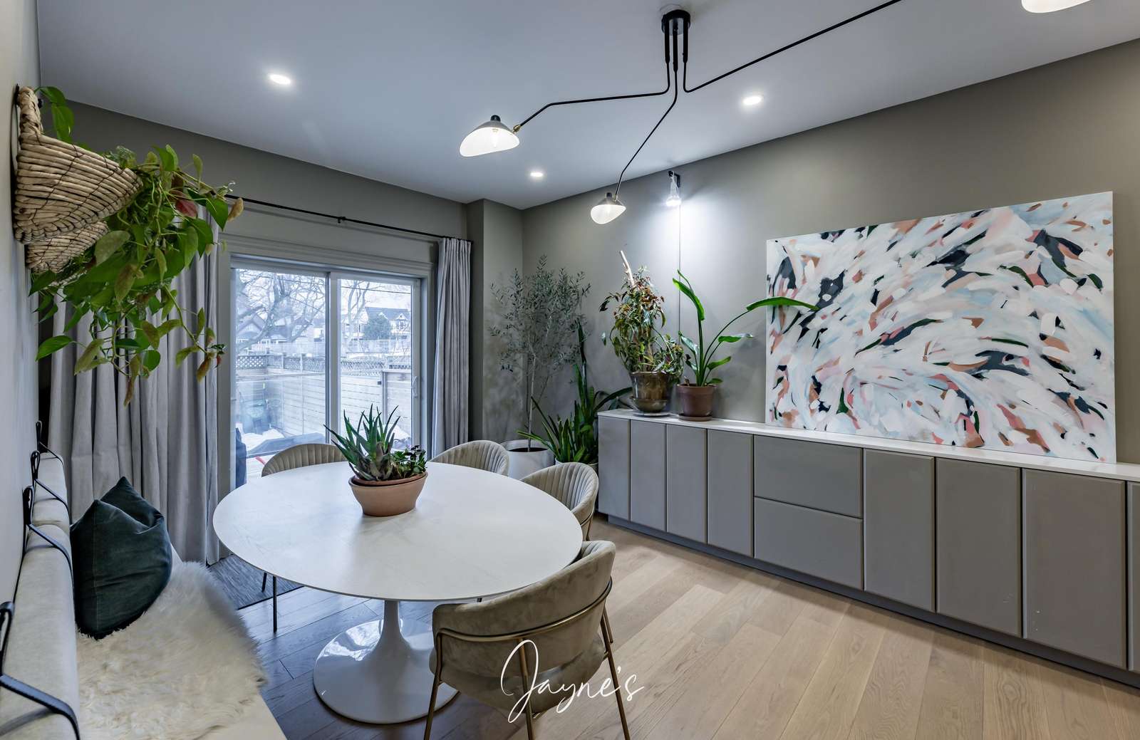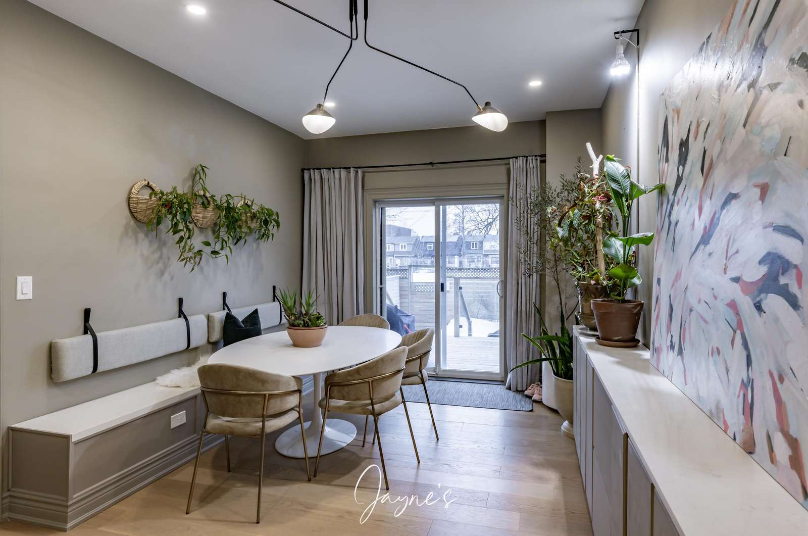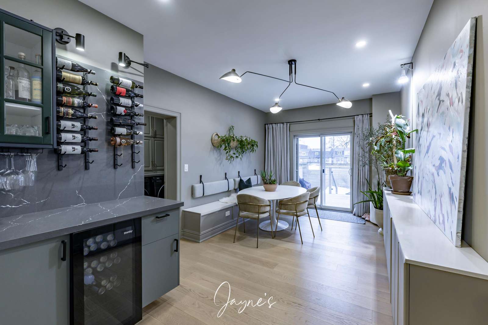 Casual dining room with table to seat 6 plus pantry and wine fridge, coffee bar and sliding doors leading to deck and yard.