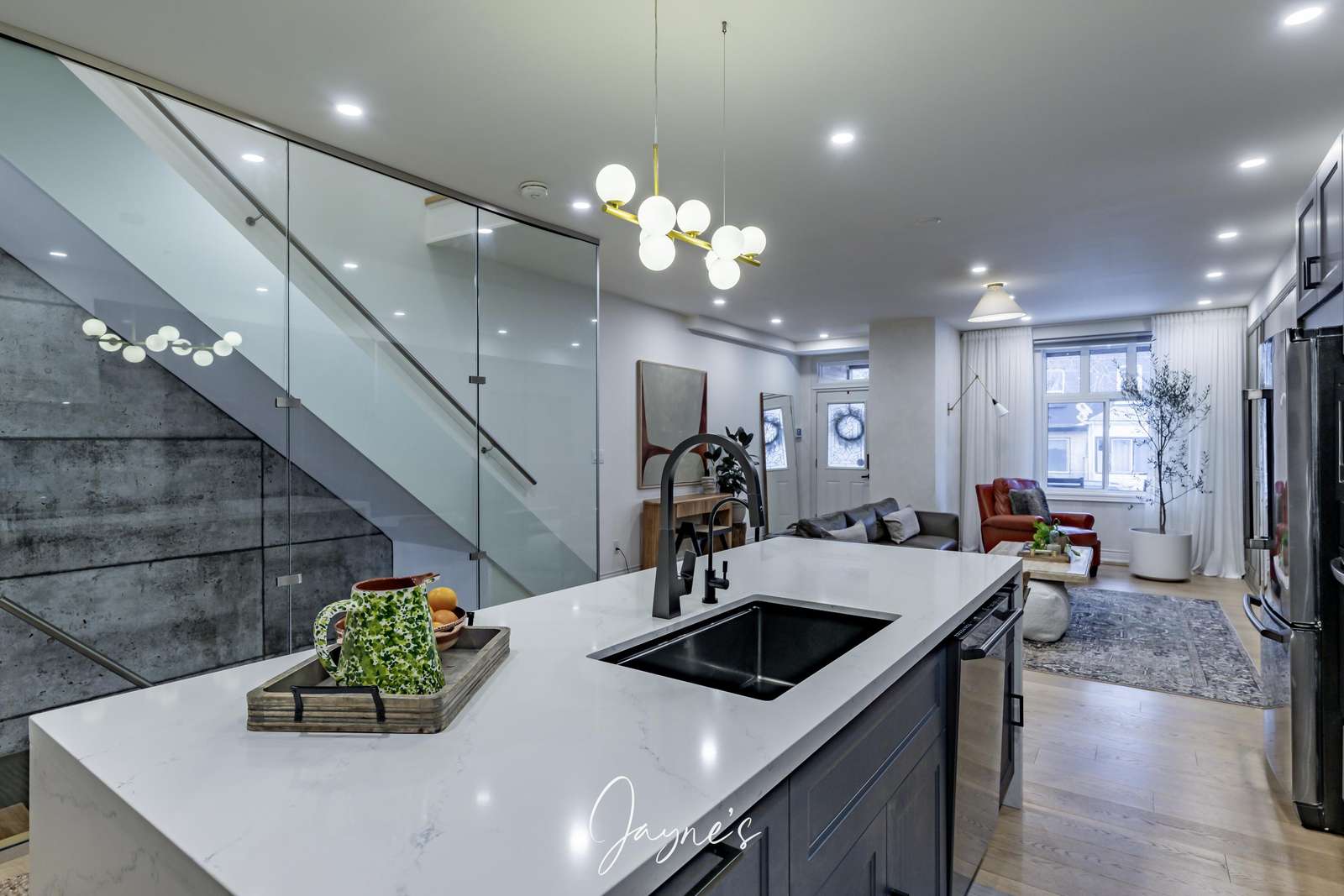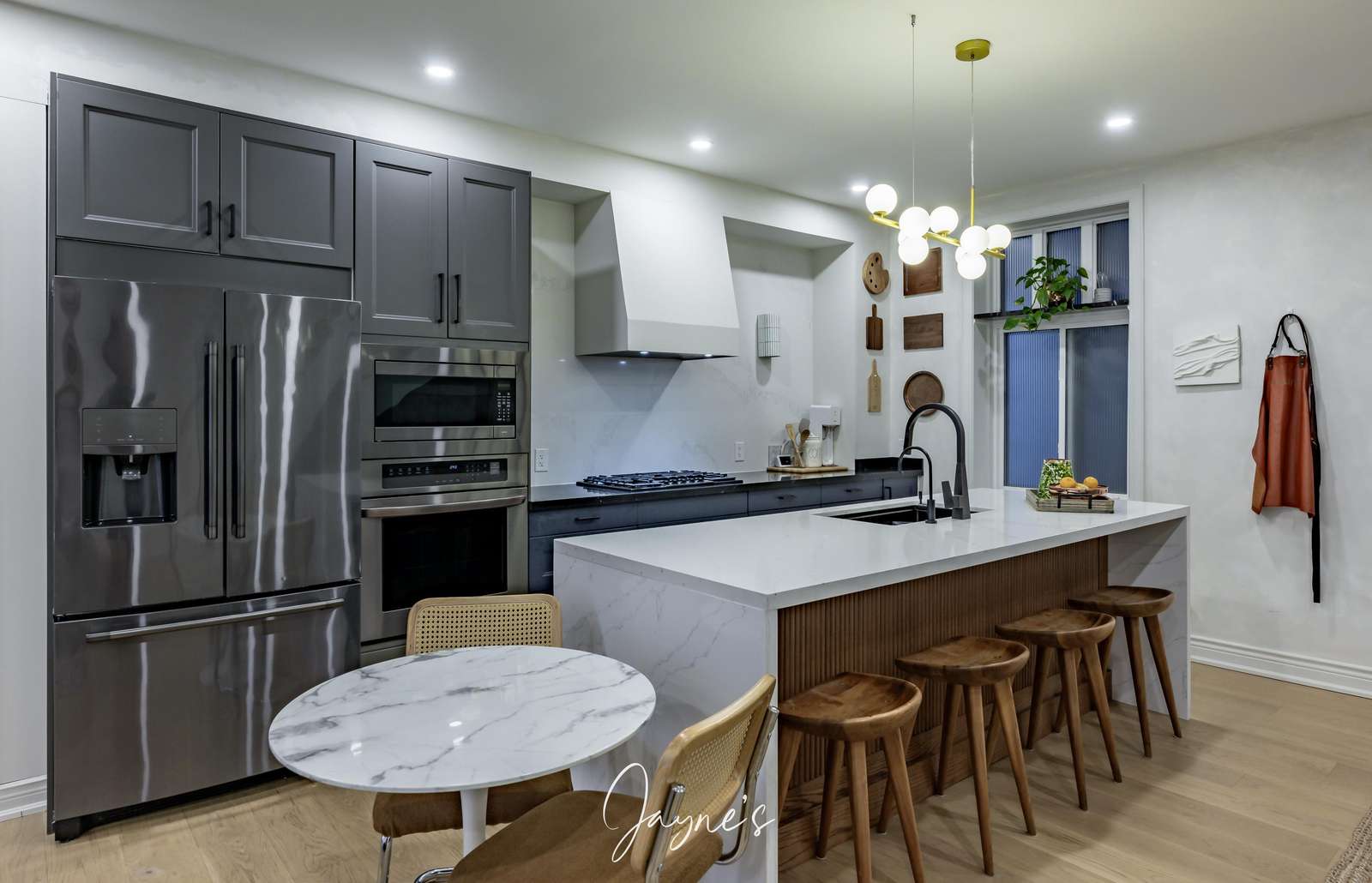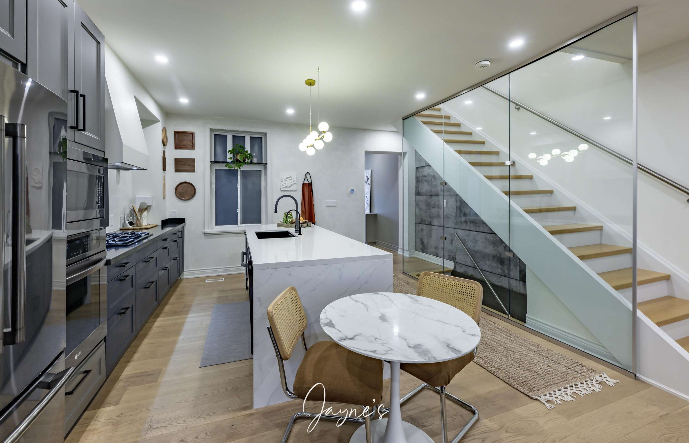 Newly renovated kitchen with white marble waterfall island with seating for 4 and sleek appliances. Also extra table for 2, for morning coffee or end of day catch ups.