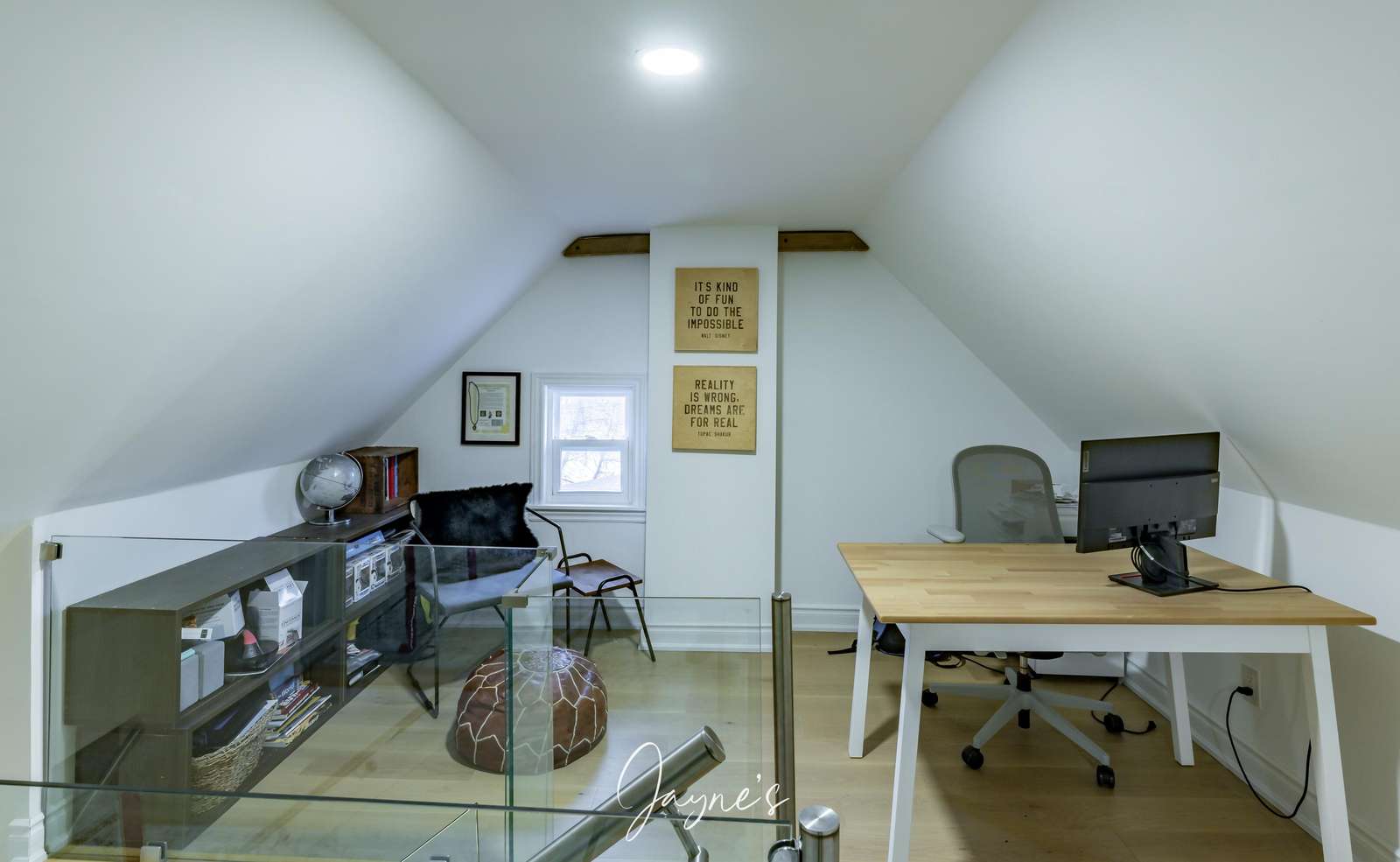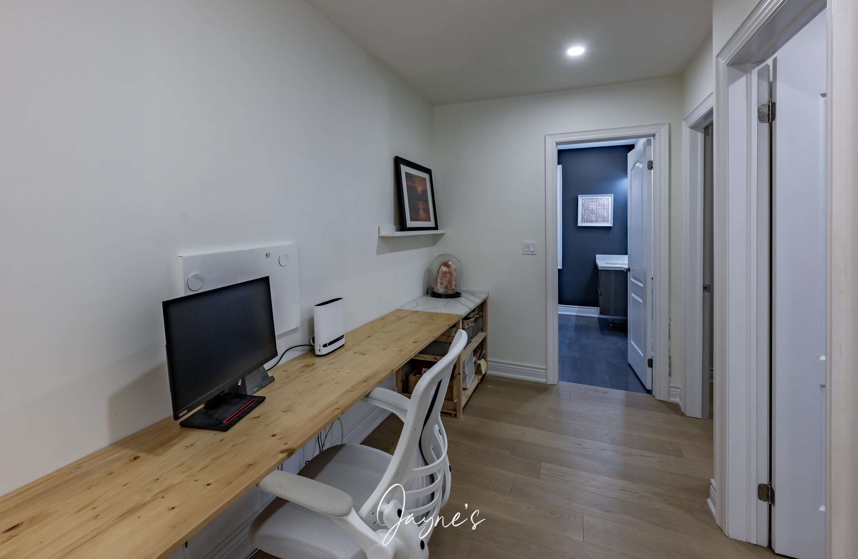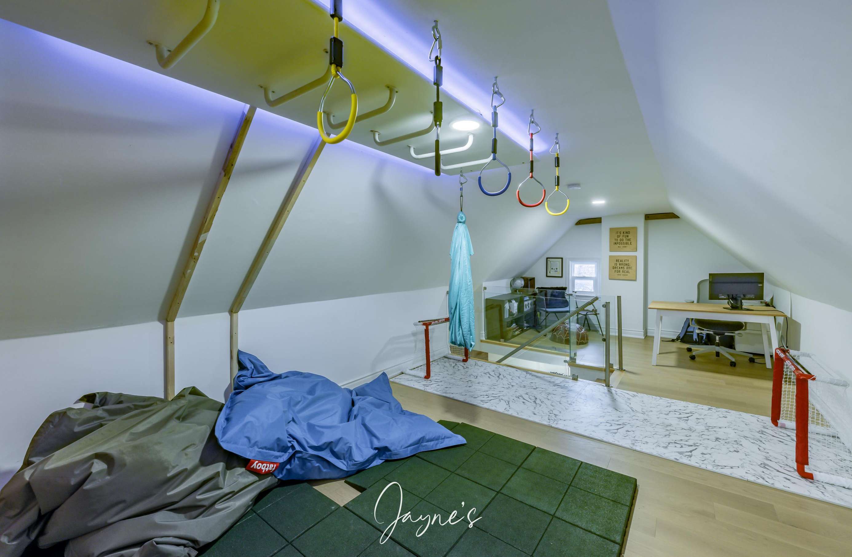 Office area with desk and playroom for children