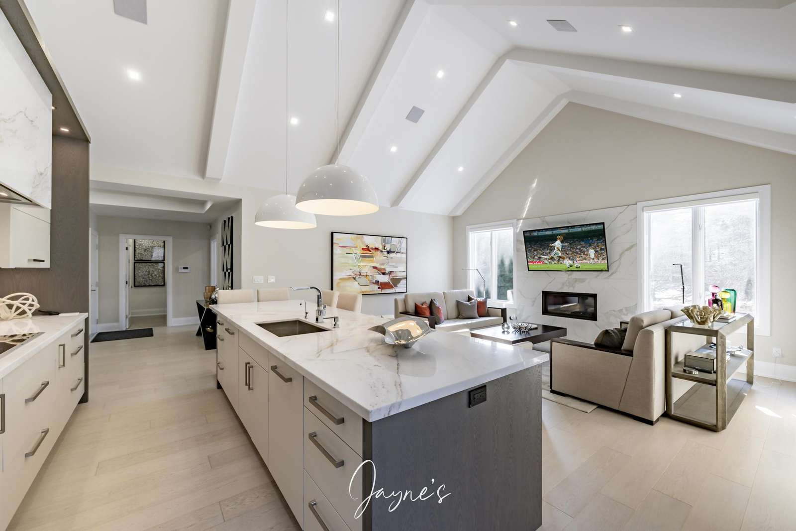 Large airy eat in kitchen. Large island that can seat 4 comfortably. High end appliances. Open concept with vaulted ceilings great room with ample comfortable seating and Large smart TV over gas fireplace.