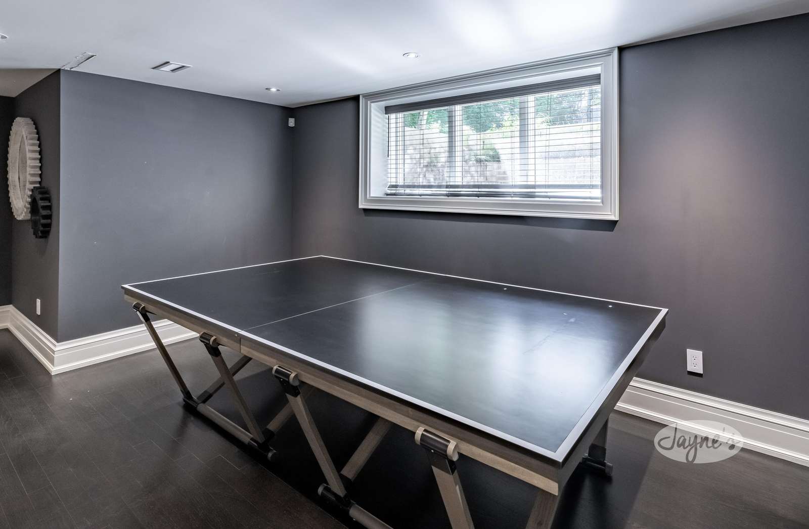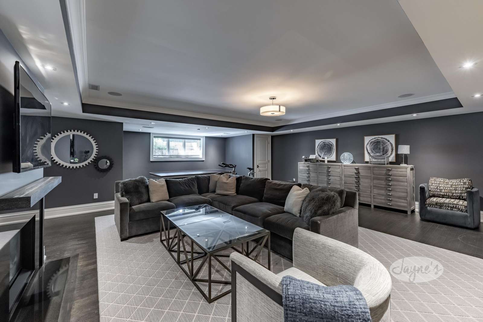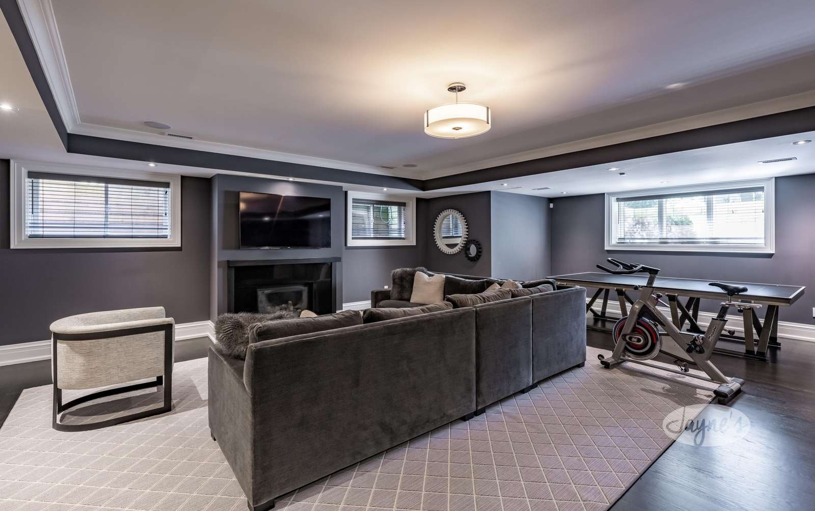 The rec room offers a large sectional couch and includes a gas fireplace, TV, spin bike, and ping-pong table.