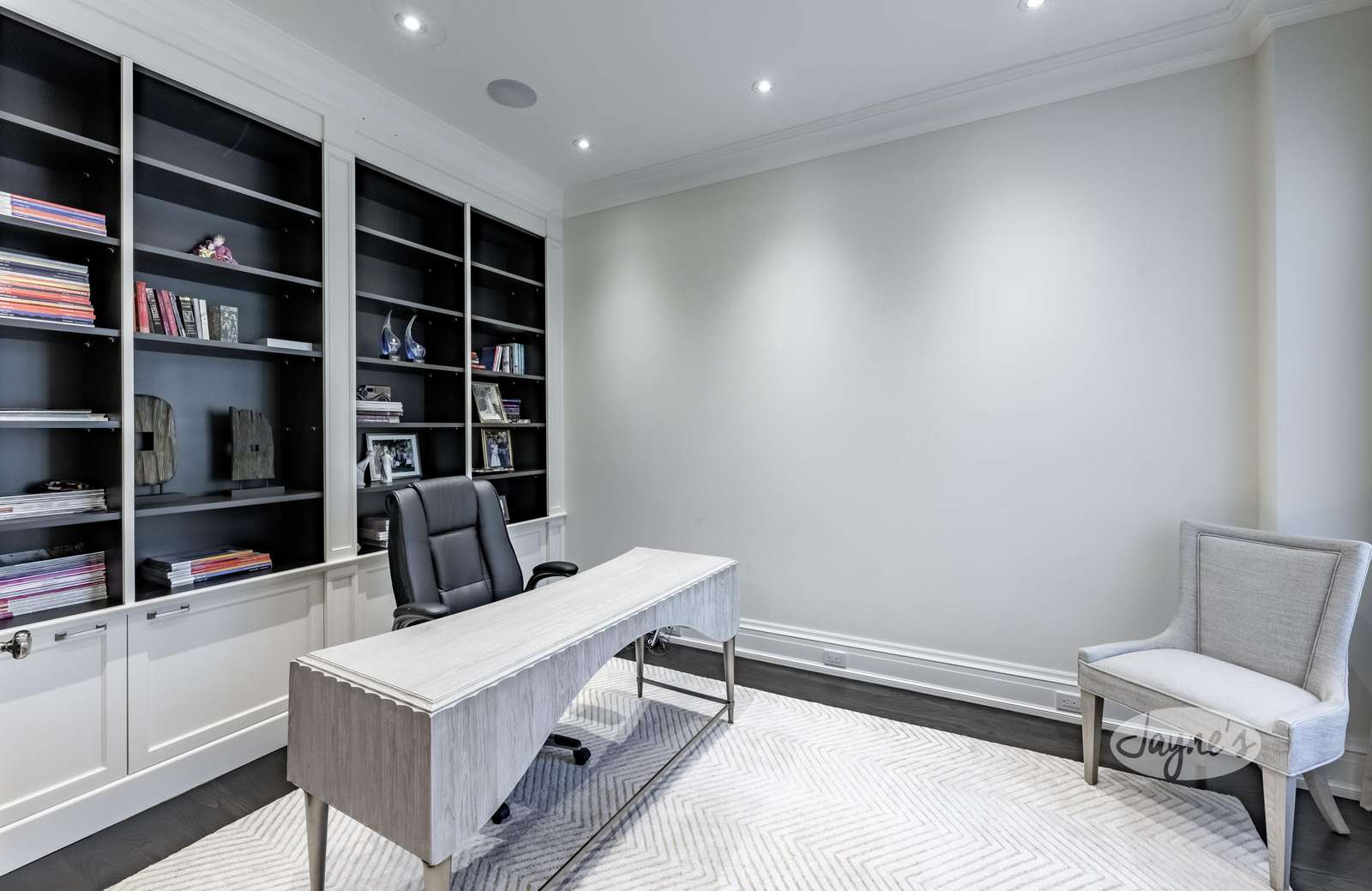 A sophisticated office space with French doors and large north-facing windows offers a desk and leather chair perfect for focused work.