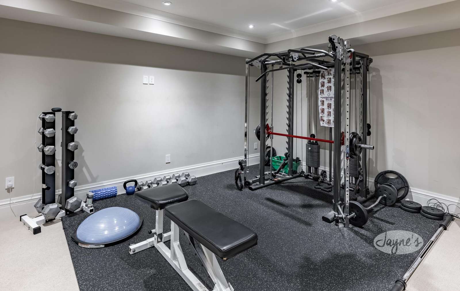 Workout at home with free weights, workout bench and cable system gym rack.