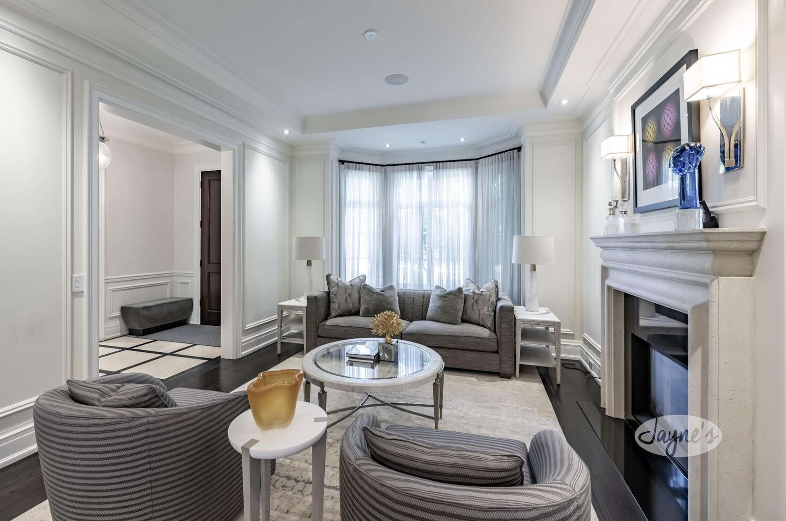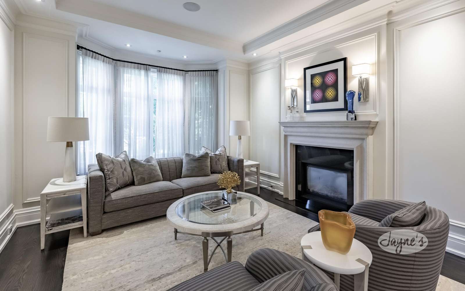 A luxurious living room welcomes you with a gas fireplace and comfortable 3-seater couch and 2 club chairs. A large bay window provides plenty of natural light.