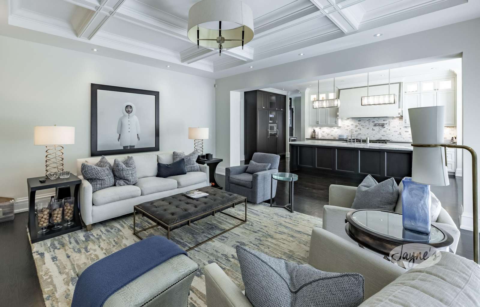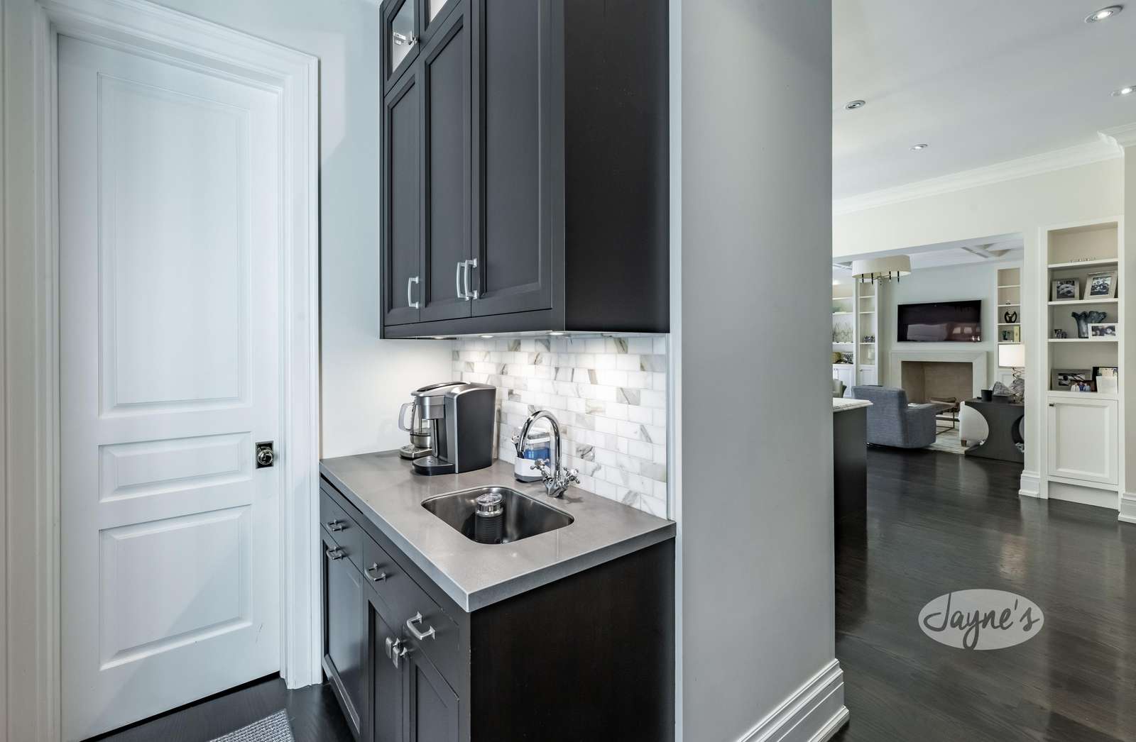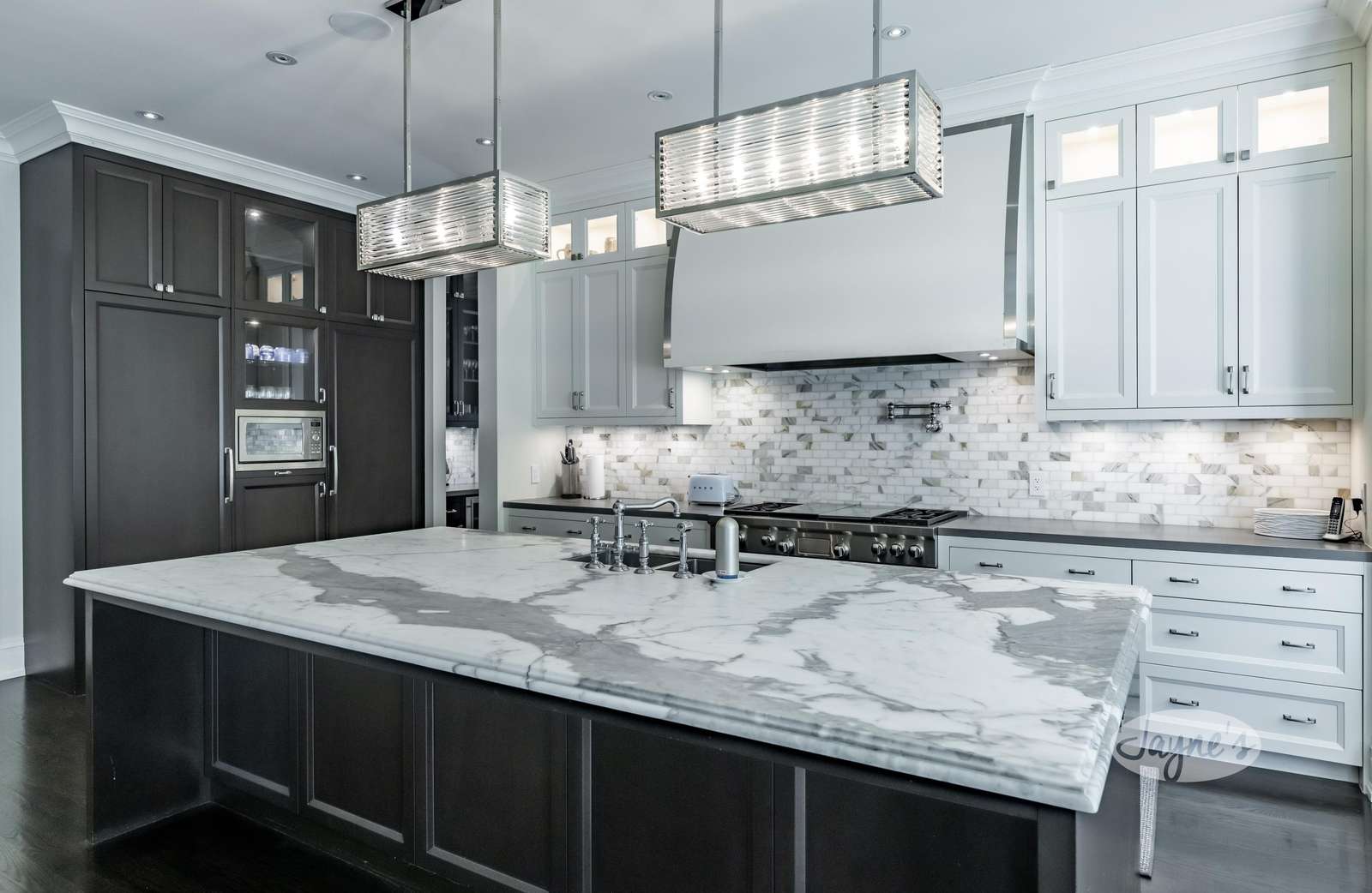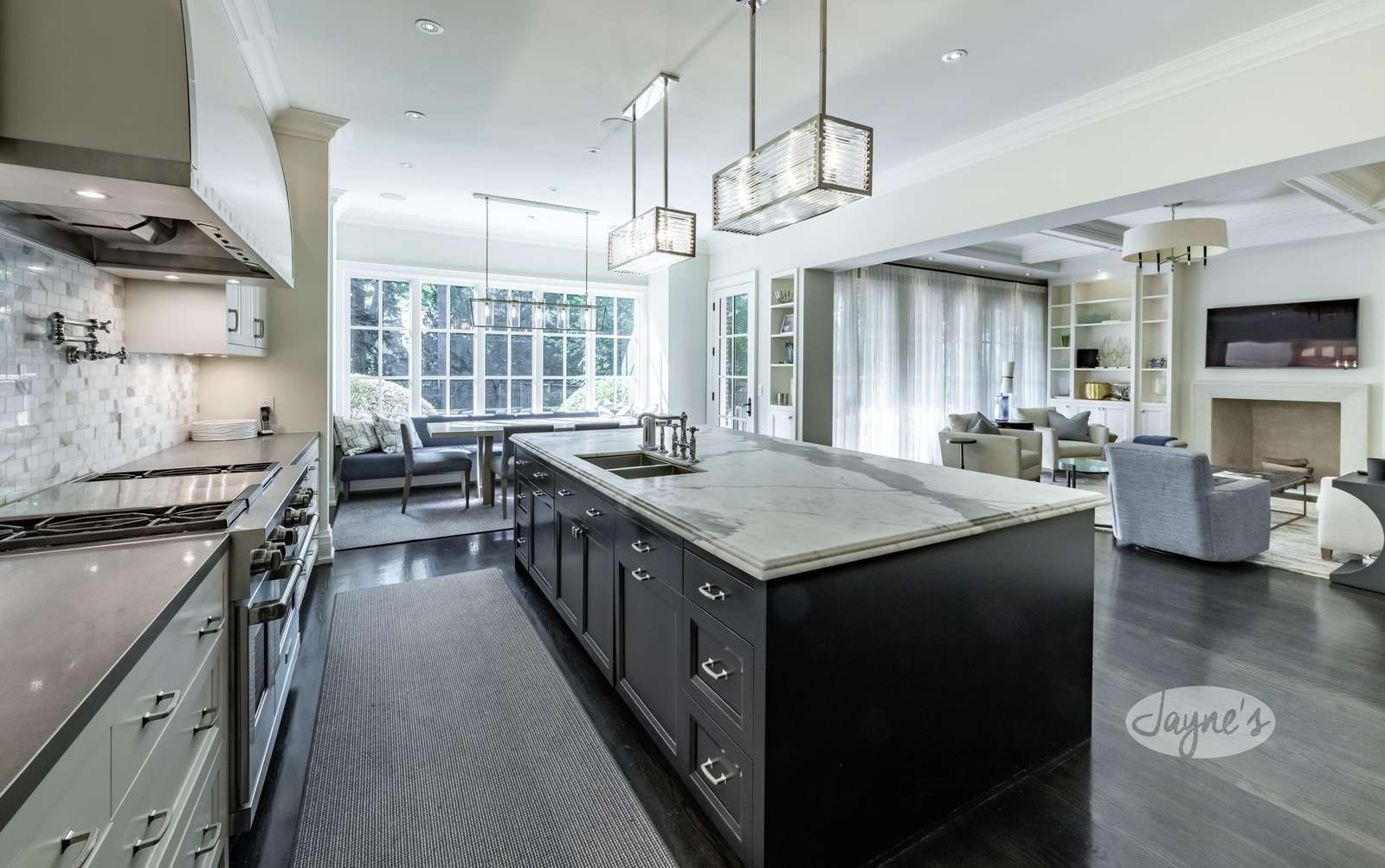 Open concept with ample cupboard space. Luxurious marble counter tops including the over sized island. High-end stainless steel appliances including large fridge, Wolf oven and gas range, pot filler faucet, dishwasher, and microwave. A coffee bar with second sink offers additional pantry space. The breakfast nook with built-in upholstered banquetteΒ seating plus 5 chairs overlooks the backyard oasis. An additional open-concept living space opposite the kitchen offers 3 arm chairs, couch and TV also includes French-doors with a walk-out to the stone deck.