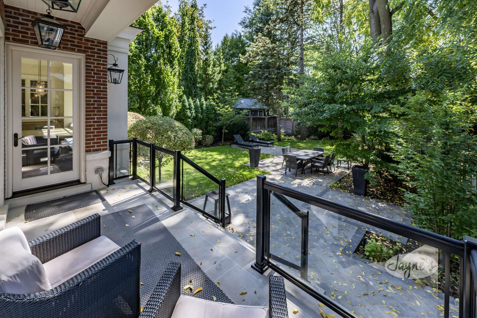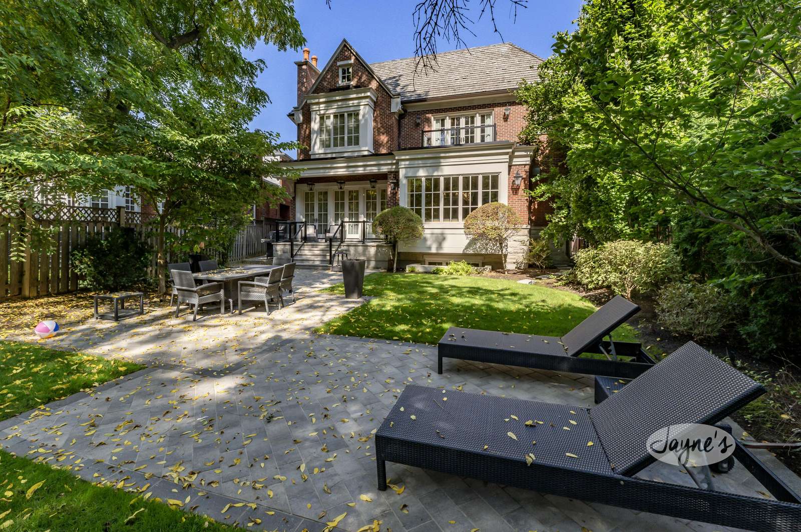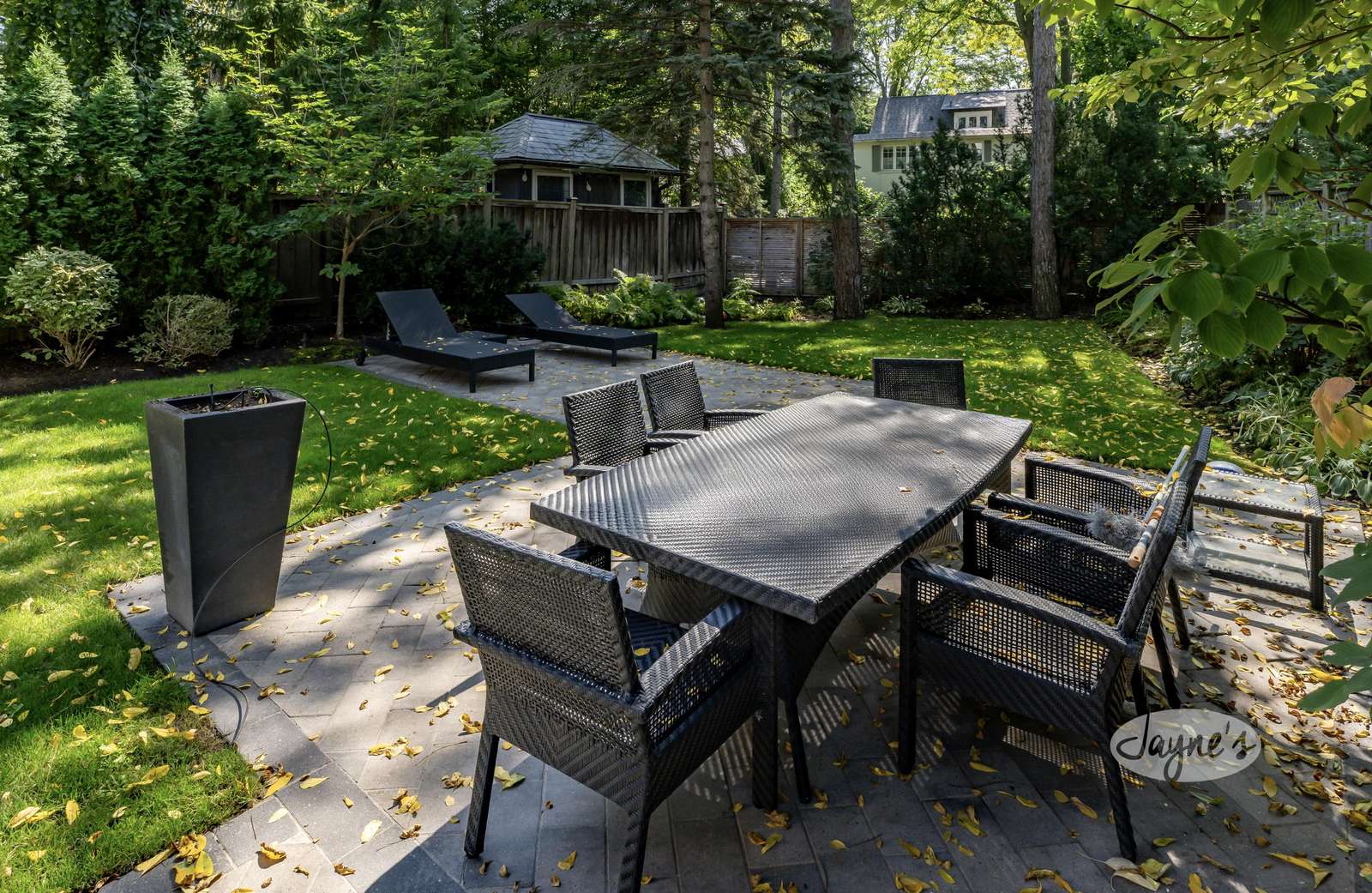 The private backyard offers a tranquil outdoor escape with plenty of lush greenery and a landscaped garden perfect for both entertaining and unwinding. The walk-out from the kitchen offers a stone deck with 2 arm chairs. A few steps below youβll find the BBQ and the spacious stone patio perfect for outdoor dining, complete with a table and chairs for 6. 2 additional lounge chairs provide an ideal spot for relaxation and sunbathing in the summer. Tall trees and manicured shrubs create a peaceful, shaded atmosphere.
