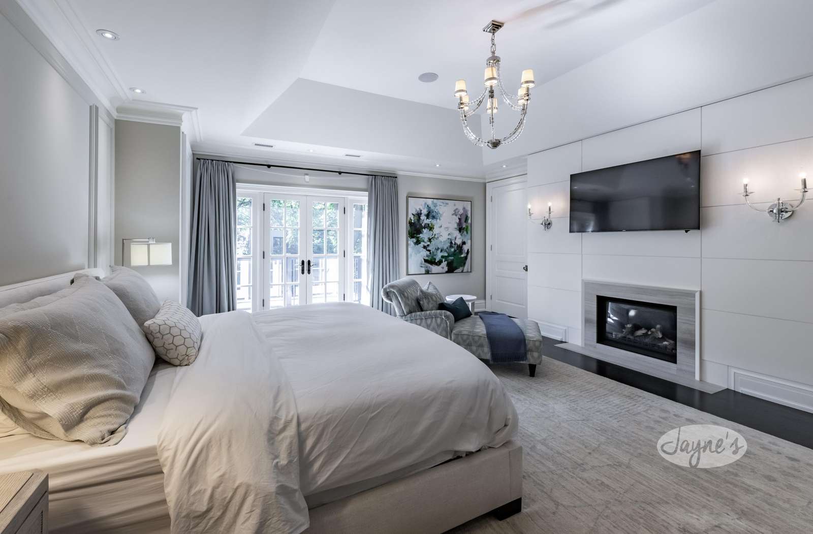 Bedroom 1 - King (Primary) with ensuite, TV, gas fireplace, sitting area, walk-in closet and French door walk-out to charming upper deck.