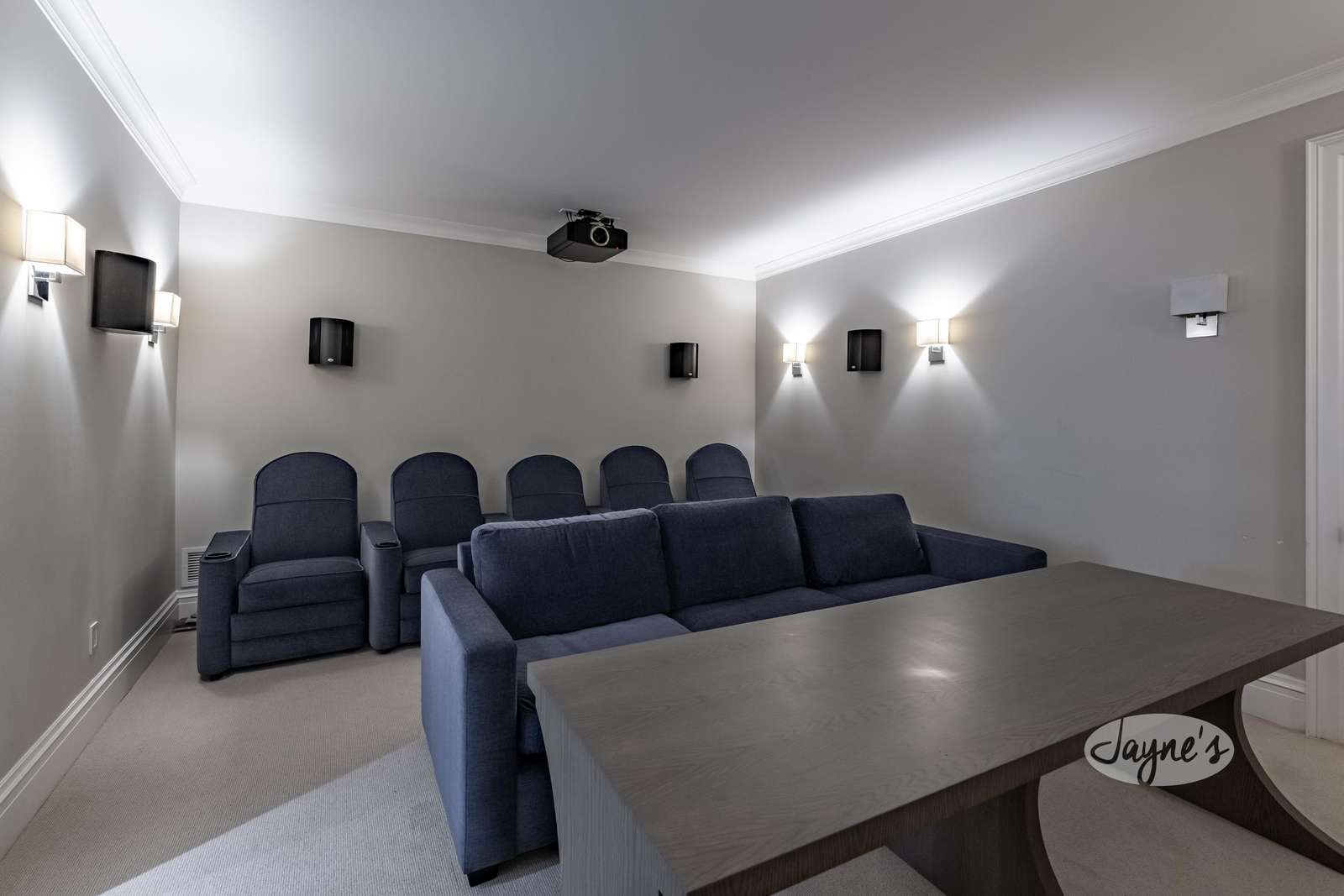 Choose from 5 cinema reclining chairs or large couch to enjoy entertainment from the projector screen and surround sound system.