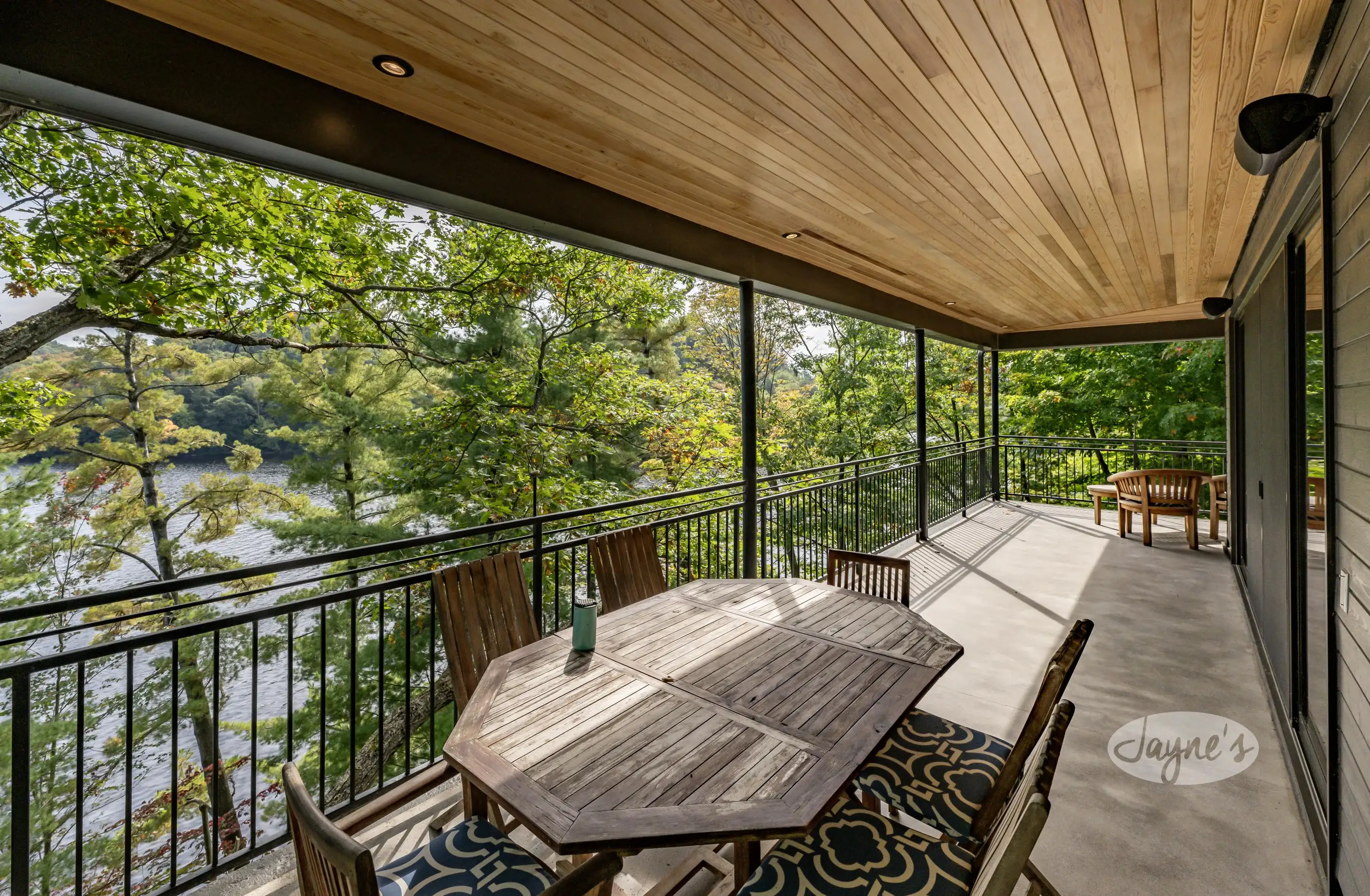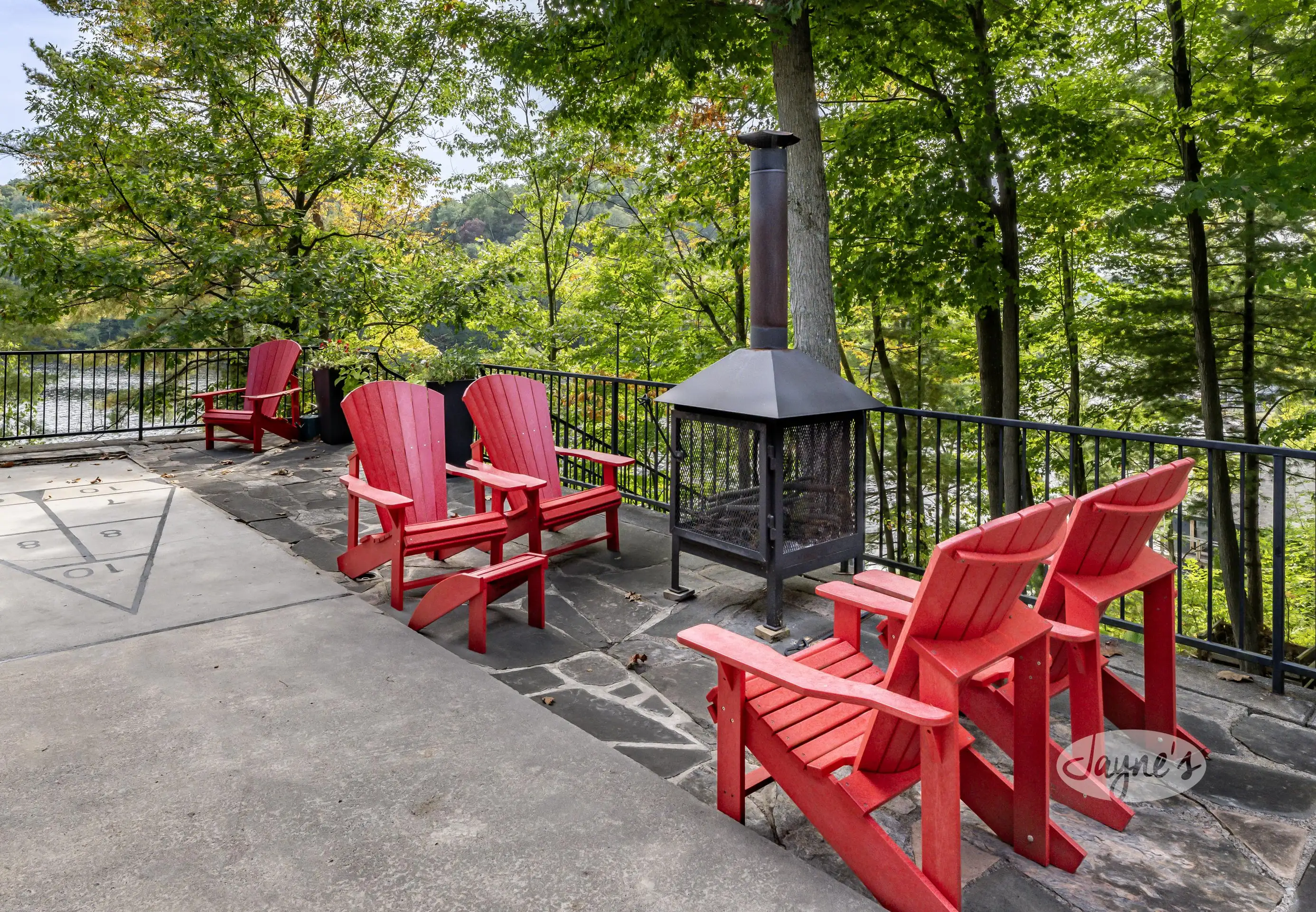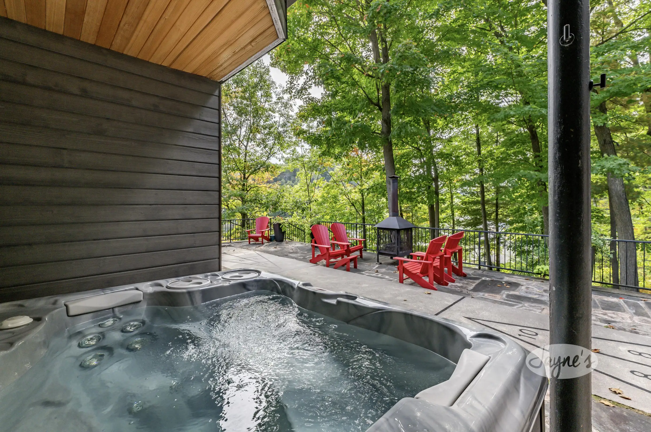 Stunning elevated South views from the upper and lower covered patios which wrap around 3 sides of the building. Multiple seating arrangements for outdoor dining and conversation. Lounging area with seating for 6 around a fire table, dining table for 6 on both upper and lower level, hot tub on lower level just outside the indoor salt water pool with quick access to indoor shower and sauna. Back on the patio, a large open area for fun in the sun during shuffleboard or evening fires at the portable wood burning fire pit with 4 Muskoka chairs. Approximately 20 steps lead down to the water. Large dock with lounger, 4 Muskoka chairs and umbrella.