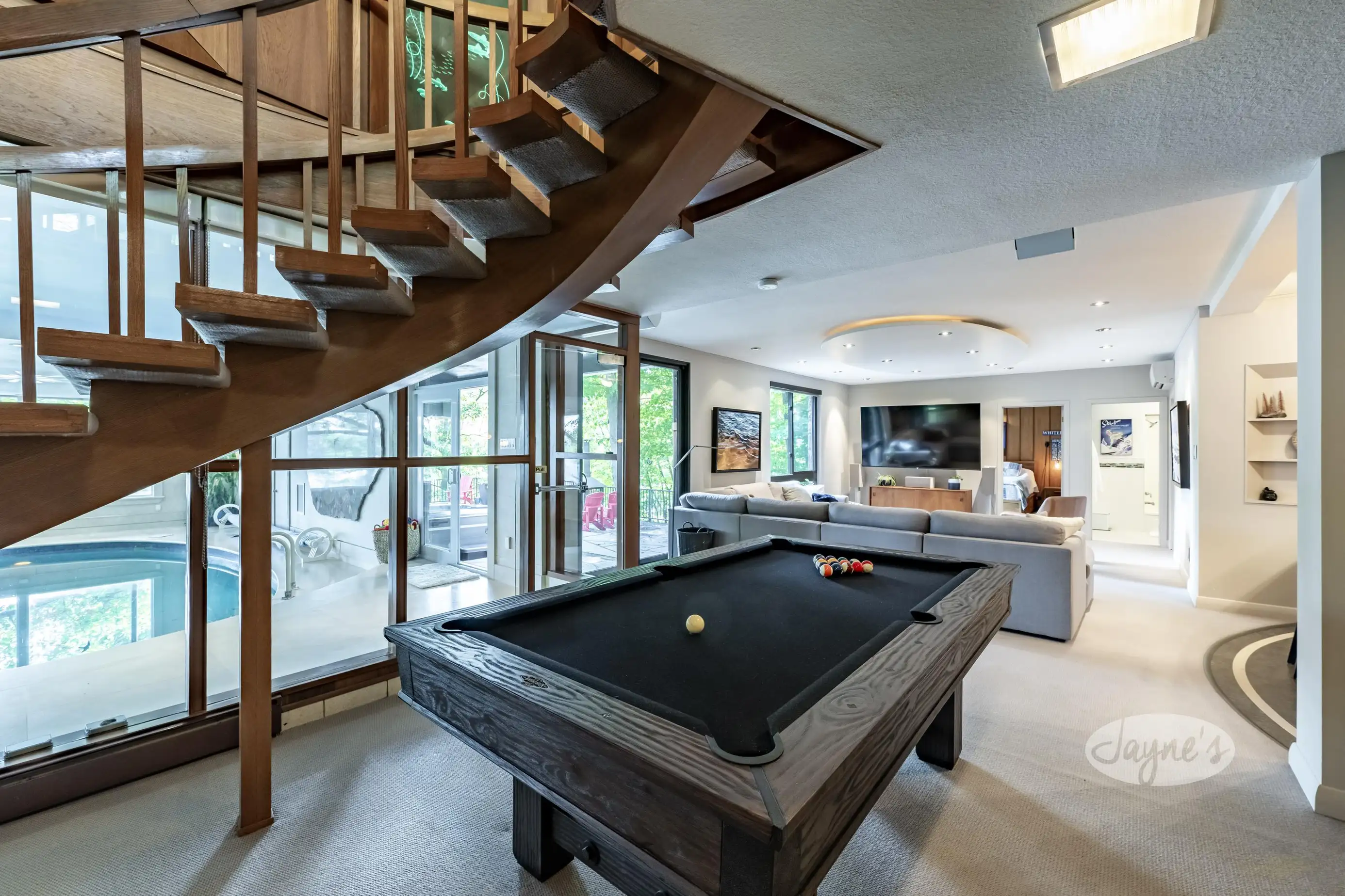 The fun room! Have a game of pool, or ping pong, or go for a dip in the salt water indoor pool, or decompress in the cedar lined sauna. Steam room and shower in the same area. Back in the recreation room, settle in the large sectional sofa and watch your favourite movie on the large screen TV, or saddle up to the wet bar to enjoy a cocktail. Bar has everything you need, mini fridge, ice machine, sink and a kegerator. Patio access to the outdoor patio for built in large scale shuffle board, hot tub, and plenty of outdoor seating to take in the lake views.