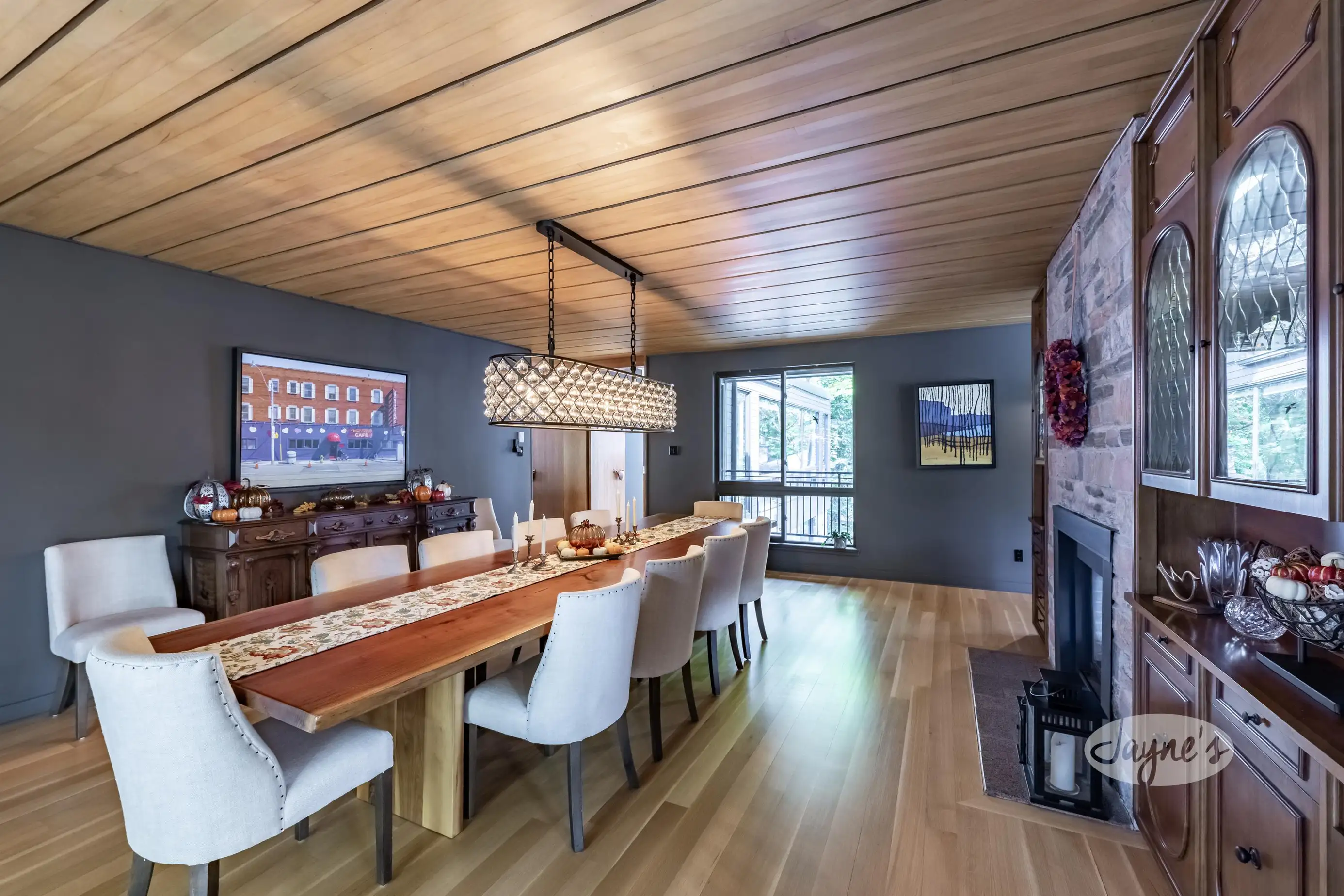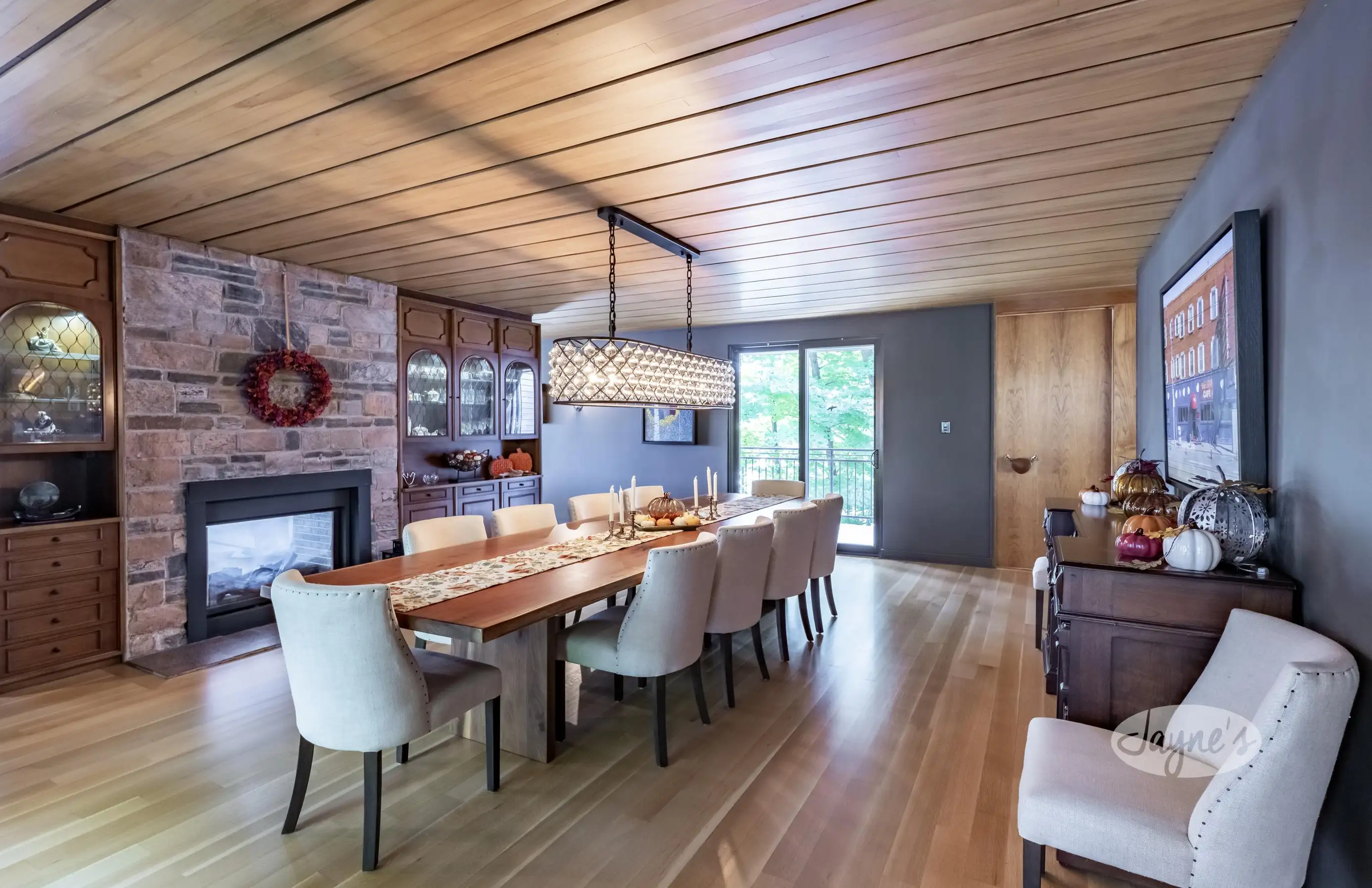 An elegant room designed for entertaining large gatherings in a formal setting. Table seats 10-12 people easily. Patio door access to outdoor balcony and a double sided gas fireplace shared with the Living Room.