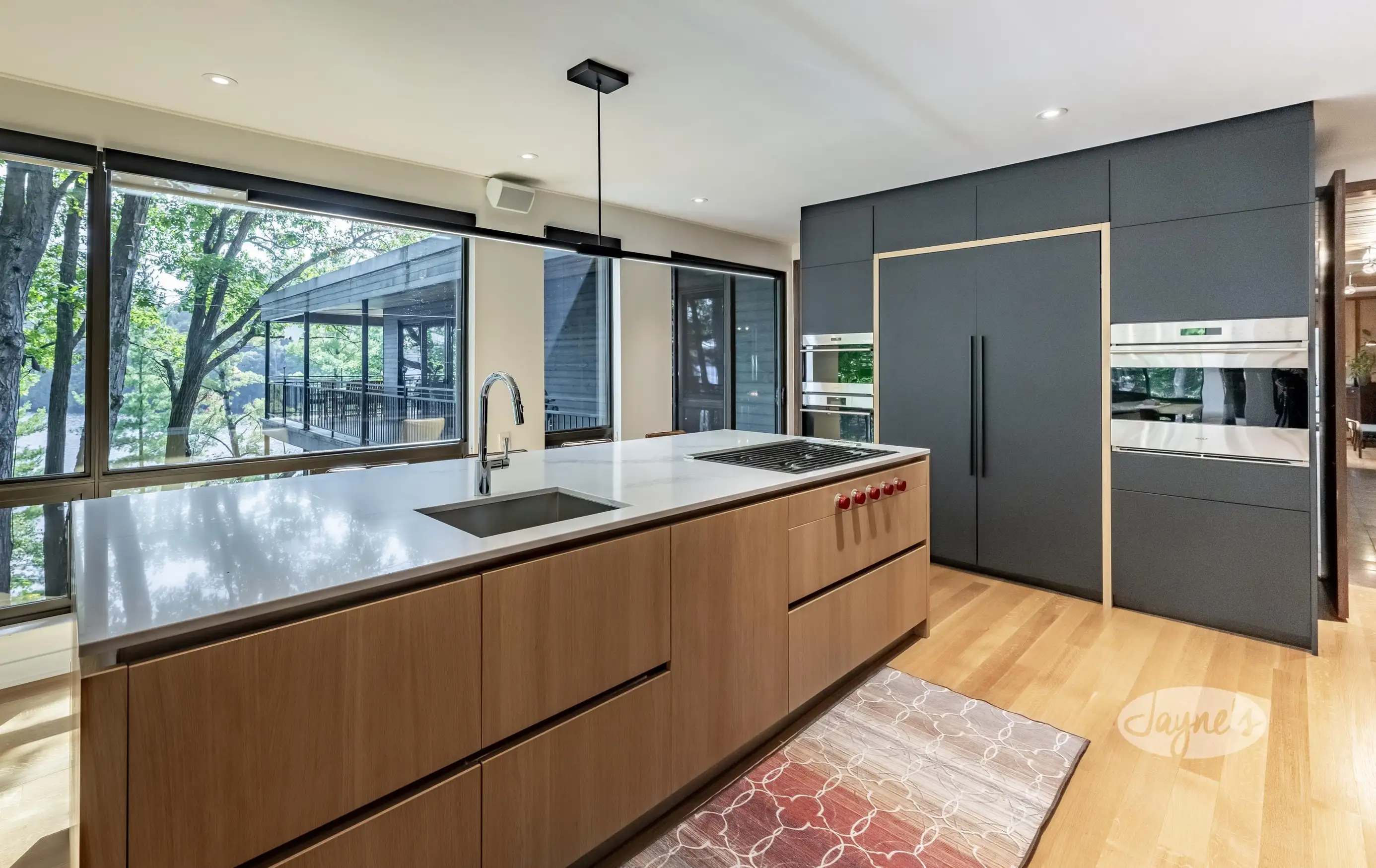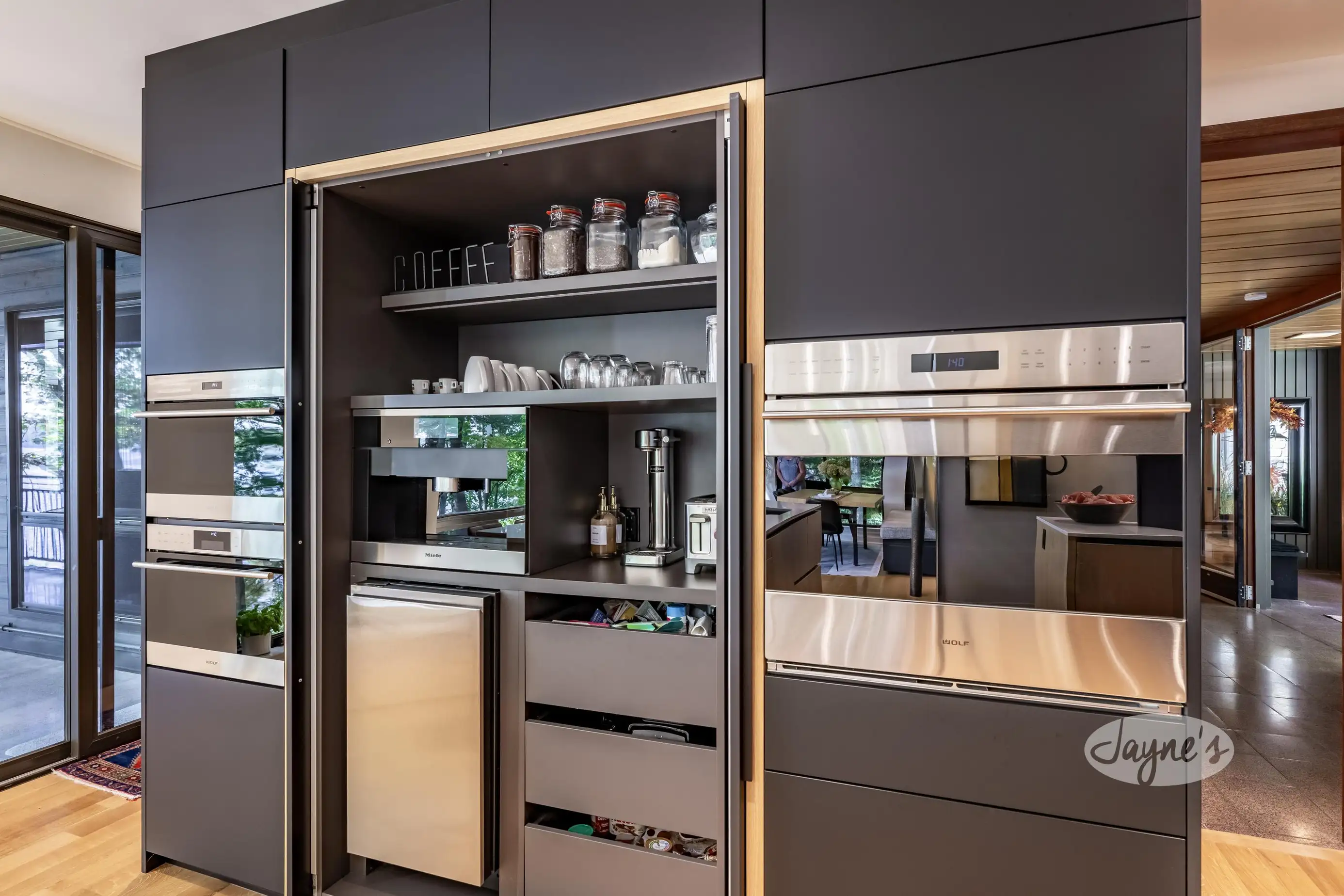 Enjoy the lake view through the full wall of windows. The eat-in kitchen offers banquet seating around the kitchen table, plus 5 chairs. Plenty of room for multiple cooks, 2 large islands, with bar seating for 4. Sub-zero fridge and freezer, hidden pantry, wolf gas stove, wolf wall oven, microwave and induction oven. Bosch dishwasher x2, mini fridge at the Miele coffee station. Quick and easy access to the direct gas line BBQ.