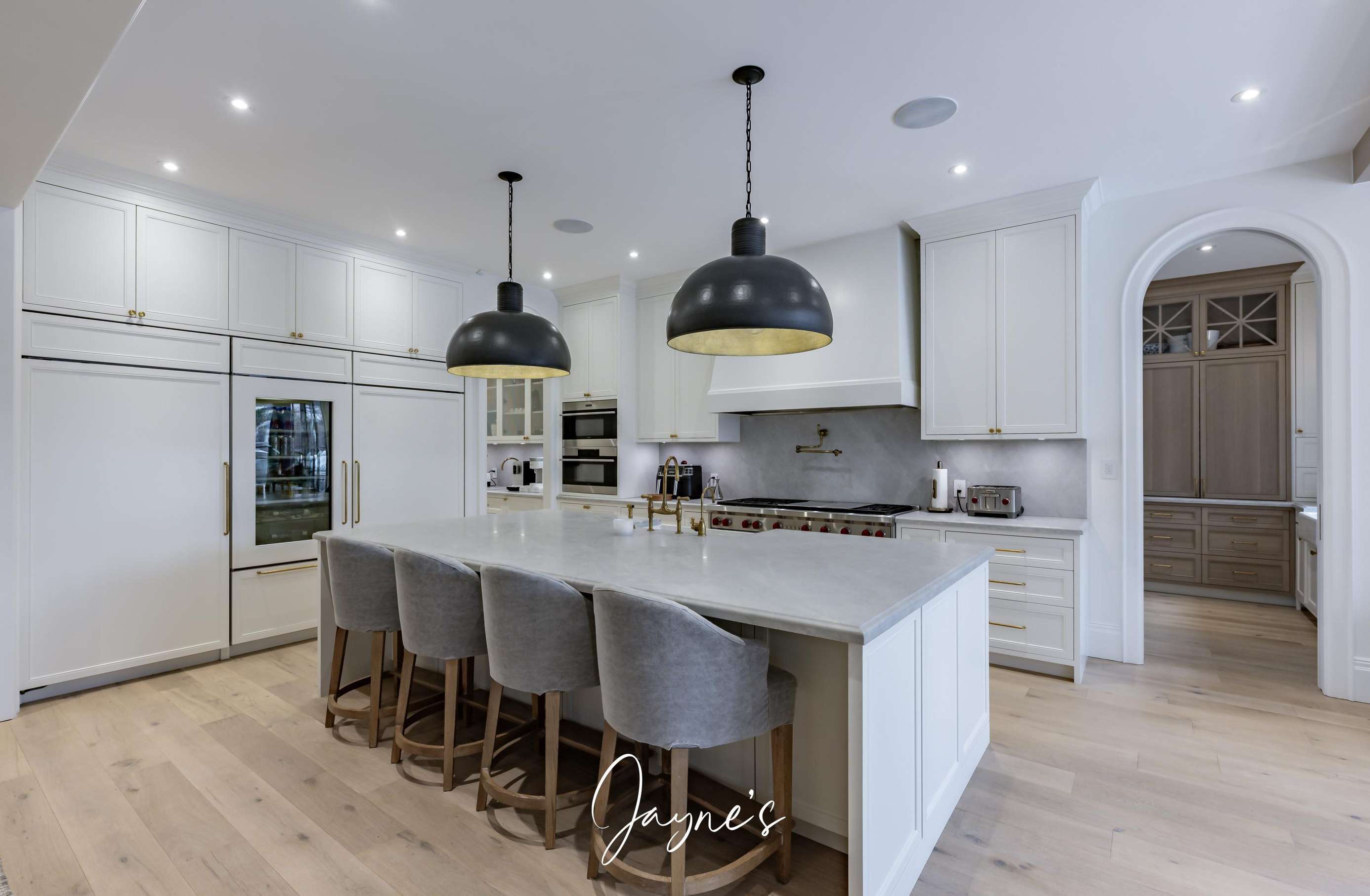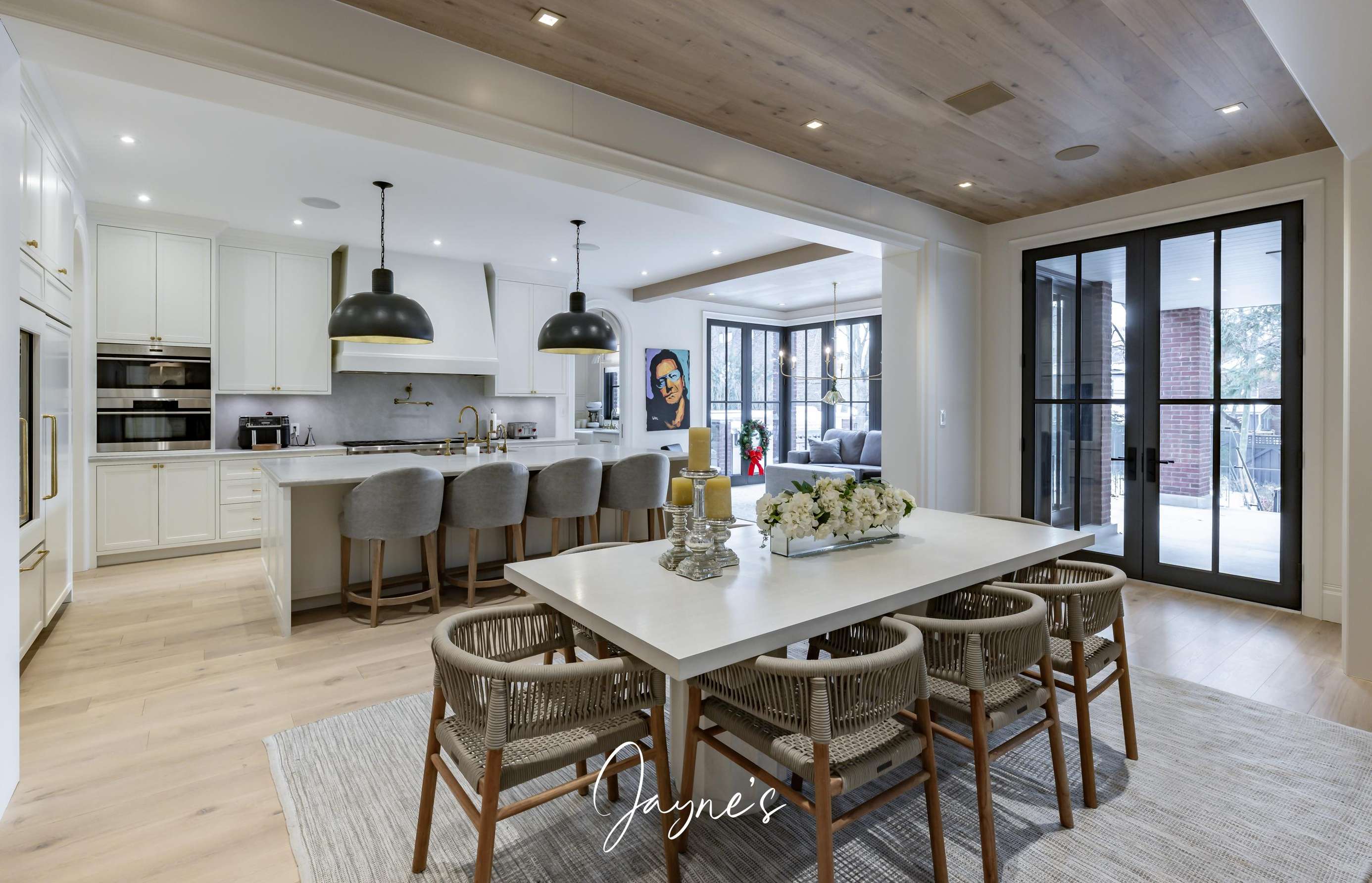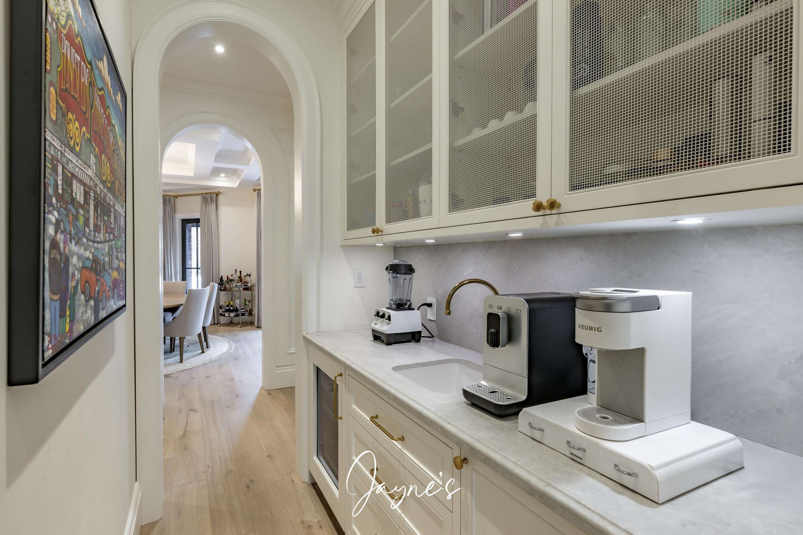 Magnificent open-concept kitchen featuring a large island with seating for four beneath two pendant lights. High-end appliances adorn the kitchen, including wall ovens and an 6-burner gas stove with a griddle. Two dishwashers, three ovens (1 steam convection wall oven and 2 ovens below gas stove) and a fridge/freezer/wine fridge are seamlessly built into the cabinetry. For overflow, a butler's pantry connects the kitchen and formal dining room. It features a coffee bar, a second sink, and a mini fridge, and also an ice machine in the basement bar area. Adjacent to the kitchen is a sofa and TV as well as a dining table with seating for 8, with patio door access to the back terrace.