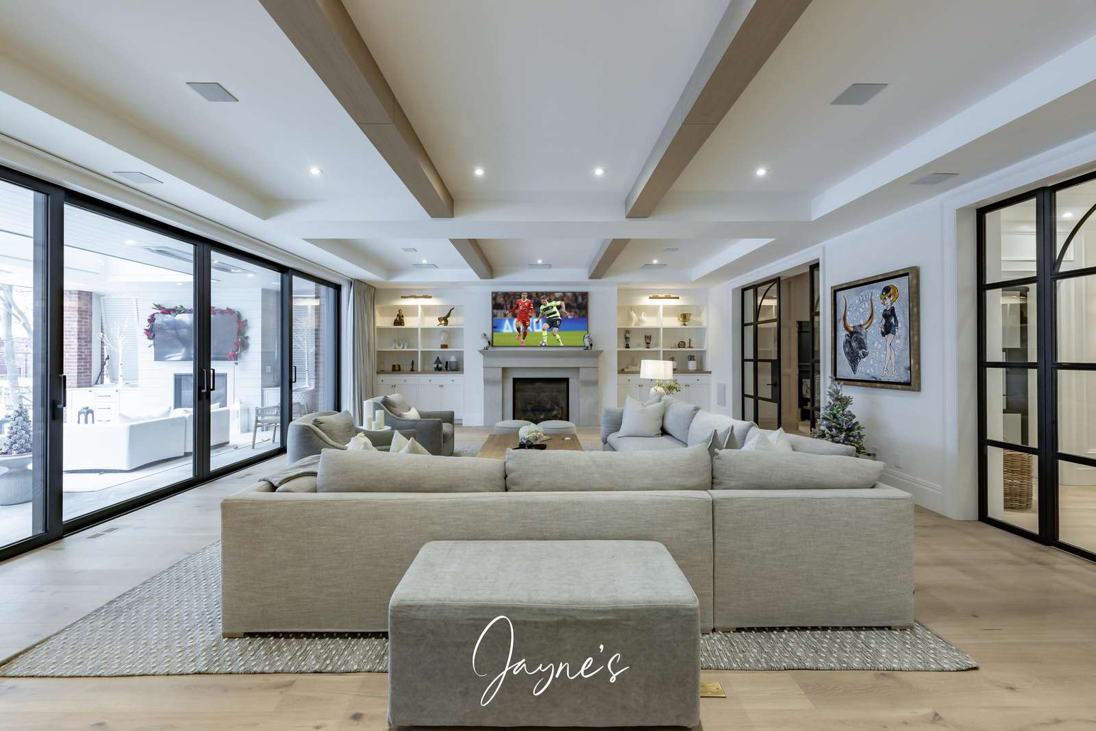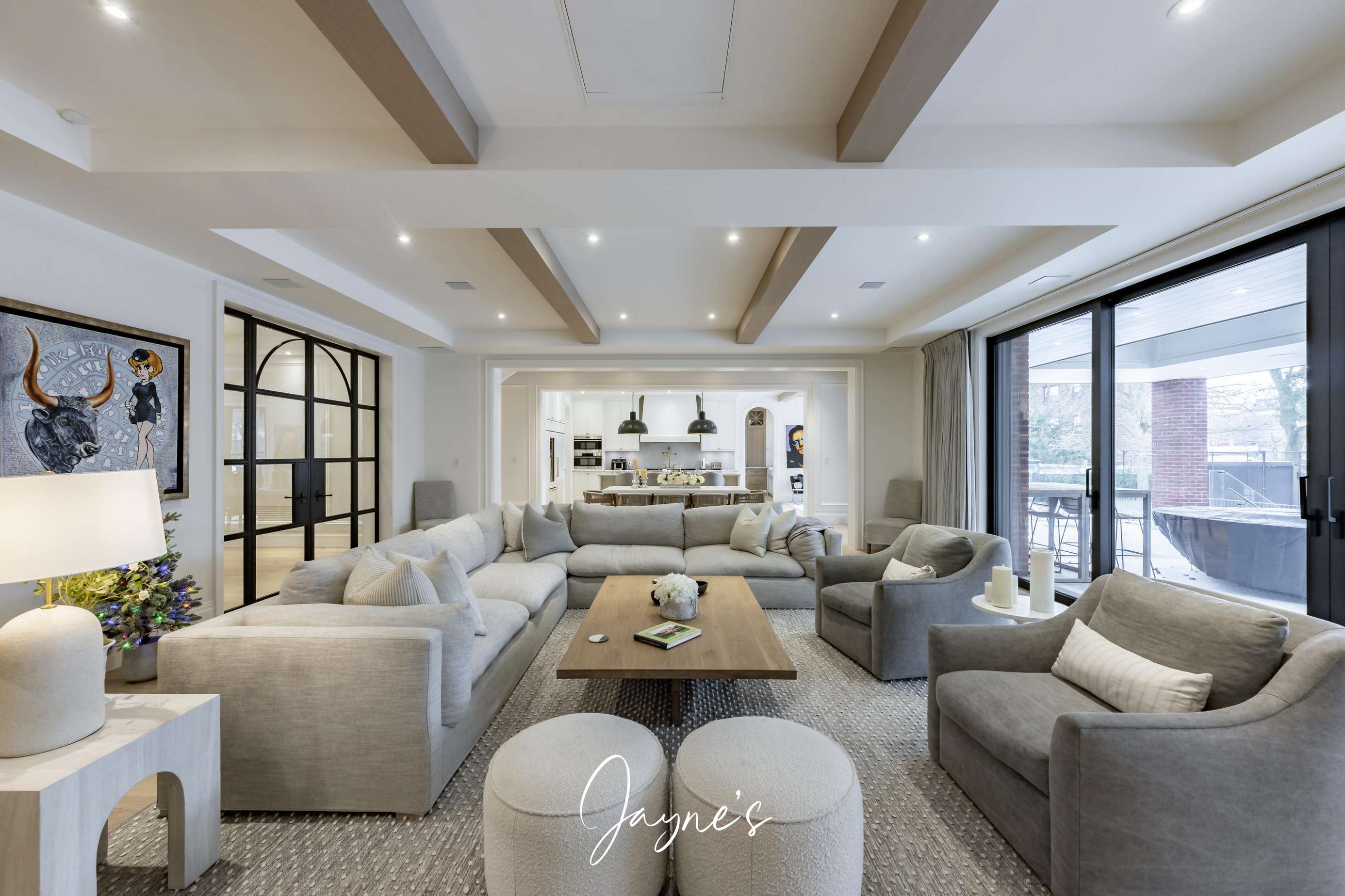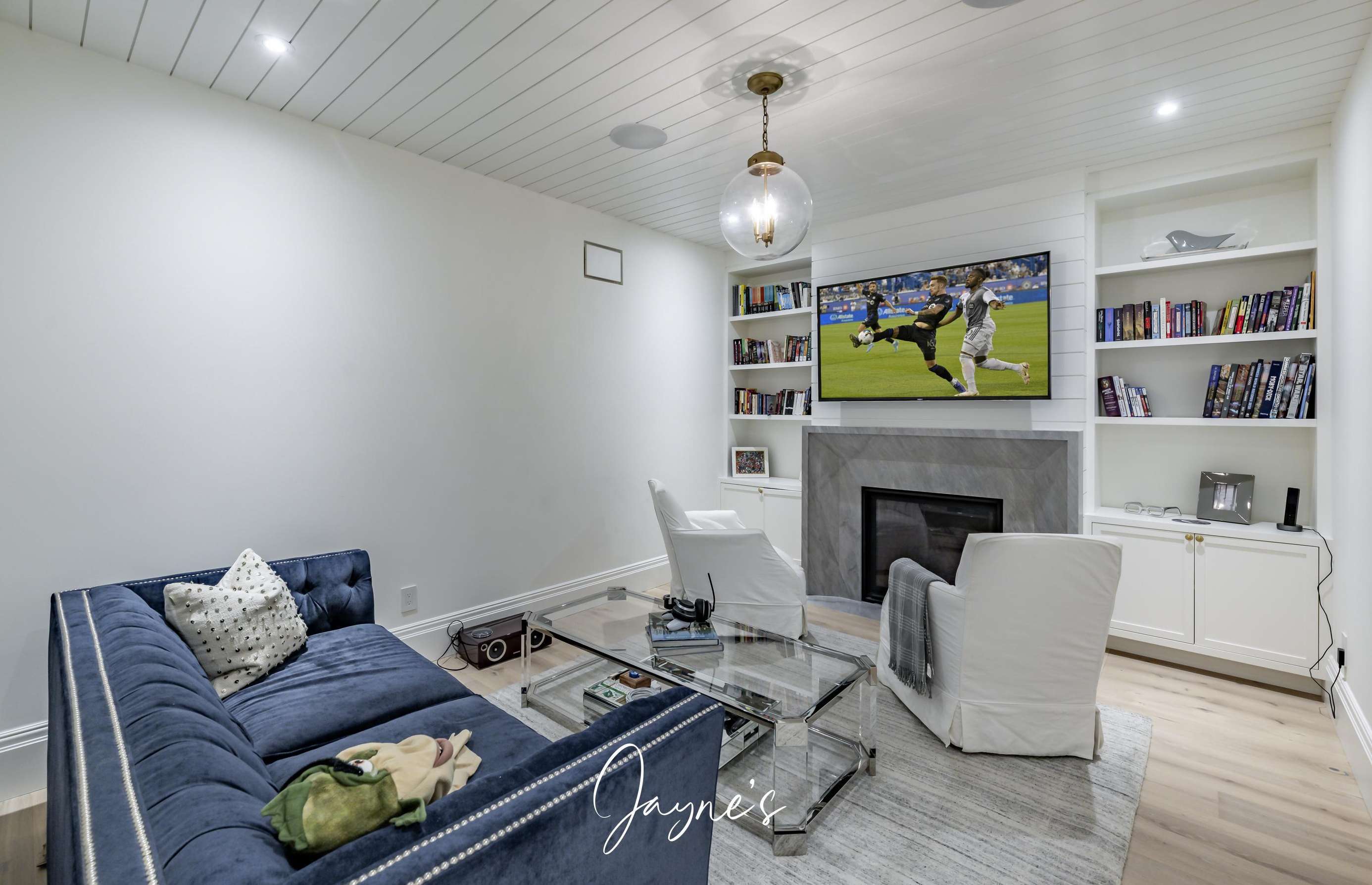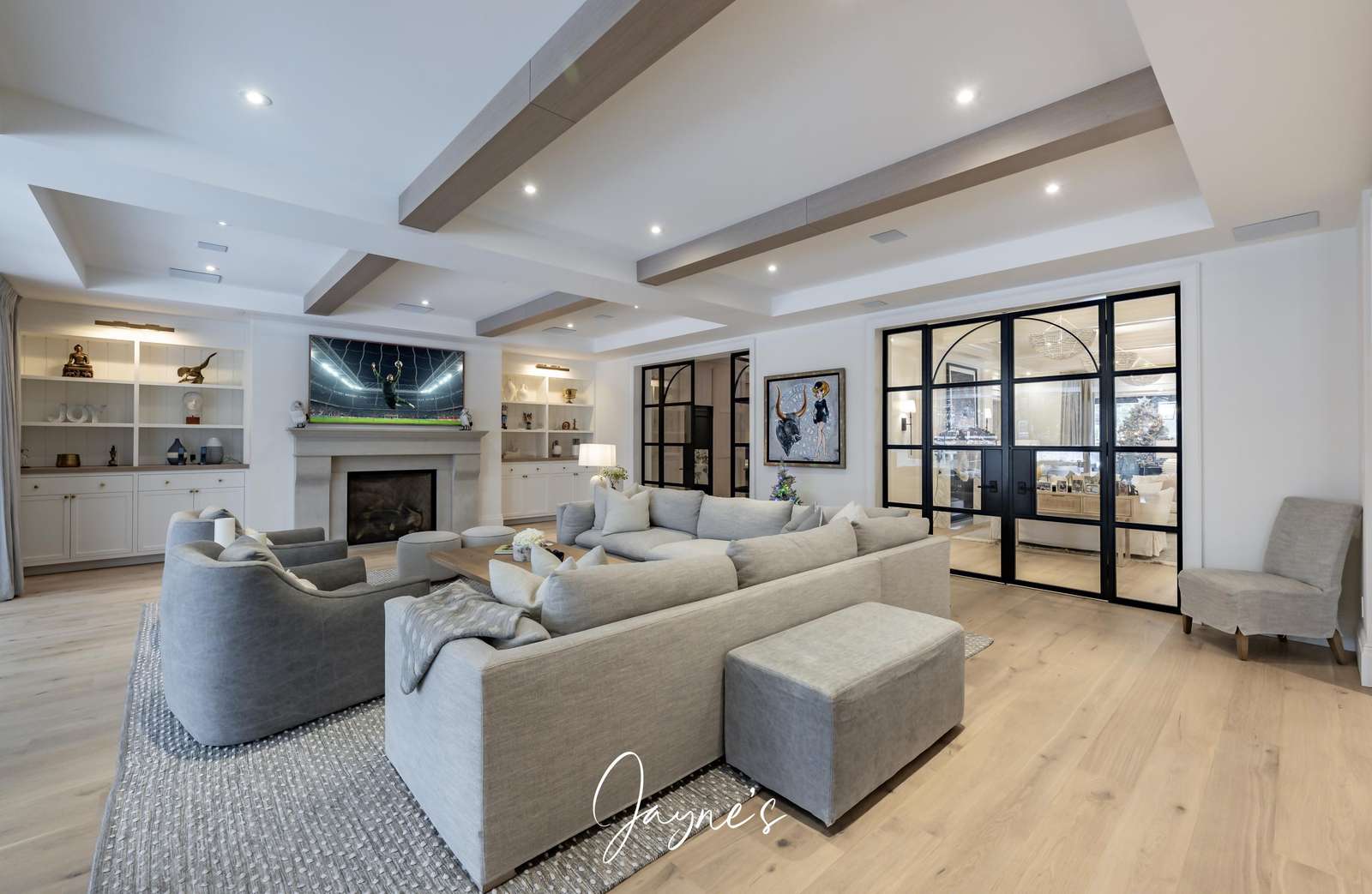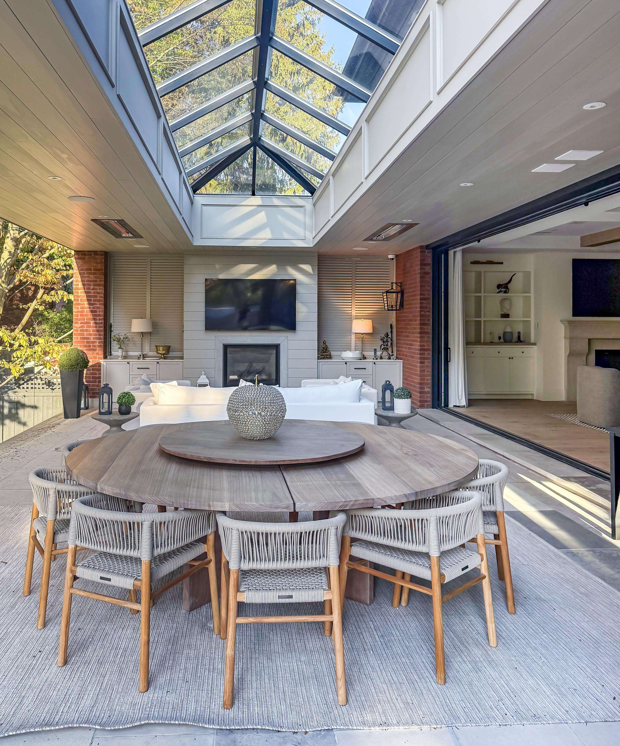 Features a gas fireplace and TV adorned by two built-ins on each side. Surrounded by plush seating, including two armchairs and an oversized sectional sofa. Accordion glass doors span the length of this room, and in the summer open up completely for a seamless transition between the Great Room and covered patio.